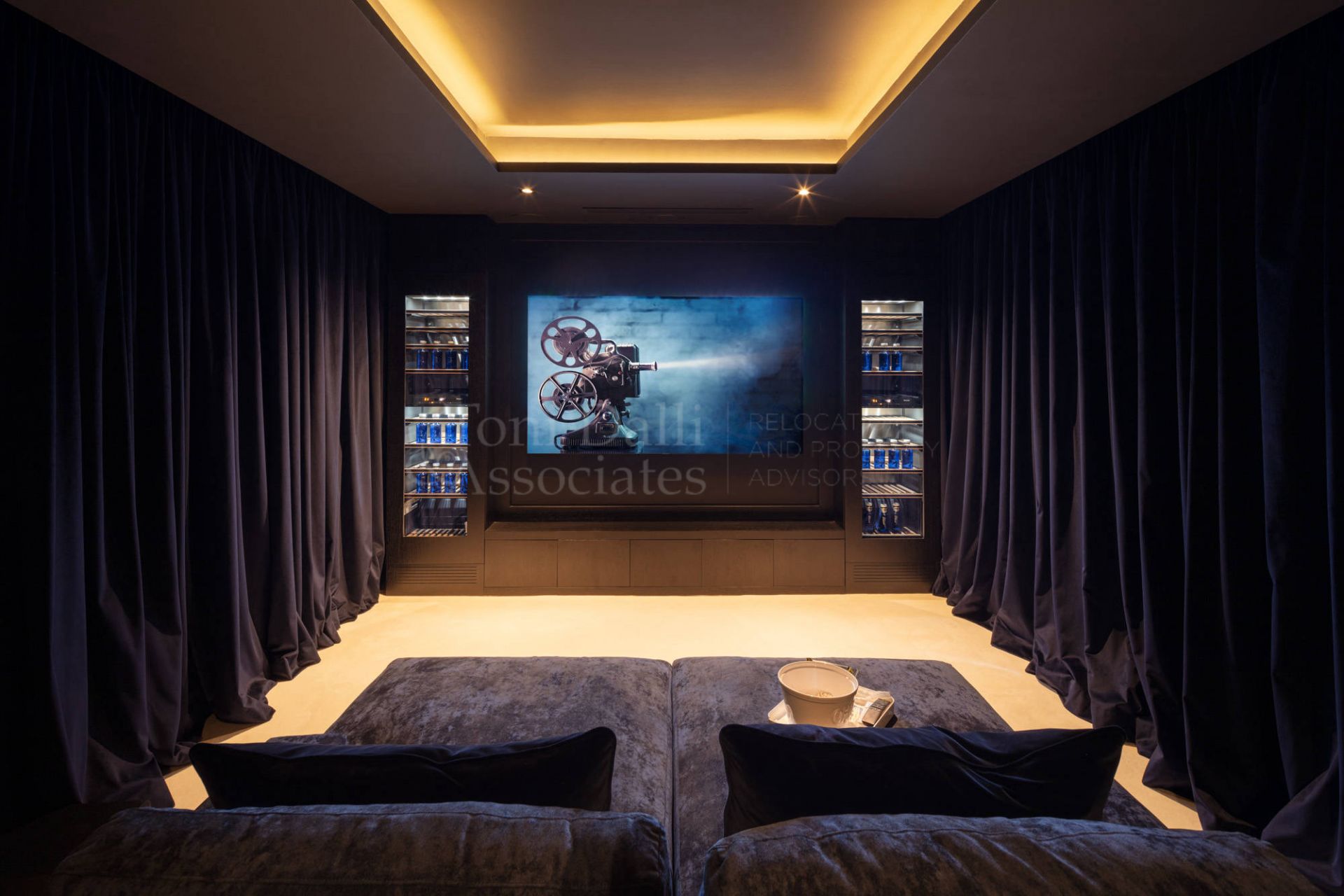 The interiors are bright, spacious, and open plan, designed to merge seamlessly with the outdoor areas. This layout creates the perfect environment for the indoor–outdoor lifestyle for which Marbella is famous. On the main floor, the living room serves as the heart of the home, opening directly to terraces with outdoor seating and dining spaces. A large kitchen with a sitting room makes everyday living comfortable, while a full-size dining room connects to an outdoor barbecue area, ideal for entertaining family and friends. The main level also offers a TV room, a guest suite, and a private cinema room for relaxed evenings.