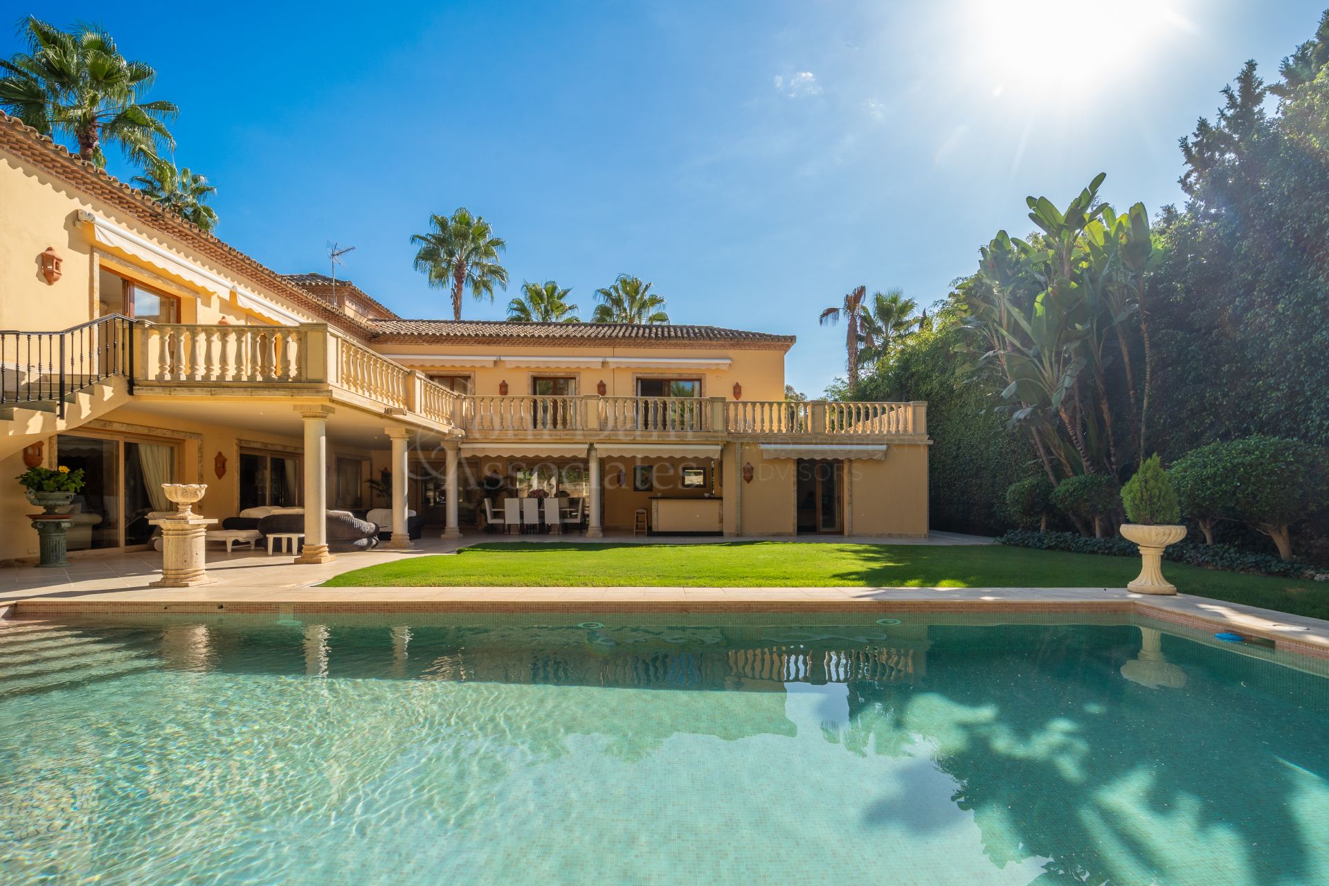 This exquisitely designed villa with classic character stands out for its timeless elegance and privileged location in Nueva Andalucía, just a short distance from several of the most prestigious golf courses and renowned international schools. With southwest orientation, the property enjoys abundant natural light and the warm afternoon sun, creating a welcoming, bright, and serene atmosphere throughout the day.