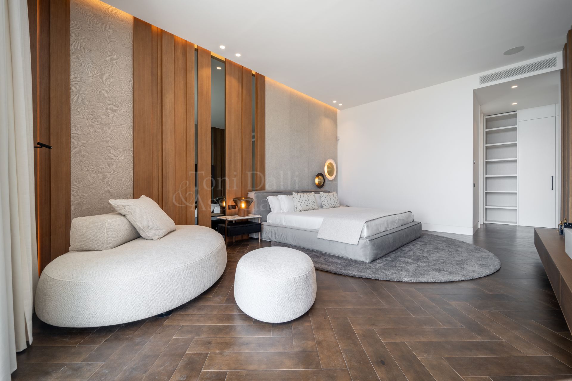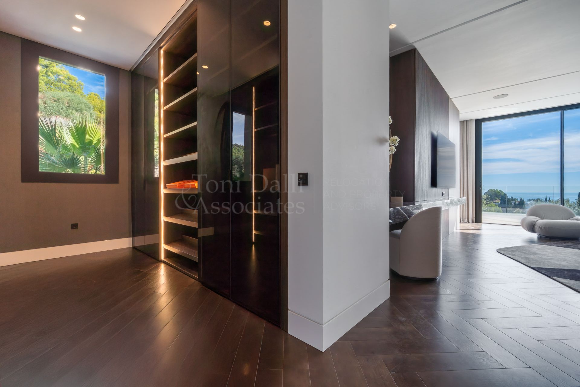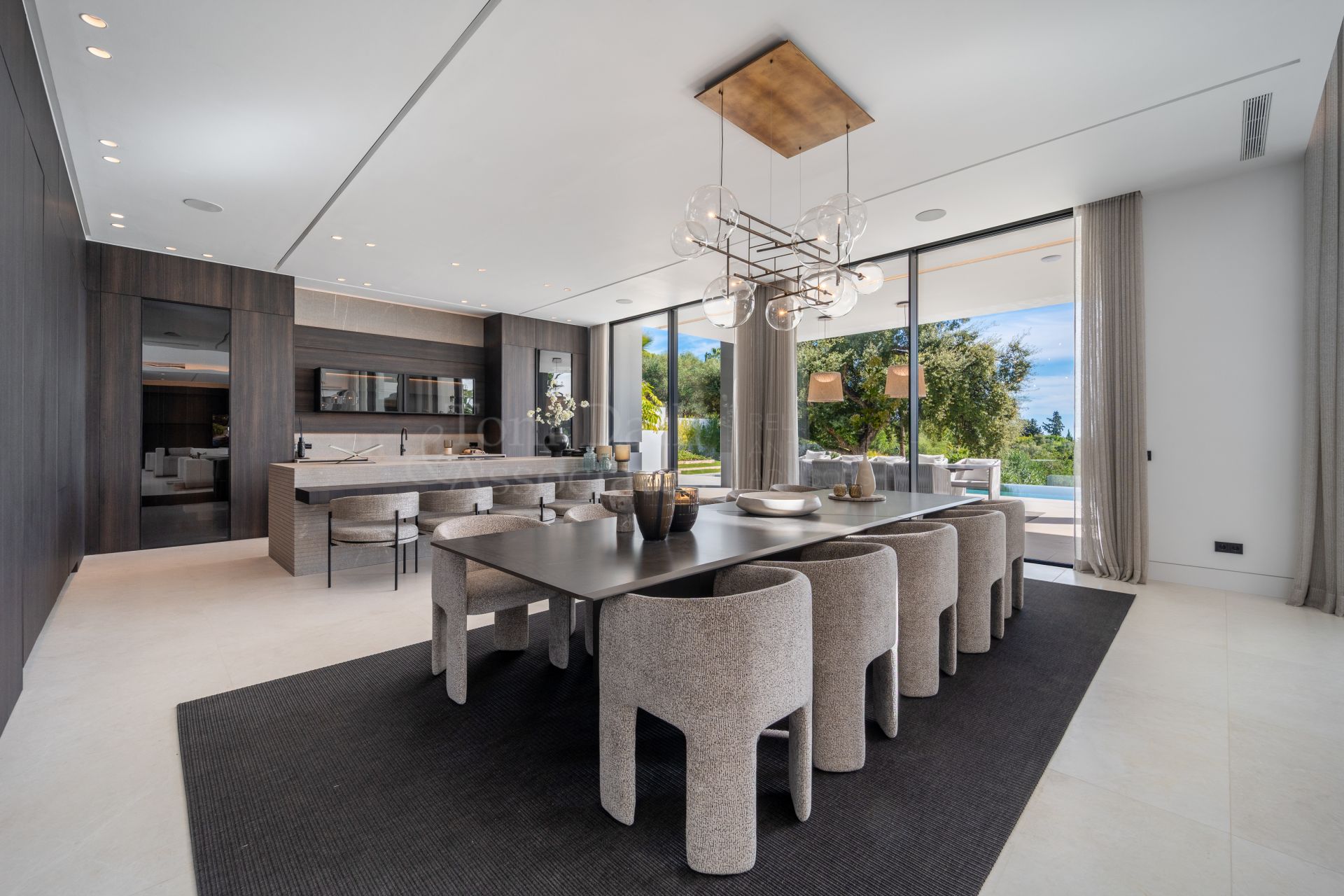 The main living space flows effortlessly into several distinct yet interconnected zones. To one side, a luxurious lounge area offers a cozy TV retreat, while the opposite wing opens into a grand dining space and a chef-worthy kitchen. The Modulnova-designed kitchen, fitted with cutting-edge Gaggenau appliances, is a showpiece in itself. With clean lines, premium materials, and a sleek concealment system, it transforms from a functional workspace to a stylish gathering point. A secondary prep kitchen with direct access to the outdoor barbecue area ensures that entertaining is both effortless and discreet.