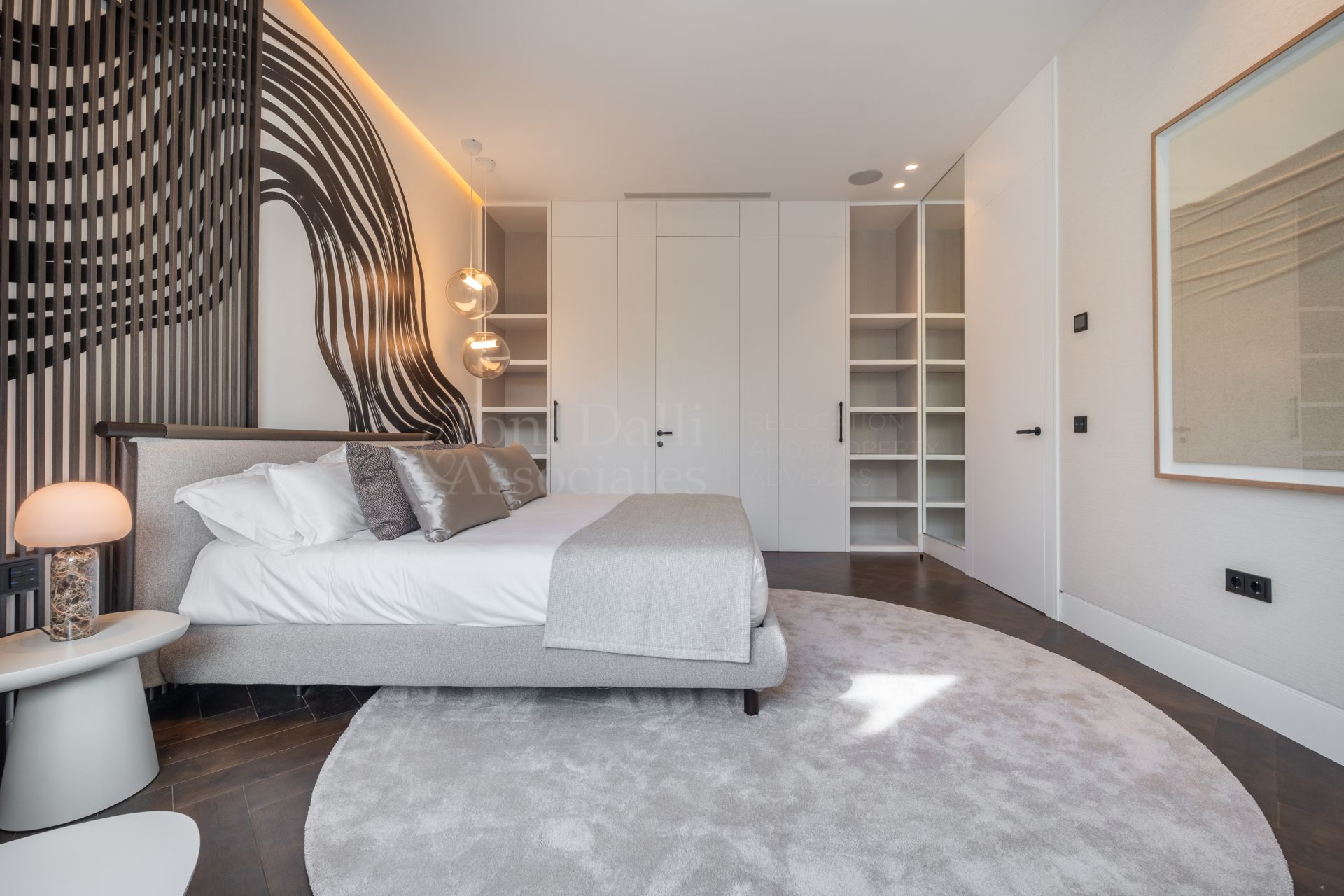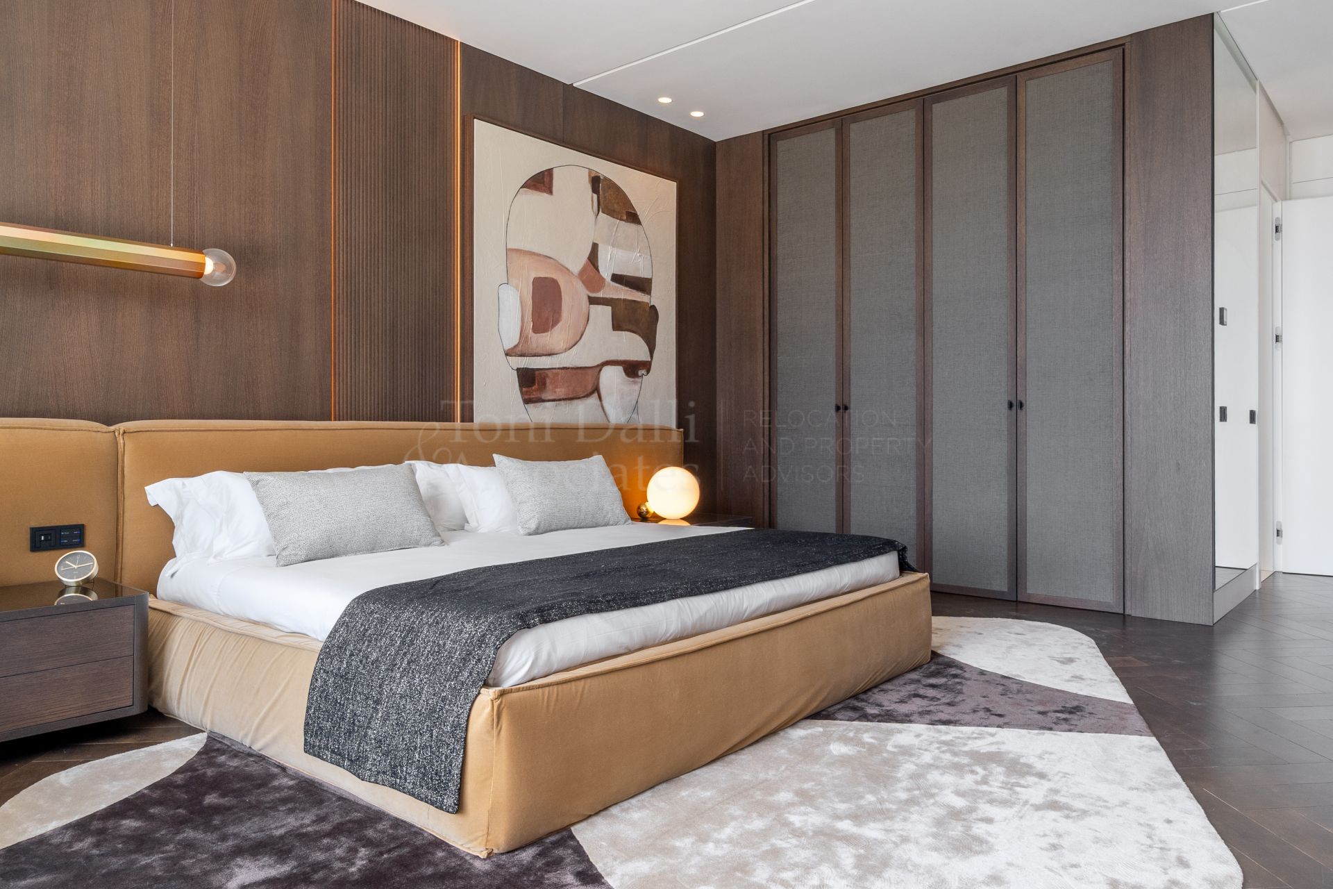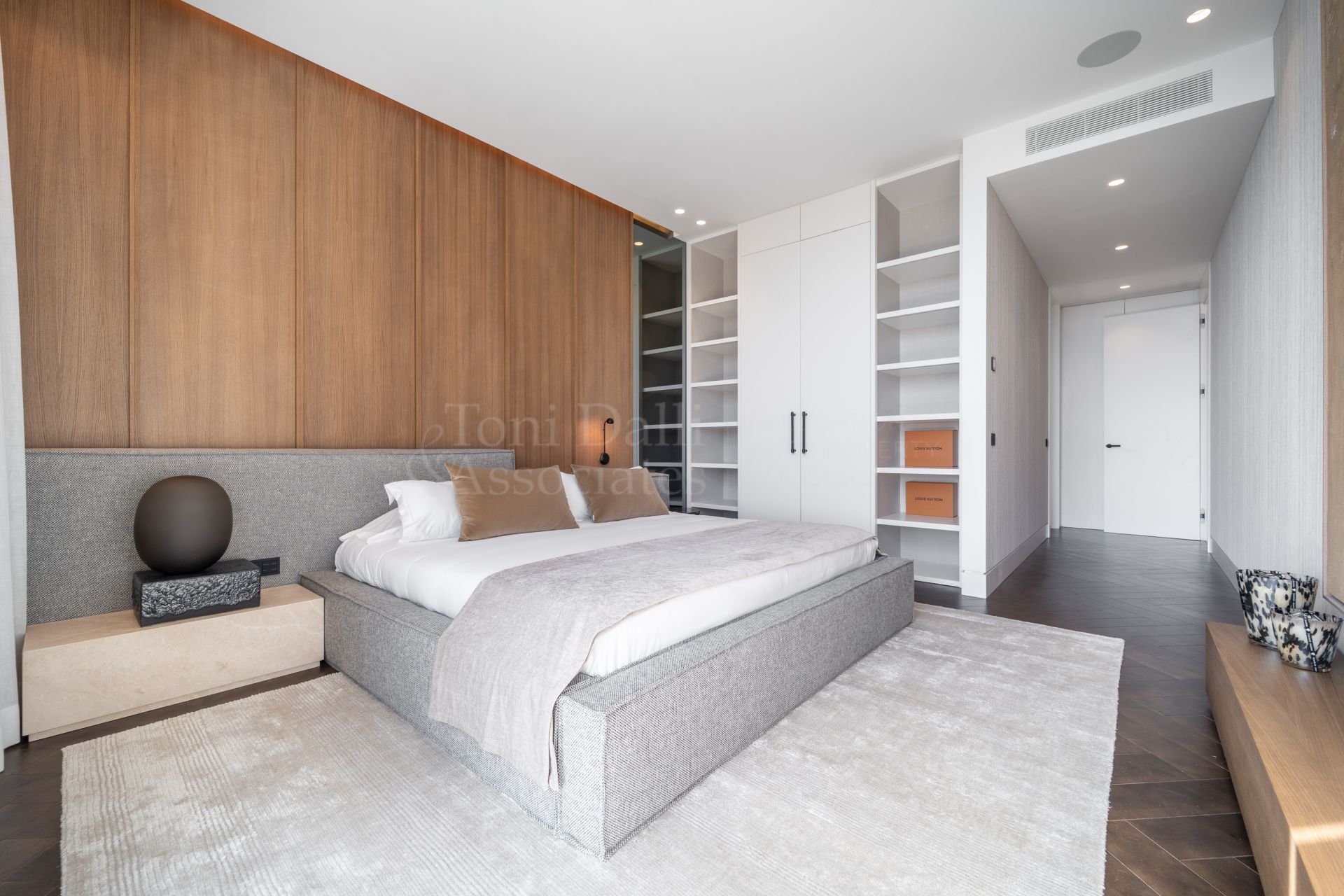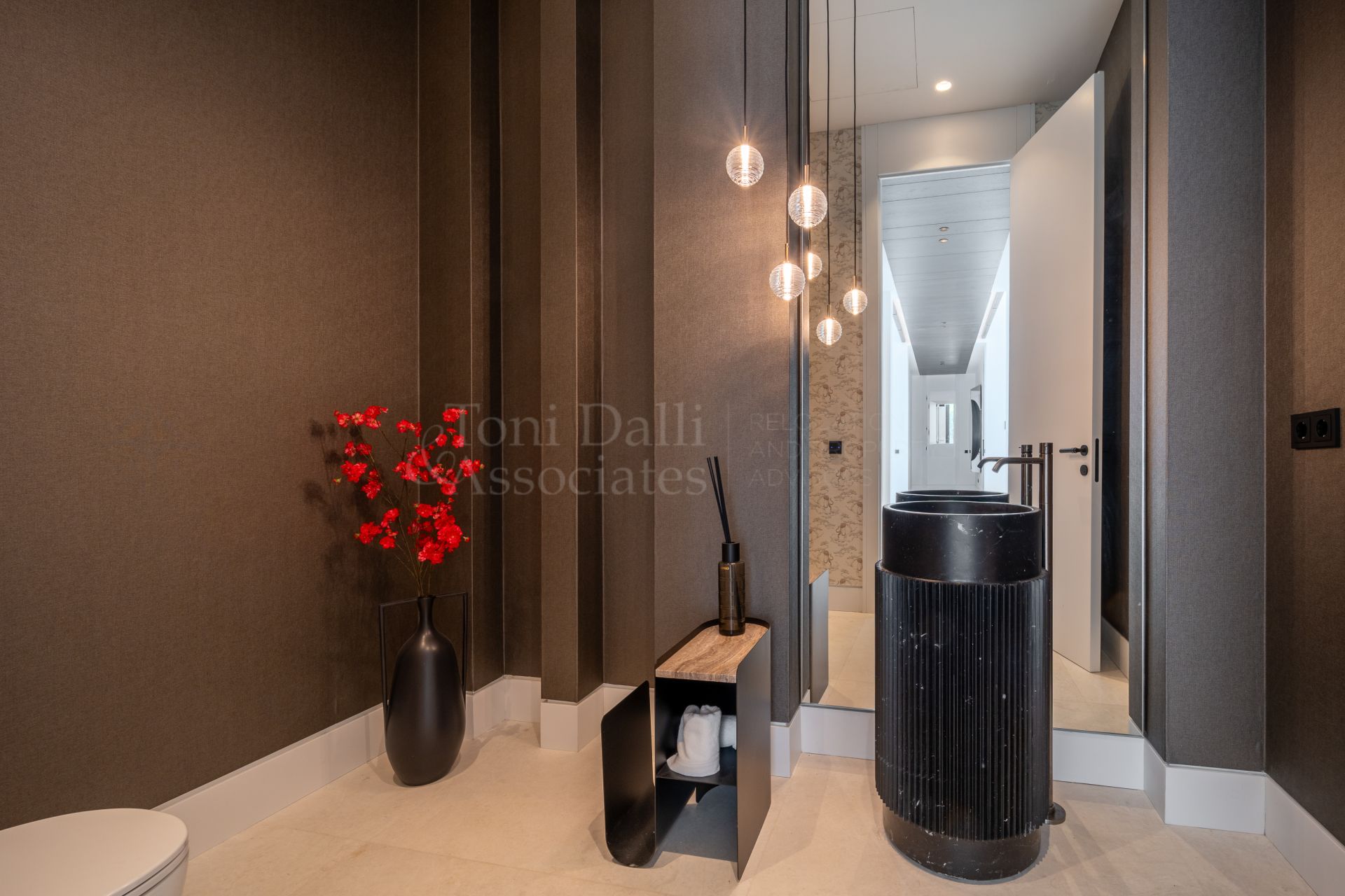 The main living space flows effortlessly into several distinct yet interconnected zones. To one side, a luxurious lounge area offers a cozy TV retreat, while the opposite wing opens into a grand dining space and a chef-worthy kitchen. The Modulnova-designed kitchen, fitted with cutting-edge Gaggenau appliances, is a showpiece in itself. With clean lines, premium materials, and a sleek concealment system, it transforms from a functional workspace to a stylish gathering point. A secondary prep kitchen with direct access to the outdoor barbecue area ensures that entertaining is both effortless and discreet.