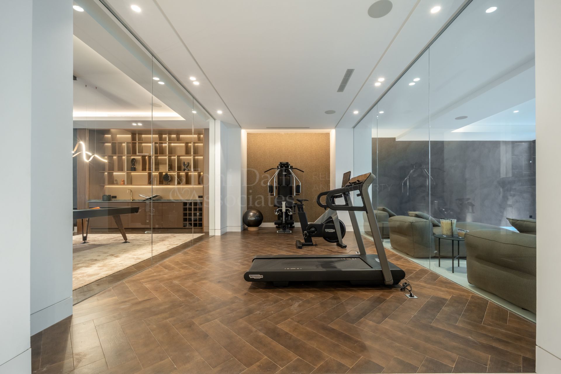 Descending to the lower level reveals a world of relaxation and entertainment. A state-of-the-art wellness area includes a heated indoor pool finished in the finest materials, a Hamman, and a sauna, all flooded with natural light from an enlarged English patio. A fully equipped gym caters to health and fitness enthusiasts, while a stylish bar, TV lounge, and games room offer endless opportunities for leisure. For car collectors, the expansive garage comfortably houses up to six vehicles.