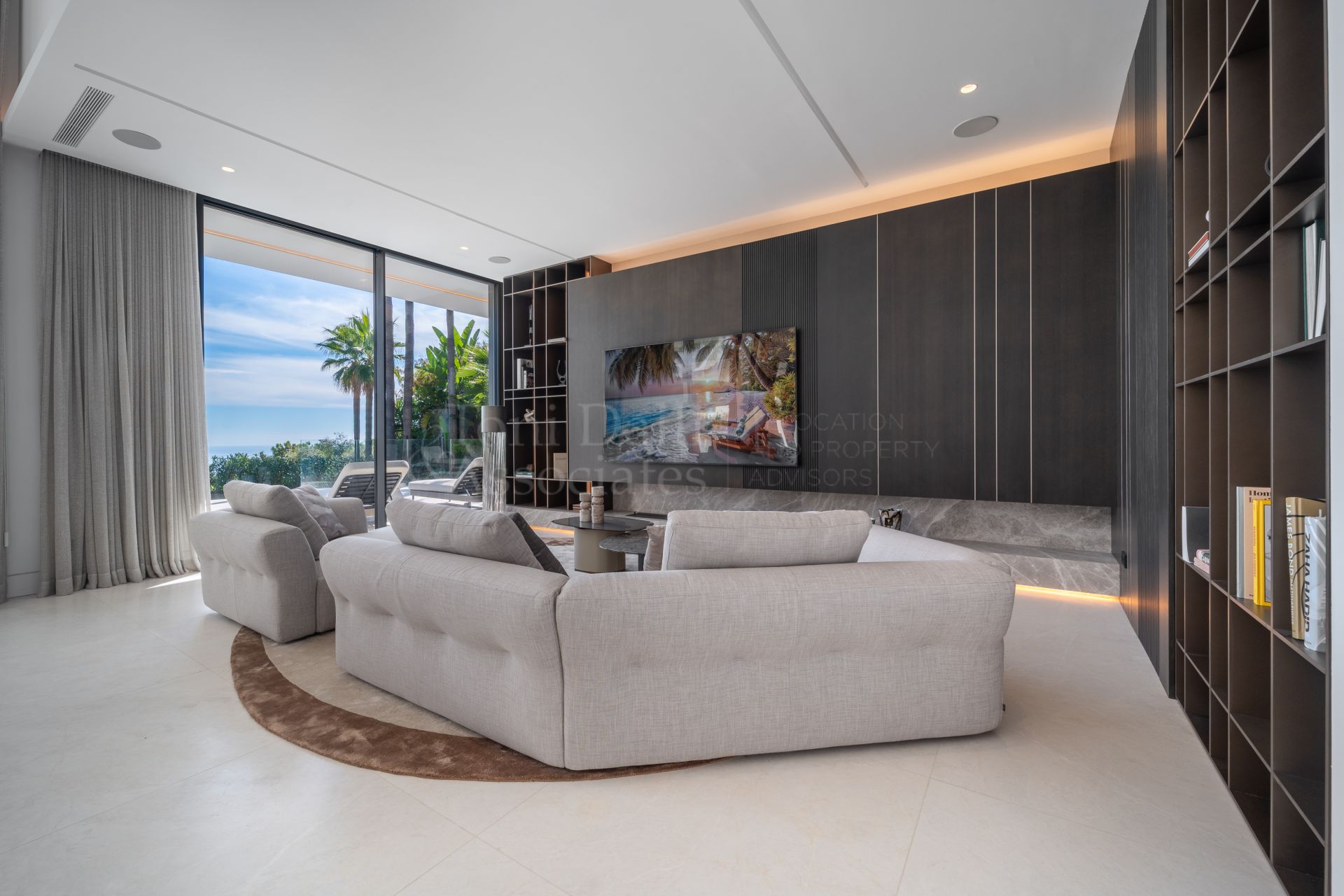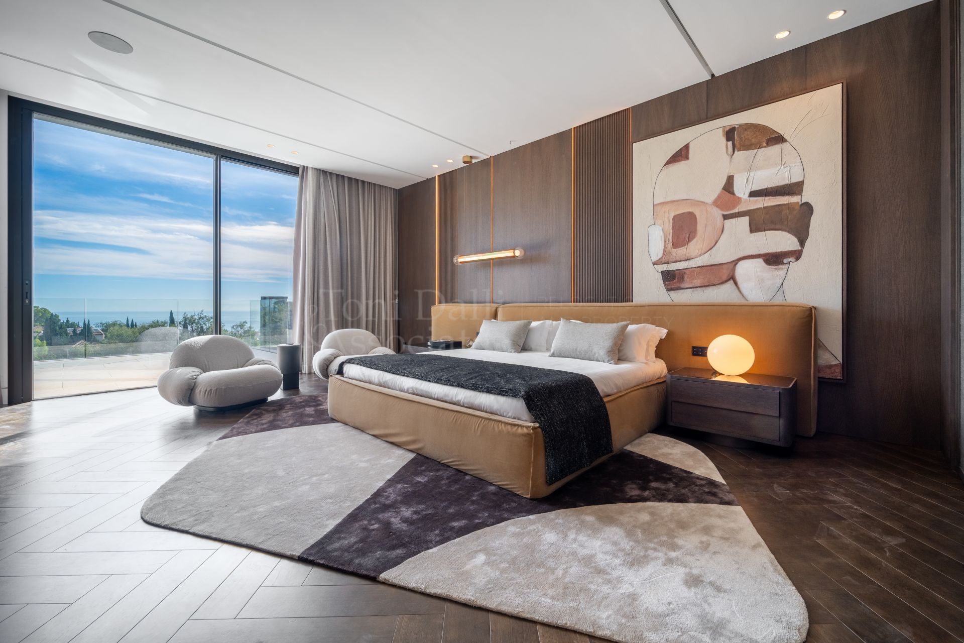 From the moment you arrive, the villa captivates with its imposing double-height entrance and uniquely crafted doorway — a subtle yet powerful indicator of the grandeur within. Inside, an expansive open-concept living area invites you into a world where interior design and panoramic sea views coexist in perfect harmony. Towering ceilings and vast glass walls create a seamless indoor-outdoor experience, framing breathtaking vistas of the Mediterranean coastline and the surrounding verdant landscape.