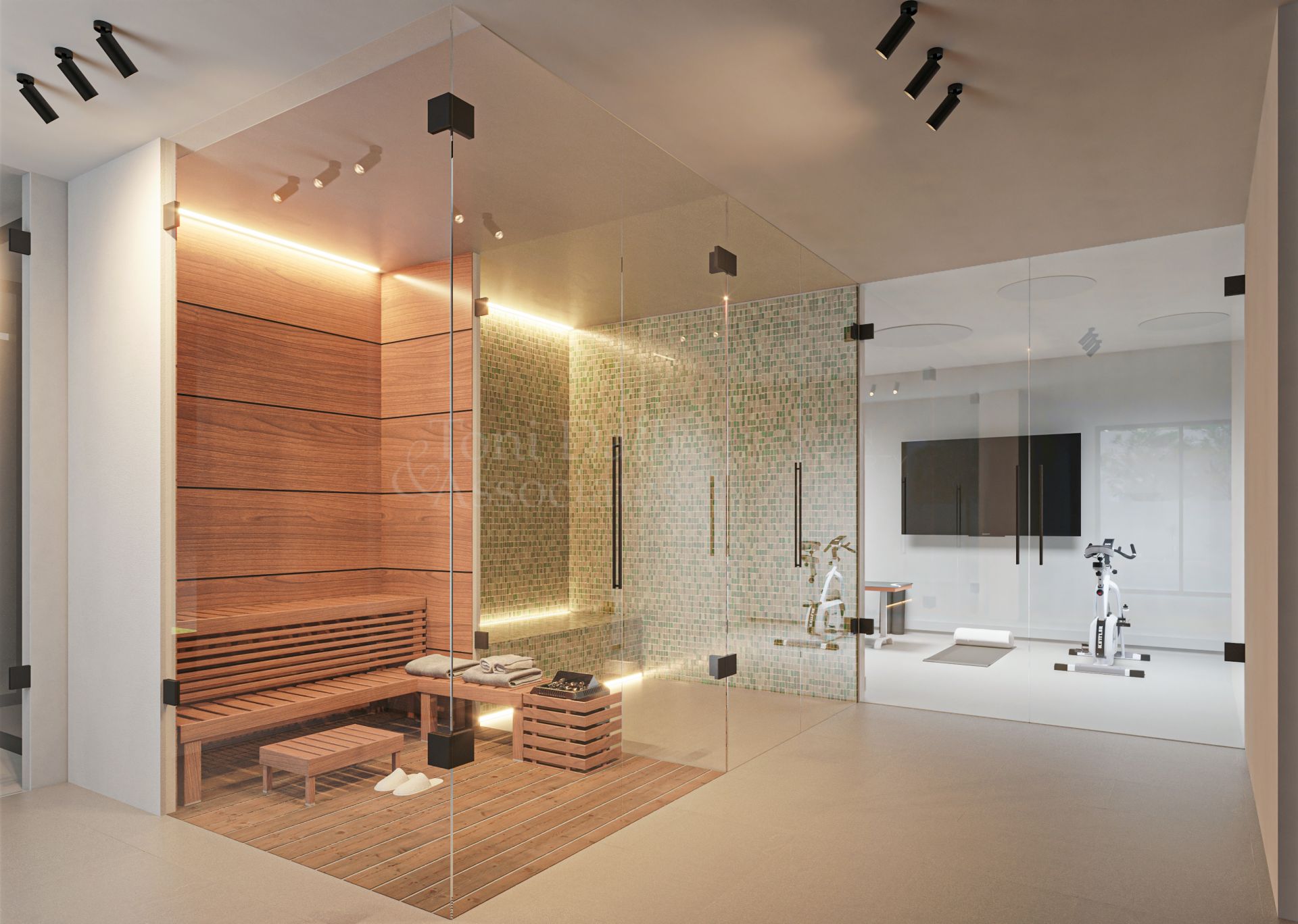 Spacious basement of over 300 square meters, with high ceilings of 3 meters, designed for entertainment and enjoyment. Here, you will find a large garage for several vehicles, a driveway with a turntable for cars, a luxurious spa equipped with sauna and steam bath, a modern indoor gym and a home theater, all with direct access to the exquisite garden.
