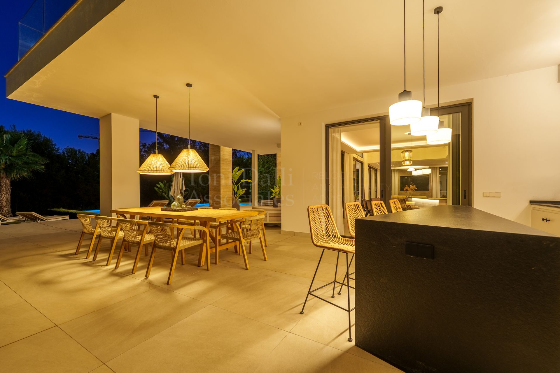 Ascending to the first floor, you will find two elegant guest suites, each thoughtfully designed with built-in wardrobes and en-suite bathrooms. The crown jewel of this level is the master suite, a sanctuary of luxury featuring a spacious walk-in wardrobe and a private terrace with stunning views. From this level, you also have access to a large solarium, a spectacular space boasting panoramic sea views, a jacuzzi, and an outdoor kitchen. This area is perfect for entertaining or simply enjoying the Mediterranean sunsets in style.