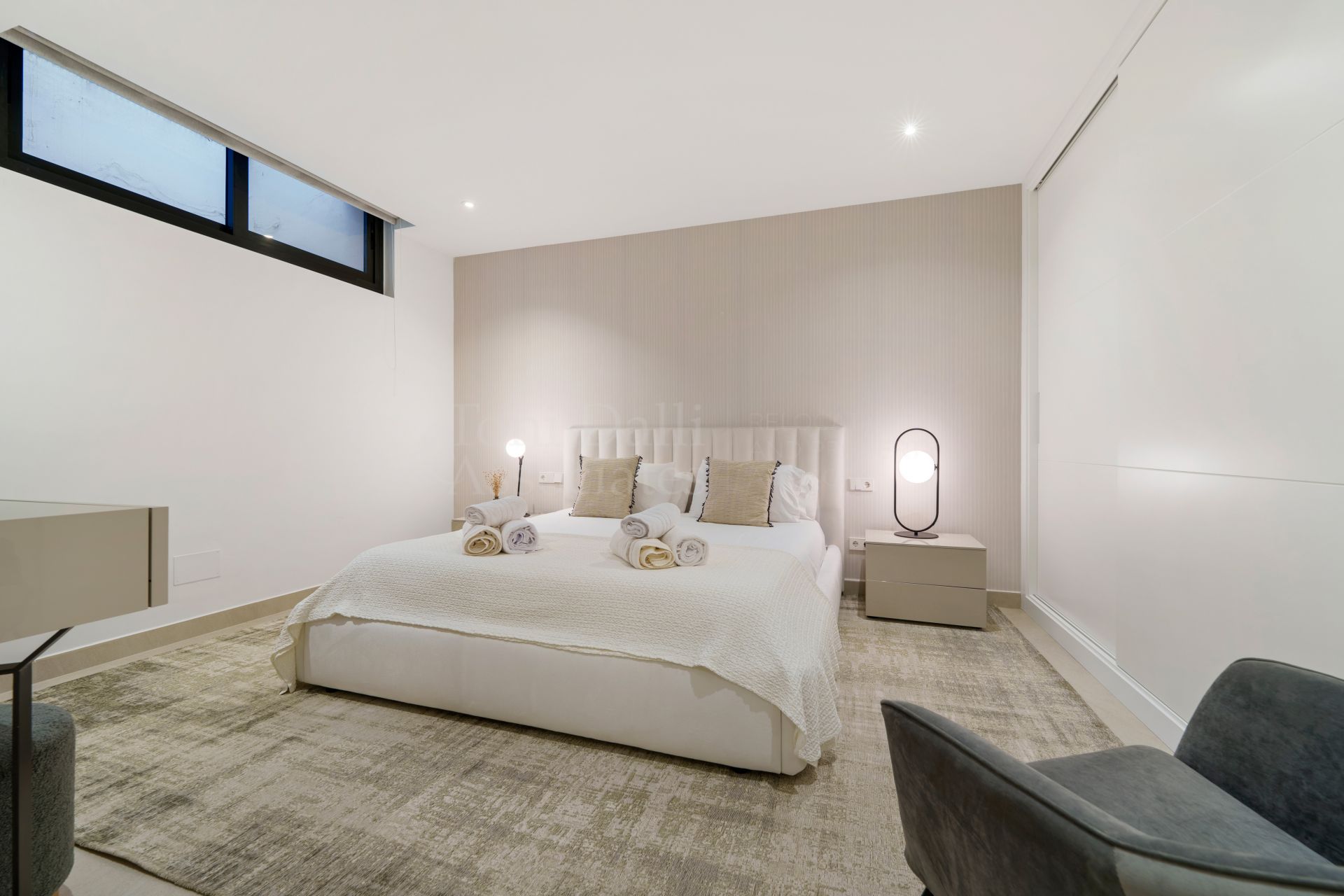 The open-plan kitchen is a chef’s dream, equipped with top-of-the-range appliances and a sleek breakfast bar, perfect for casual dining and entertaining. Adjacent to the kitchen, the separate dining area also opens onto the terrace, creating a seamless indoor-outdoor living experience. The ground floor is completed by a luxurious guest suite, offering comfort and privacy for visitors.