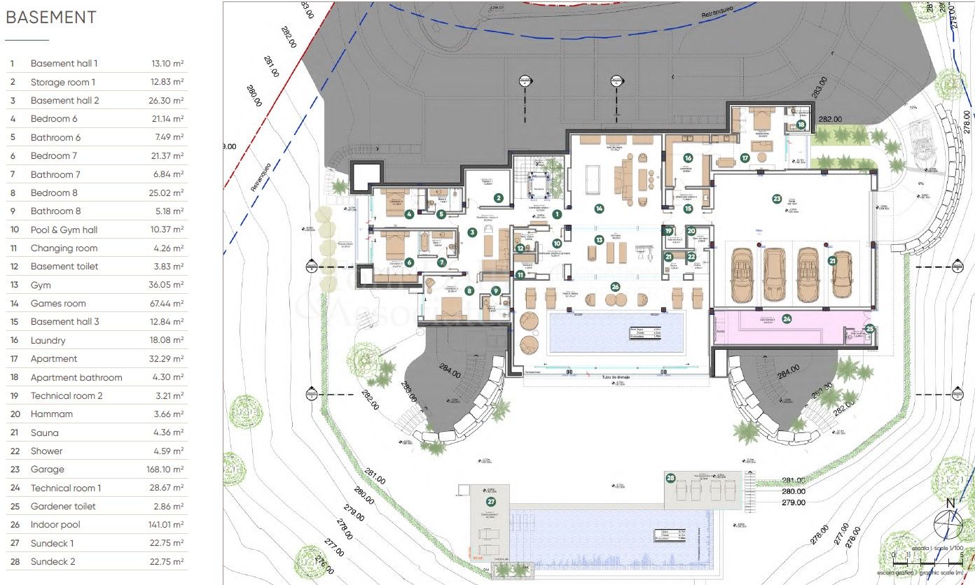 The lower level includes two more en-suite bedrooms, a spa with sauna, hammam, gym, changing rooms, and an indoor pool. Additional spaces include a laundry, cinema, storage rooms, and a garage for three cars. A self-contained apartment with independent access provides ideal accommodation for staff or guests.