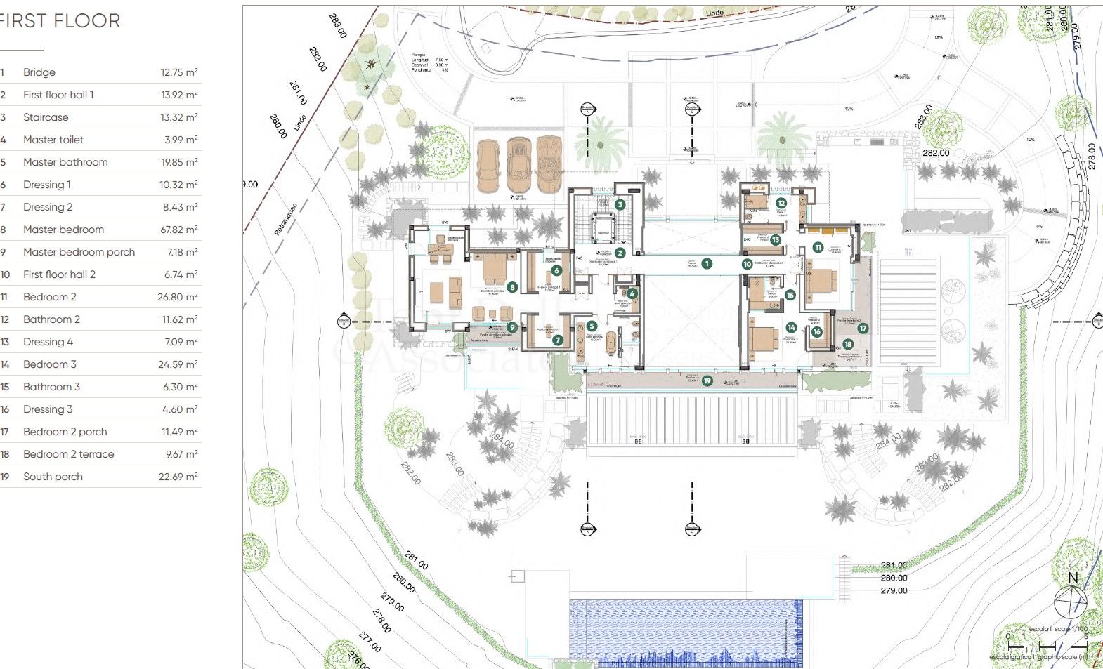 The first floor is dedicated to a grand master suite with a sitting area, office, two dressing rooms, and a luxurious bathroom with shower and bathtub. The suite opens onto a private terrace with sea views. Two further bedrooms, each with their own dressing room and bathroom, share a terrace overlooking the coast.