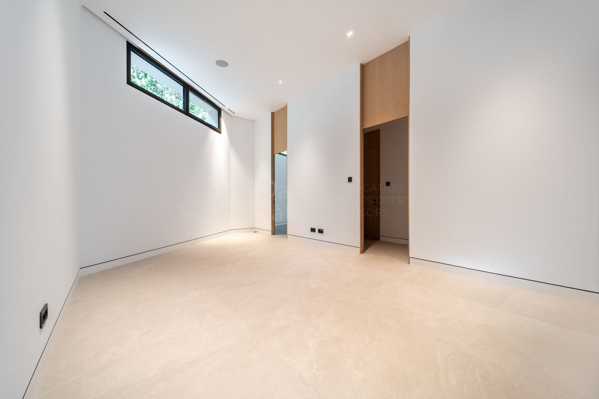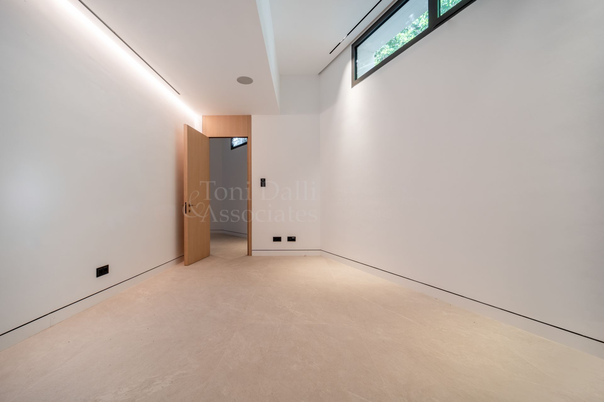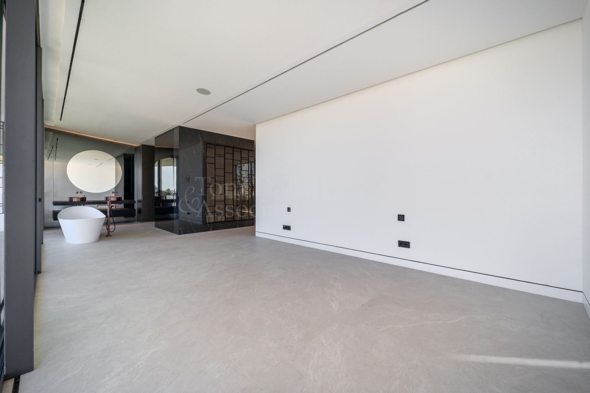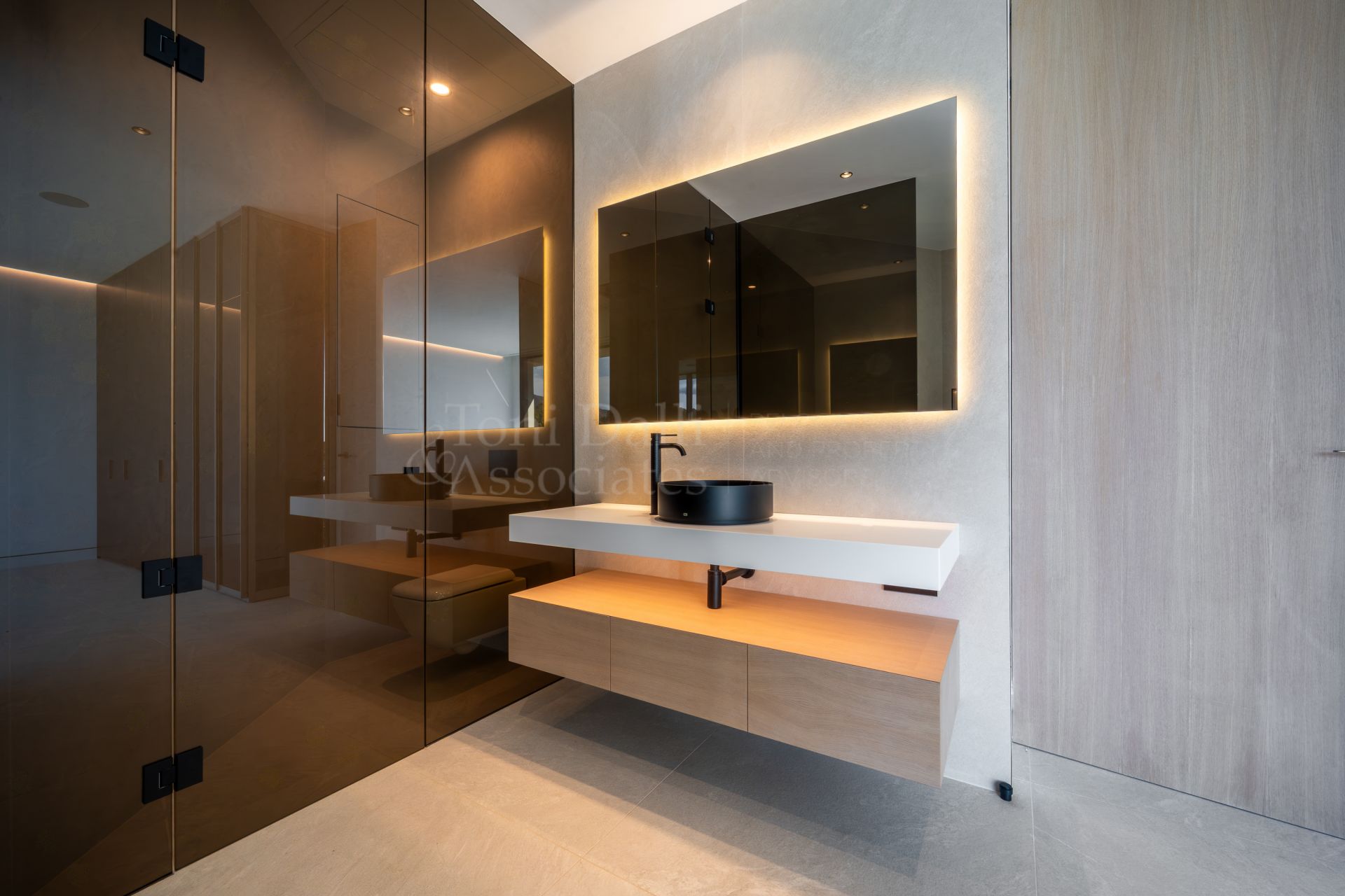 The villa is equipped with a full music installation, creating a seamless audio environment across the home. Large sliding doors open onto generous outdoor spaces created for dining, lounging, and enjoying Marbella’s exceptional climate throughout the year. This floor also includes a guest toilet.