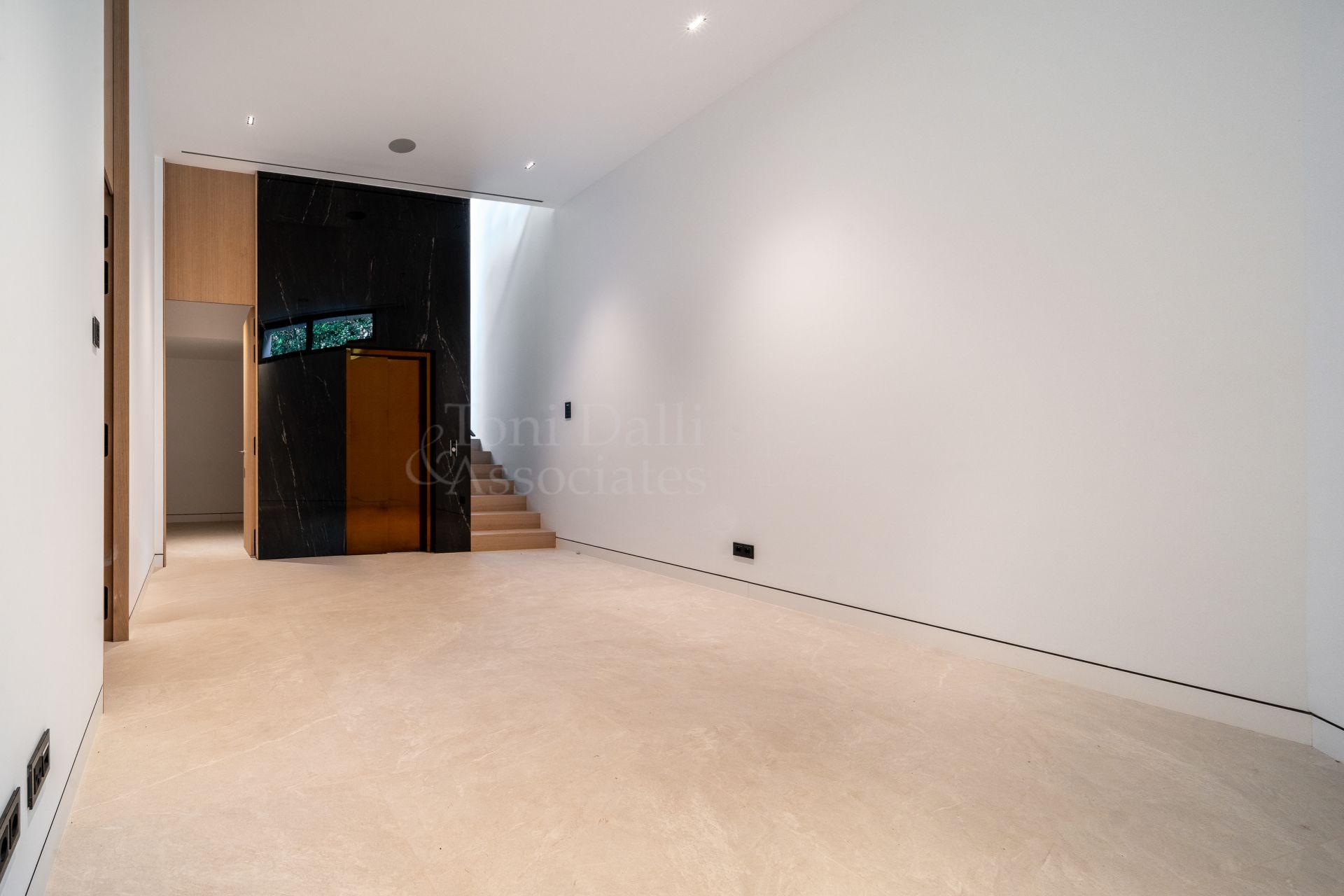 The ground floor features a welcoming entrance hall leading into a spacious living and dining area designed for both relaxation and entertaining. The open-plan kitchen is equipped with state-of-the-art Gaggenau appliances and finished in a sleek, minimalist style that combines refined aesthetics with high functionality.