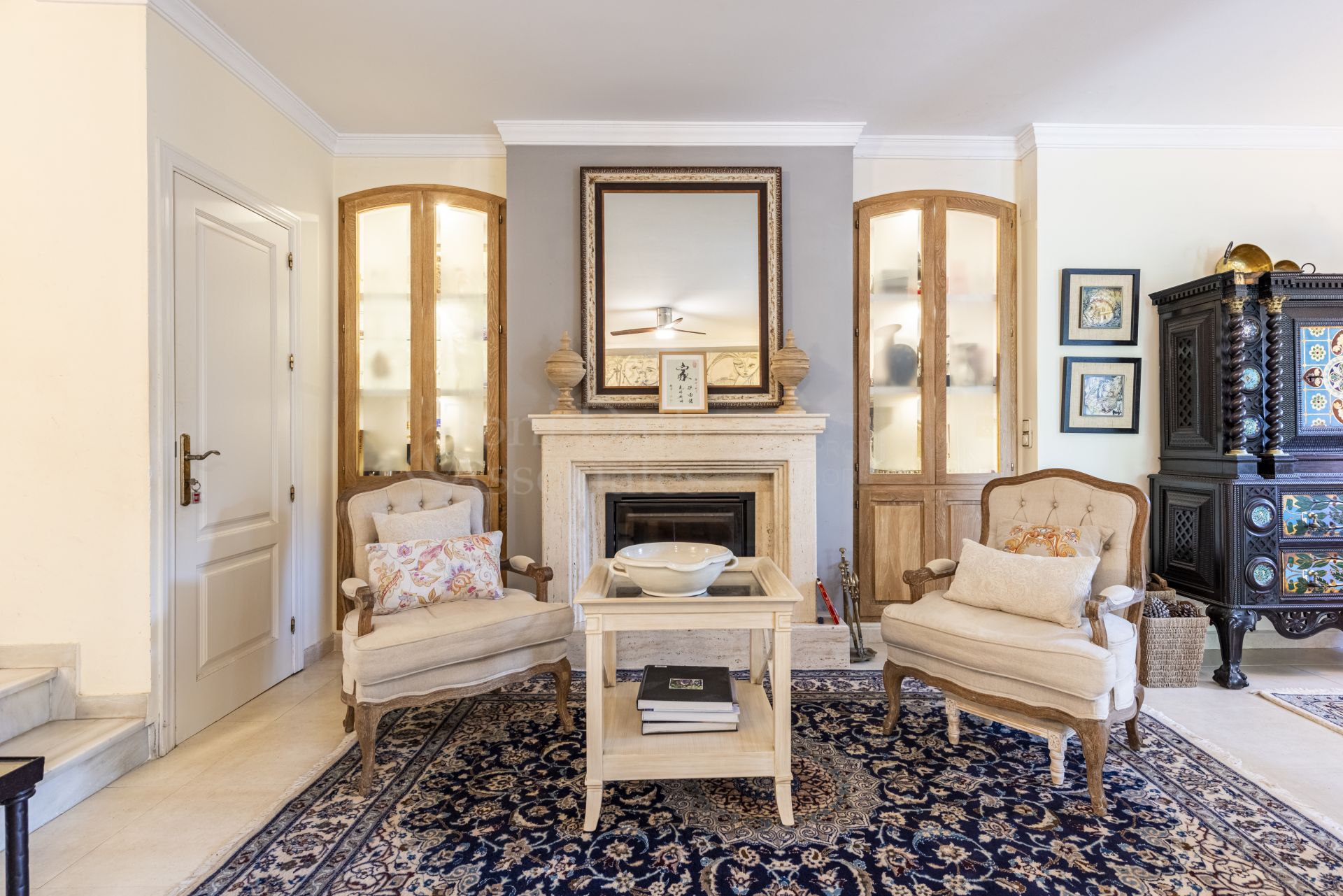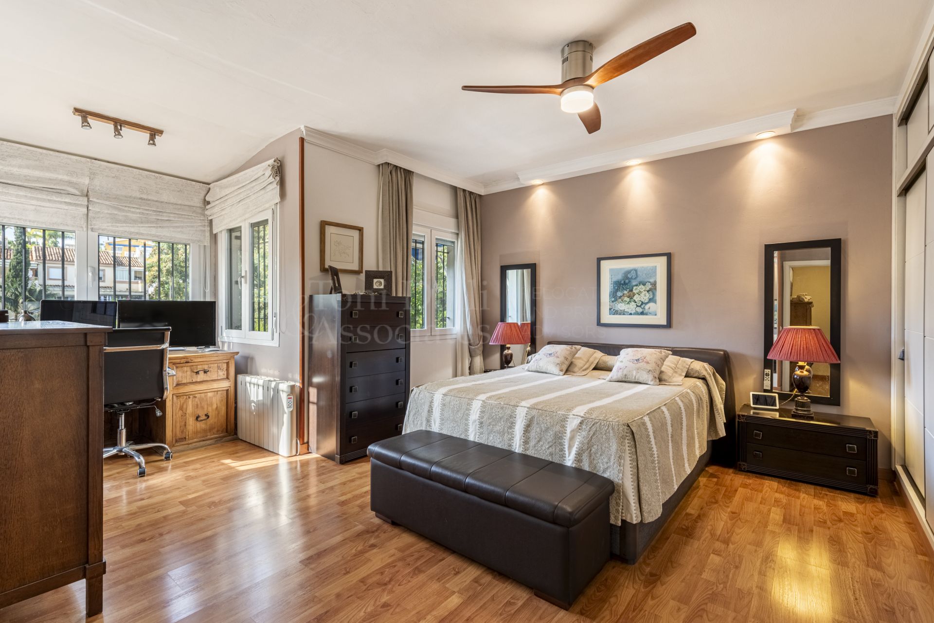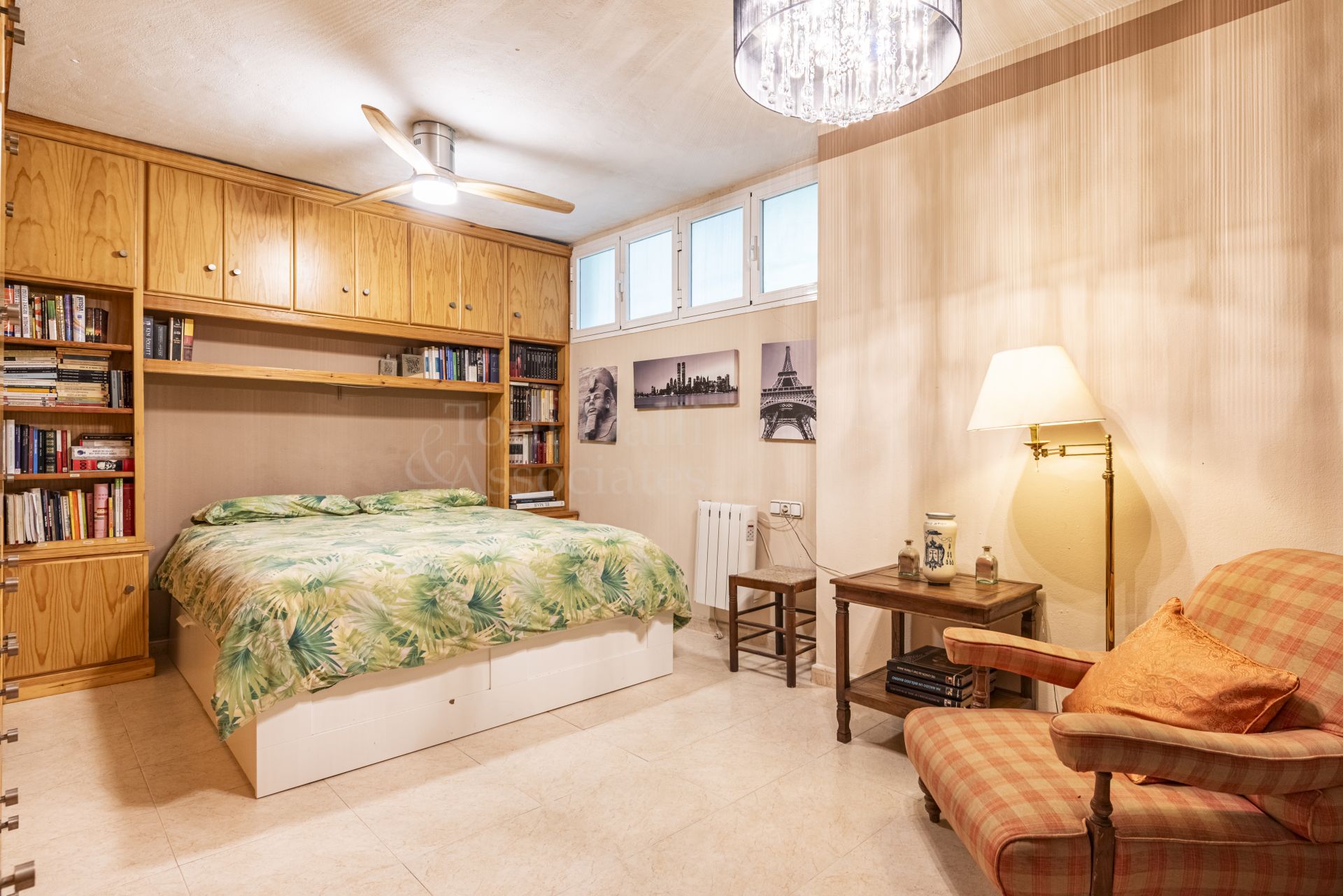 This west-facing semi-detached house is situated in the heart of Nueva Andalucía, offering an enviable location within walking distance to Puerto Banús, the beach, and all essential amenities. Nestled amidst a lush, mature garden, the property is thoughtfully distributed across three levels, providing a spacious and versatile layout that caters to both comfort and functionality. With a total of five en-suite bedrooms and ample outdoor and indoor living spaces, this home offers immense potential to be modernized into a contemporary family haven.