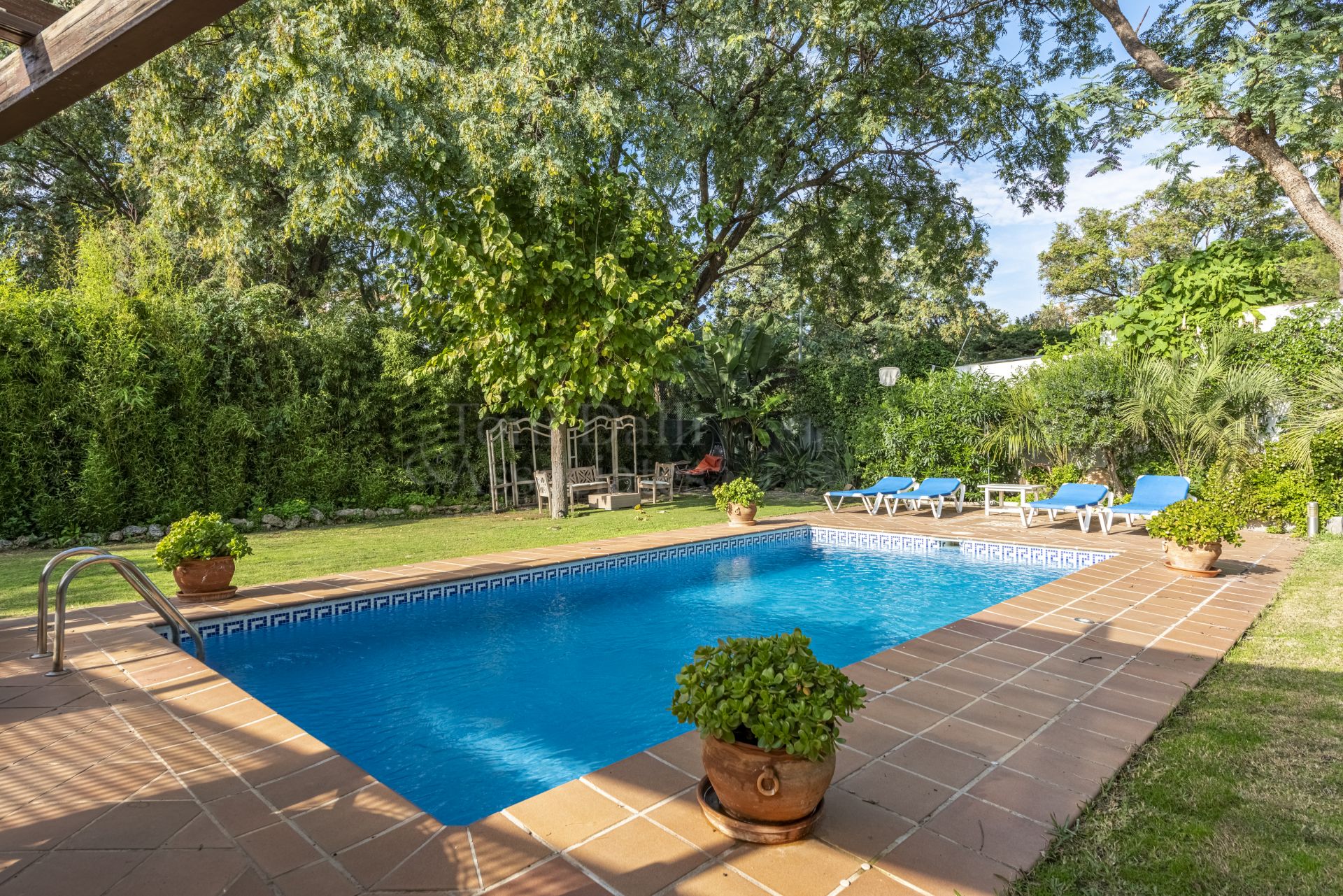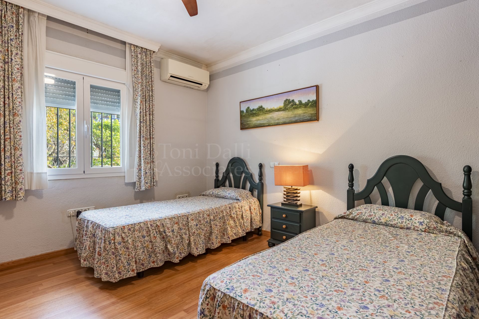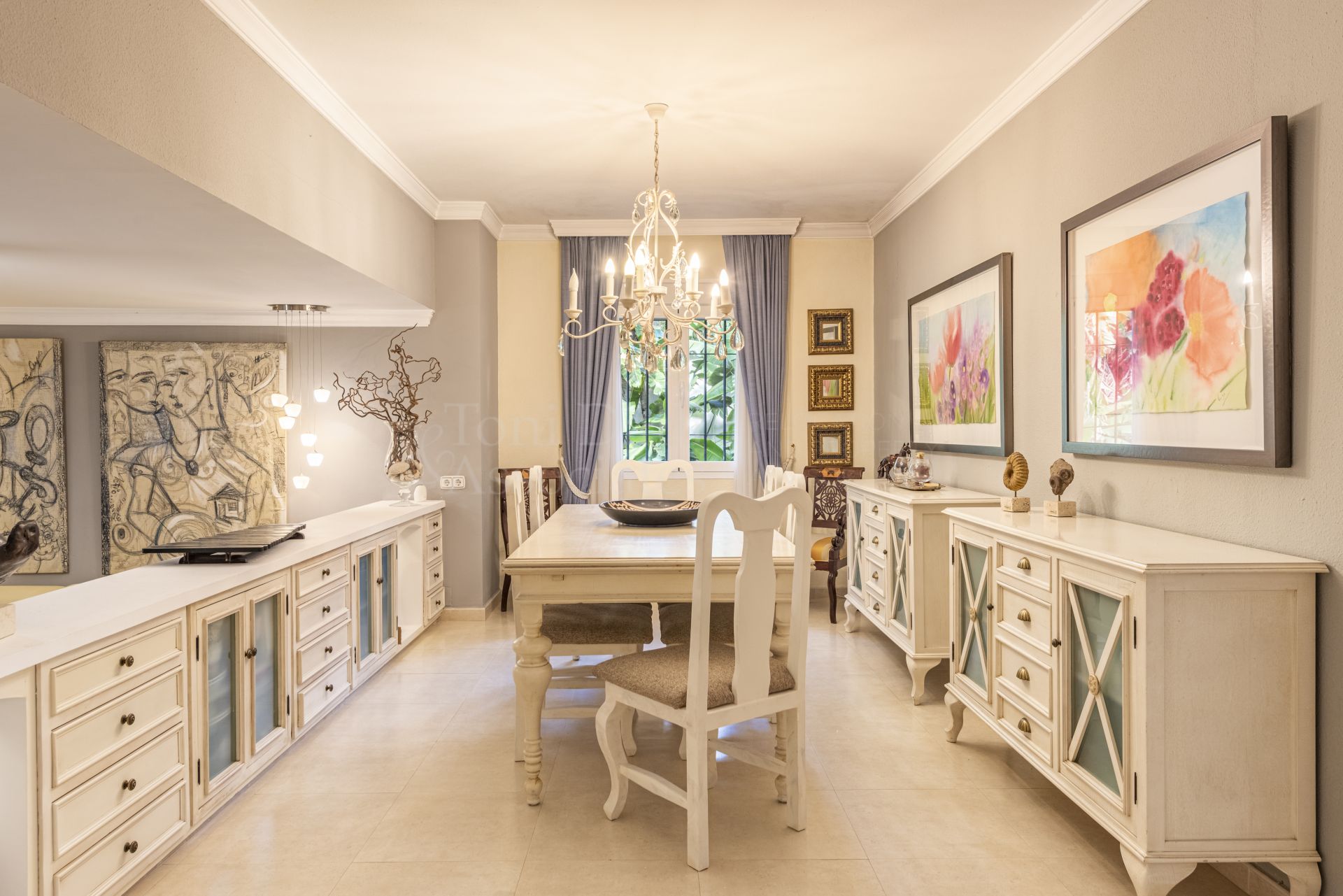 This west-facing semi-detached house is situated in the heart of Nueva Andalucía, offering an enviable location within walking distance to Puerto Banús, the beach, and all essential amenities. Nestled amidst a lush, mature garden, the property is thoughtfully distributed across three levels, providing a spacious and versatile layout that caters to both comfort and functionality. With a total of five en-suite bedrooms and ample outdoor and indoor living spaces, this home offers immense potential to be modernized into a contemporary family haven.