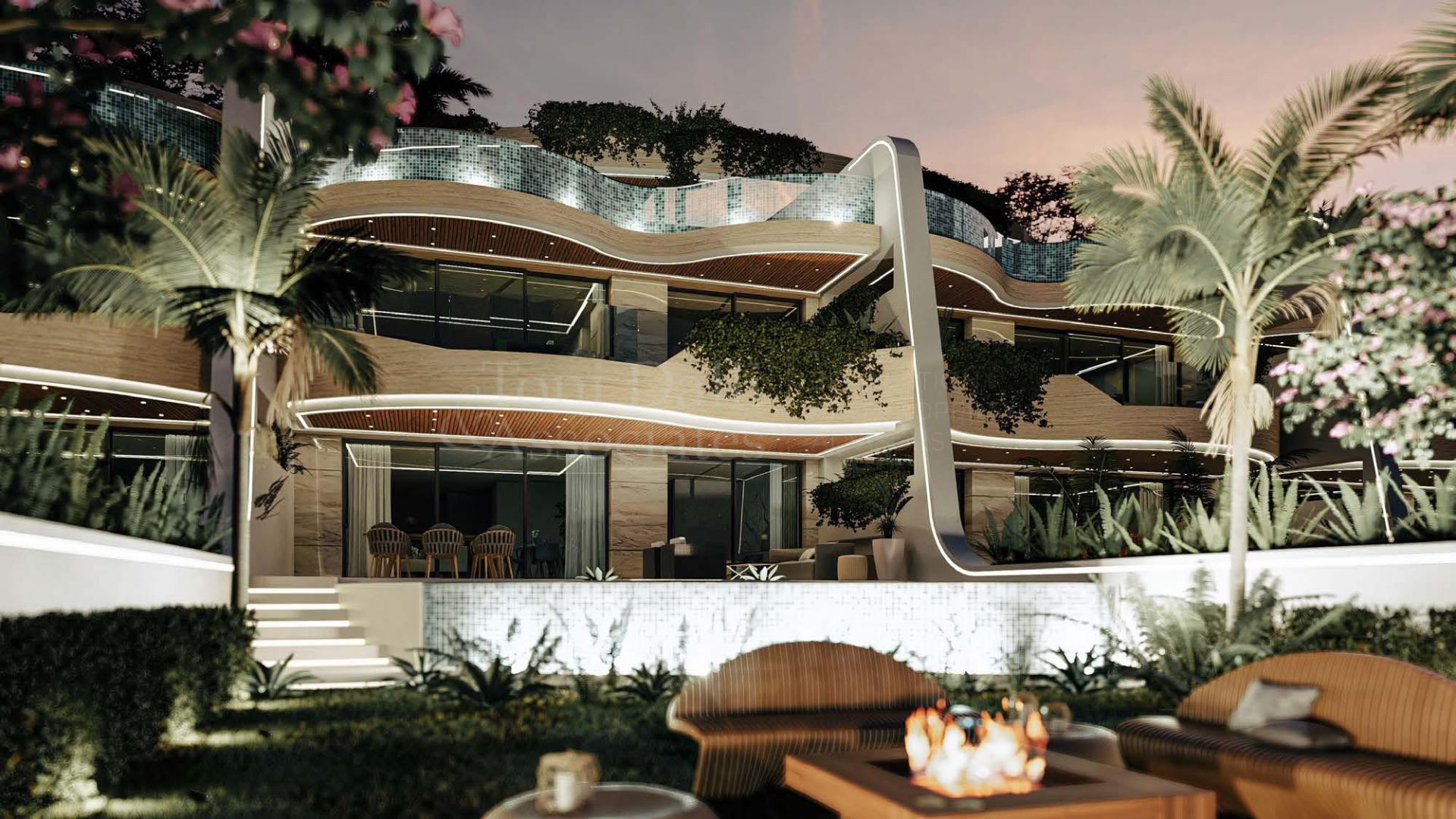 The homes at AÍDA are generously proportioned, offering over 450 m² of total built area across two floors. Buyers can choose between garden-level residences, featuring beautifully landscaped private outdoor spaces, or skyline duplexes, each crowned by a spectacular rooftop solarium with panoramic views of the Mediterranean Sea and Marbella’s emblematic La Concha mountain.