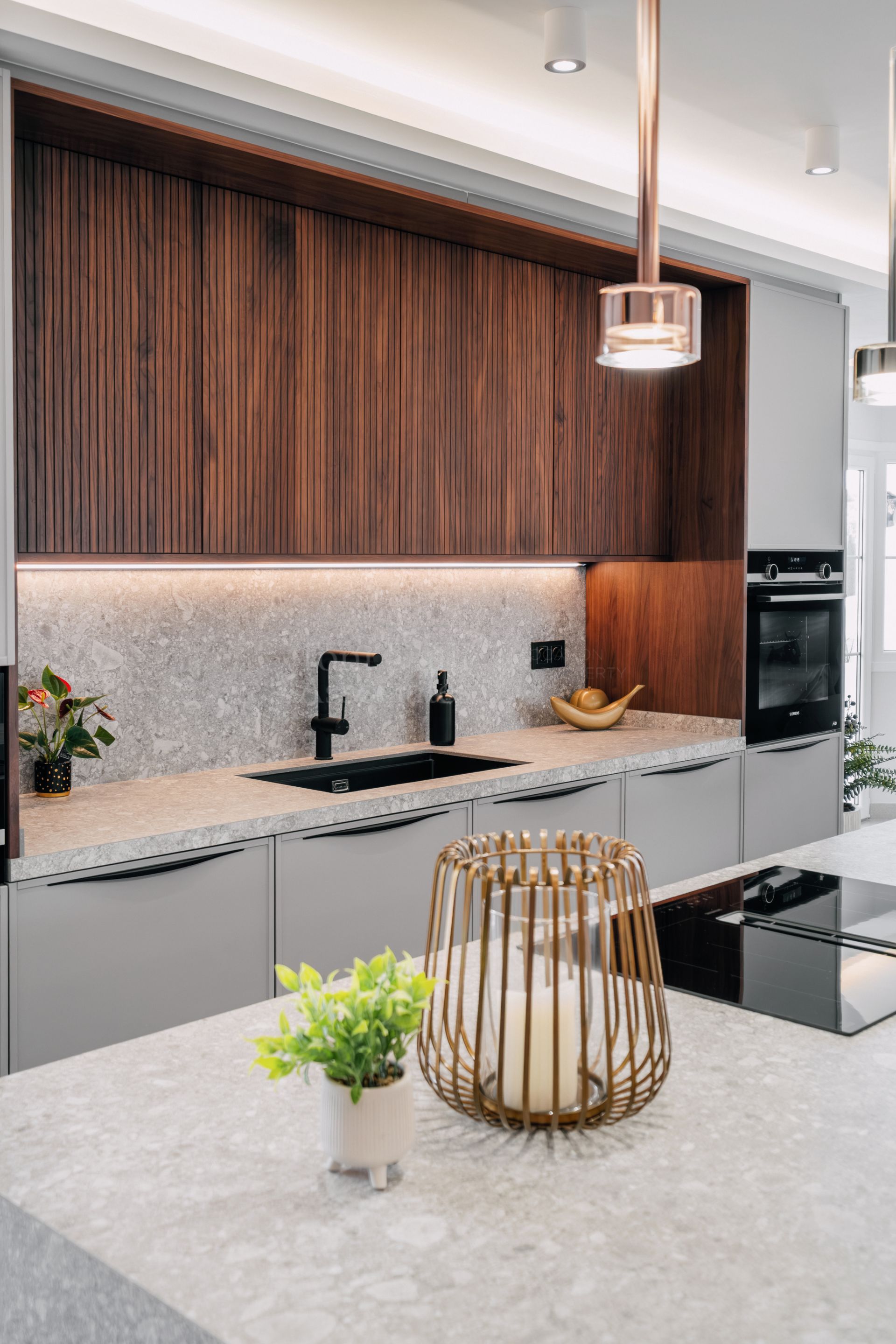 The layout is spread over two levels and flows naturally. The heart of the home is the spacious open-plan living and dining area, which connects to a modern, fully equipped kitchen. The kitchen includes Siemens appliances, a large stone island, a double fridge, an integrated wine fridge, and a butler’s pantry — making it perfect for entertaining friends and family in style. Large sliding doors open out onto generous terraces that offer both sun and shade throughout the day, ideal for outdoor dining, relaxing, or enjoying the spectacular views.