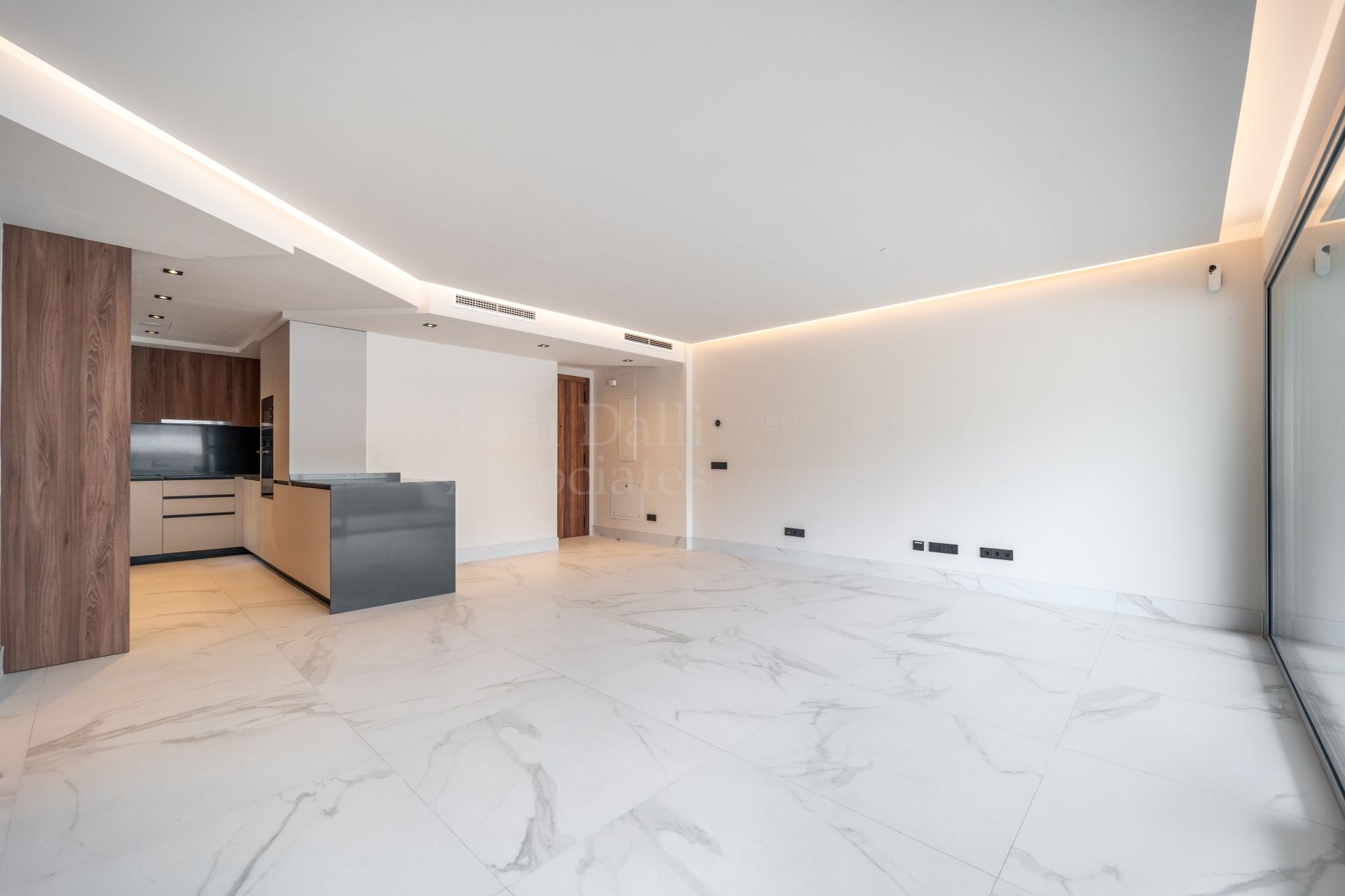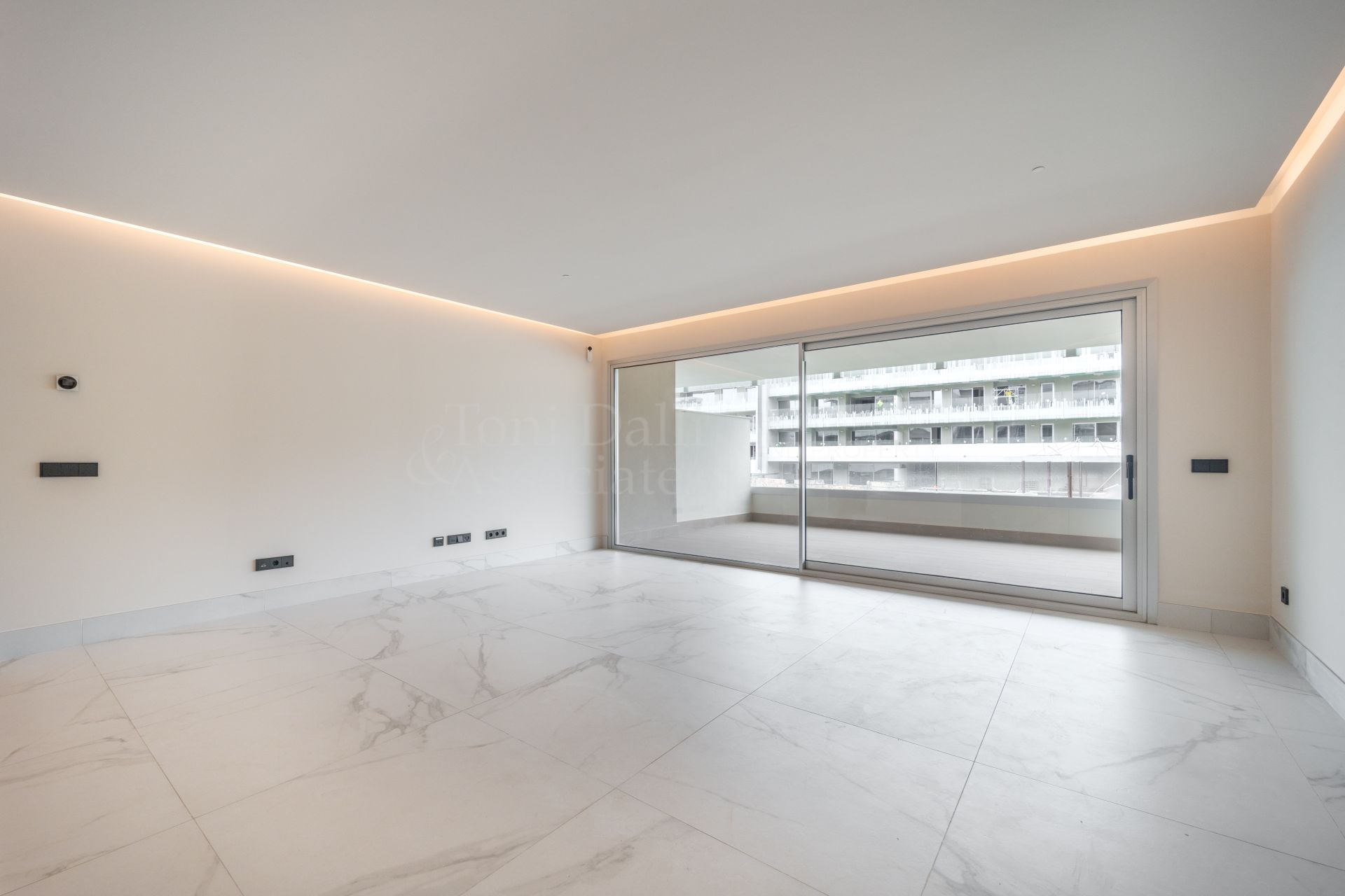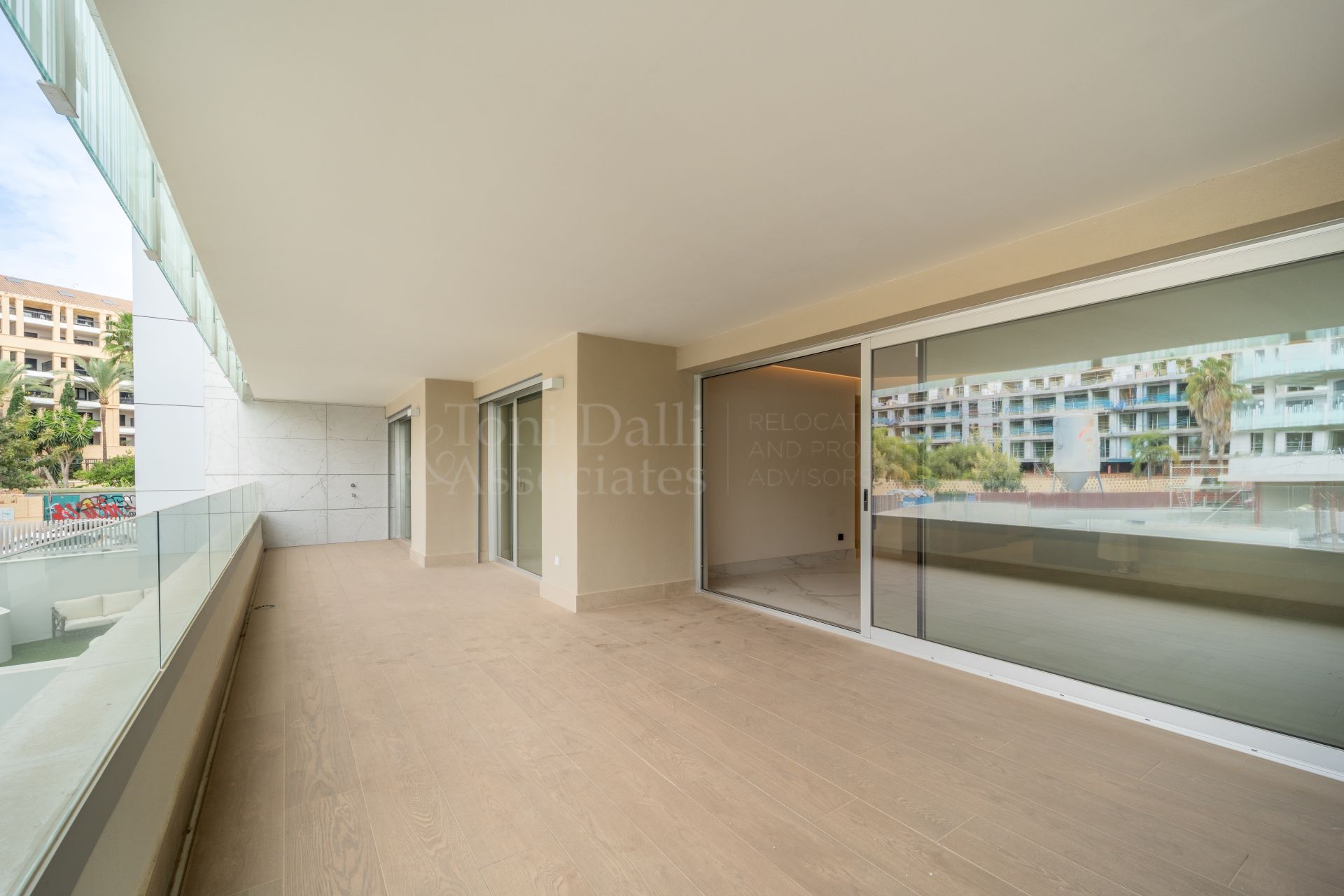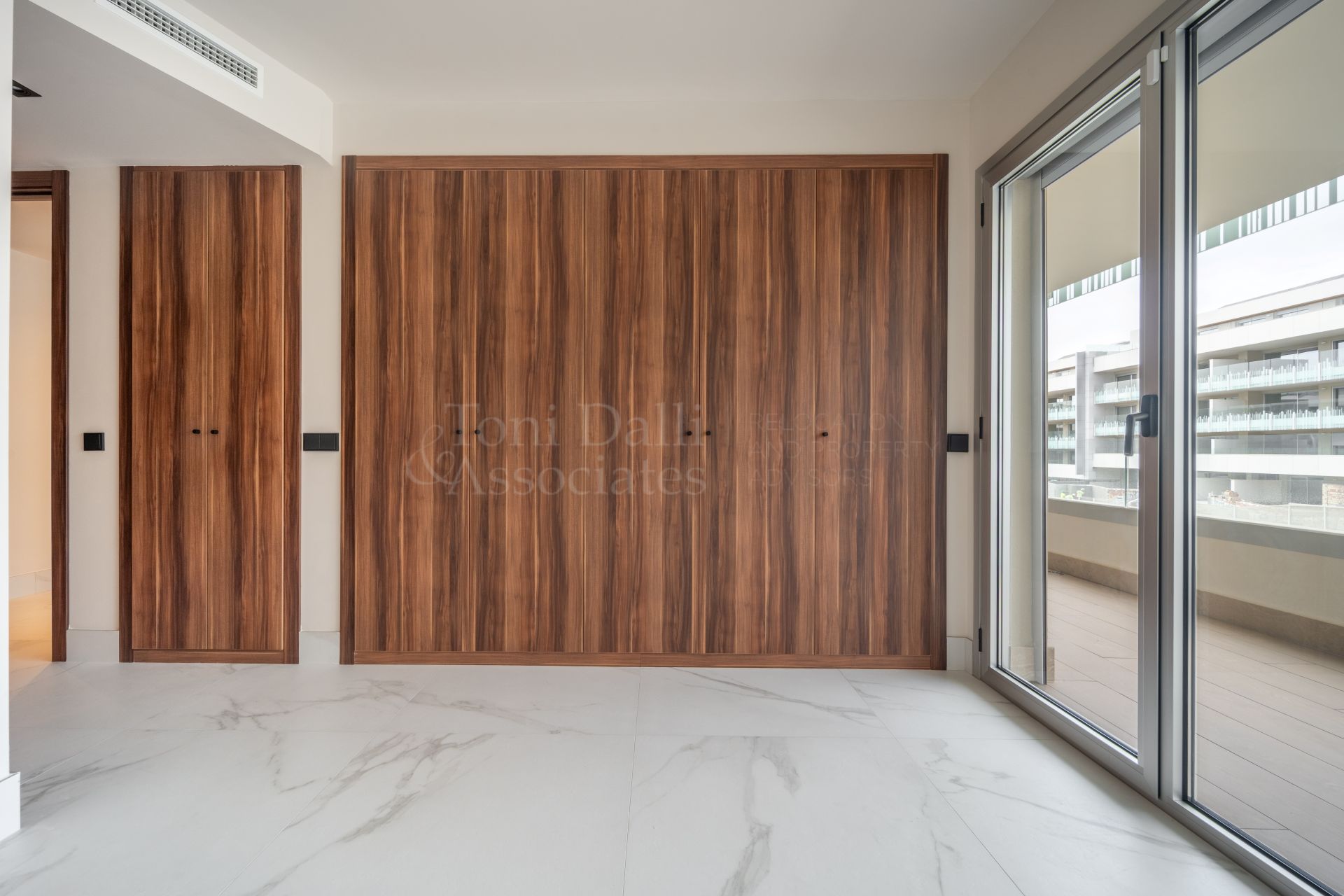 The living area opens onto a spacious covered terrace, perfectly designed for al fresco dining and a chill-out lounge area. Whether enjoying a quiet morning coffee or hosting friends for dinner, this outdoor space enhances the apartment’s appeal year-round. En-suite master bedroom with direct access to the main terrace, plus two additional bedrooms sharing a bathroom, one of which also has access to the terrace.