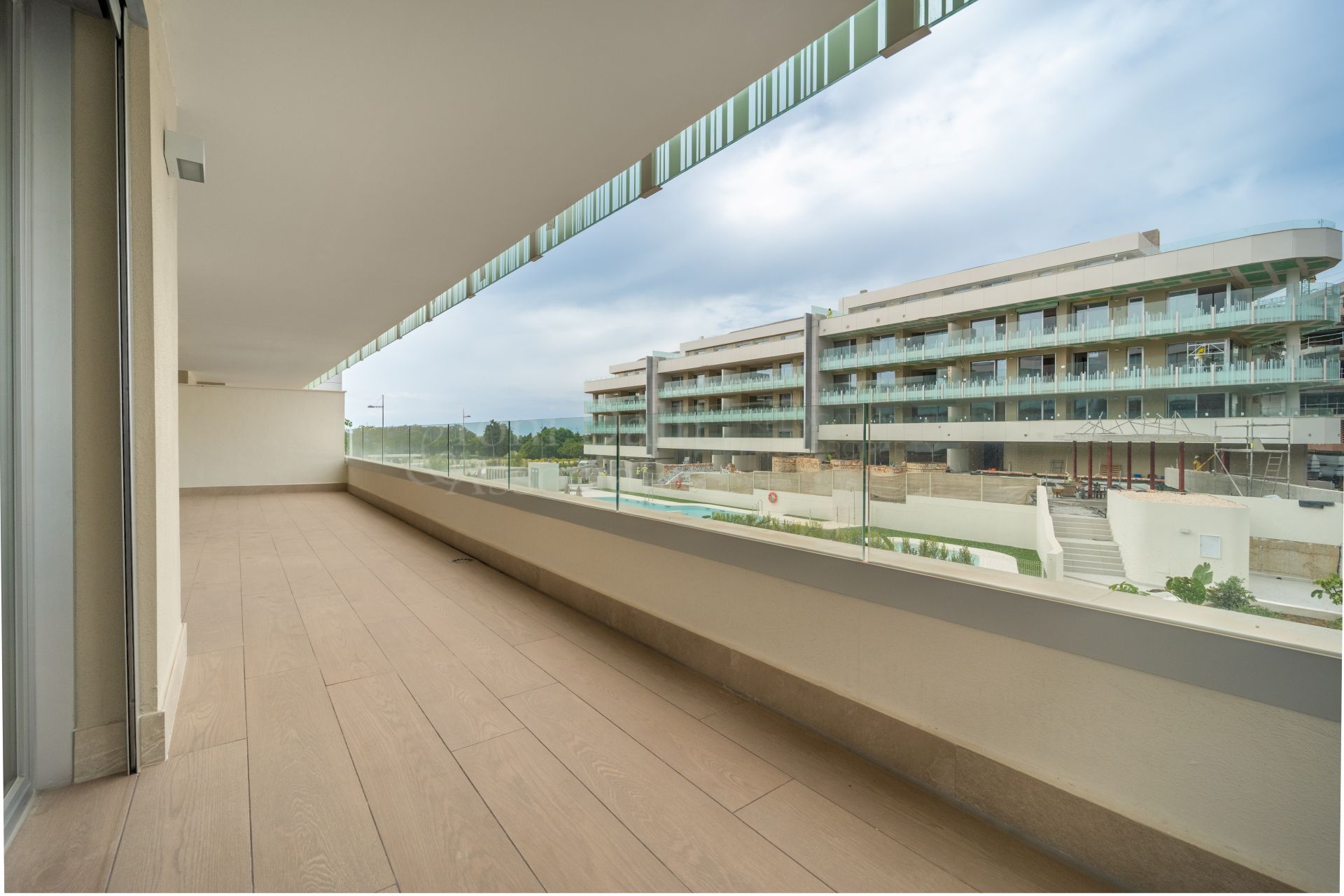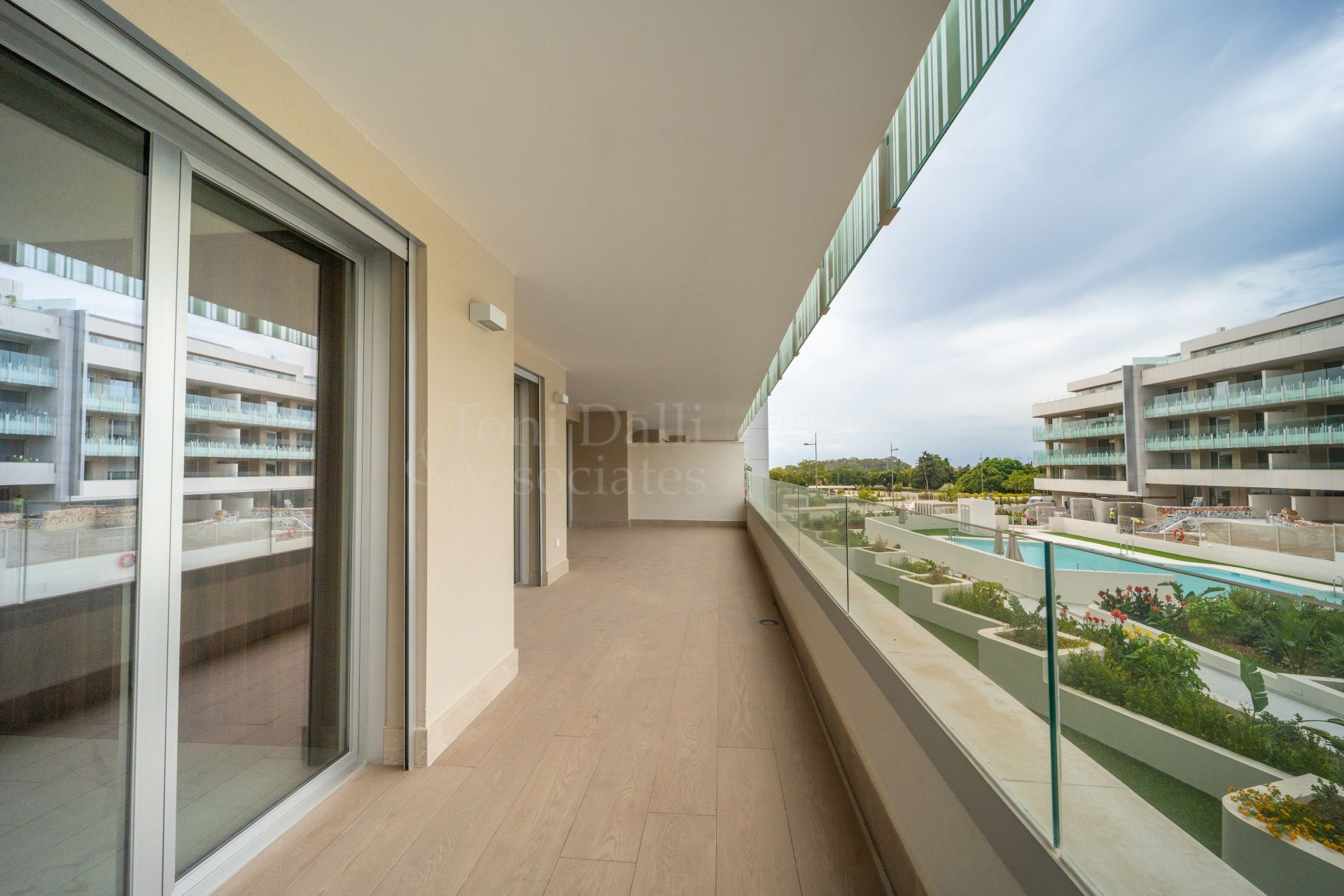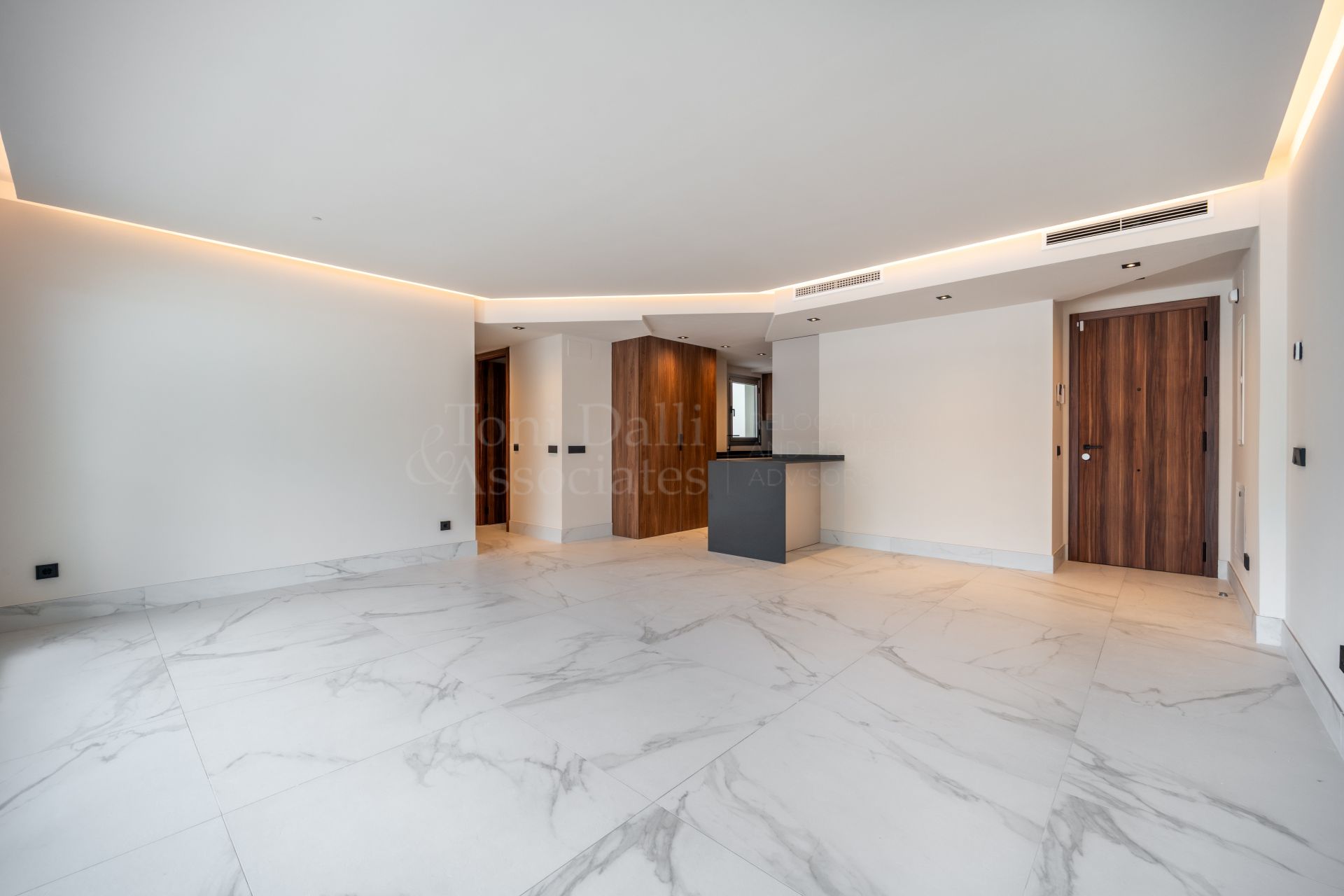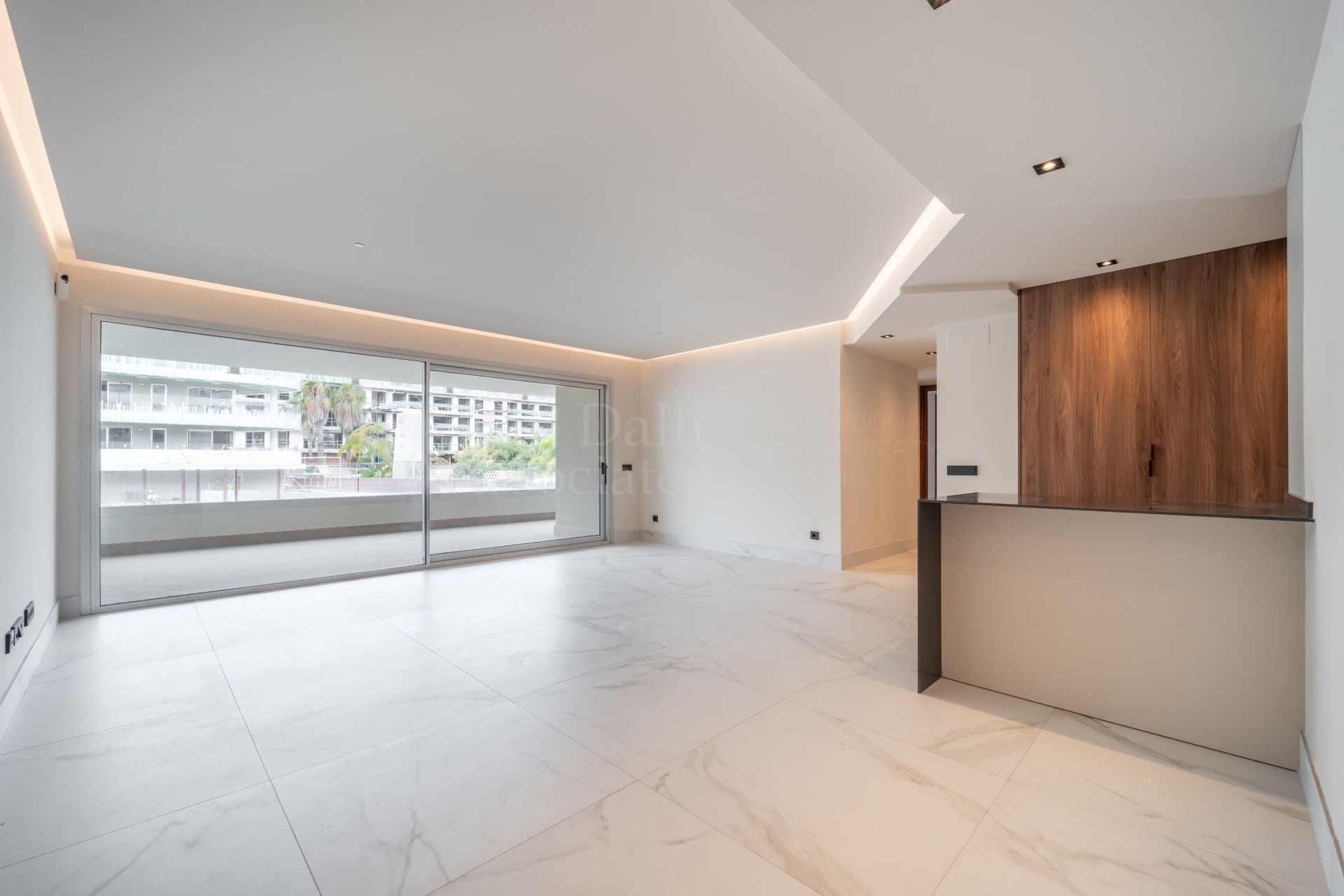 The living area opens onto a spacious covered terrace, perfectly designed for al fresco dining and a chill-out lounge area. Whether enjoying a quiet morning coffee or hosting friends for dinner, this outdoor space enhances the apartment’s appeal year-round. En-suite master bedroom with direct access to the main terrace, plus two additional bedrooms sharing a bathroom, one of which also has access to the terrace.