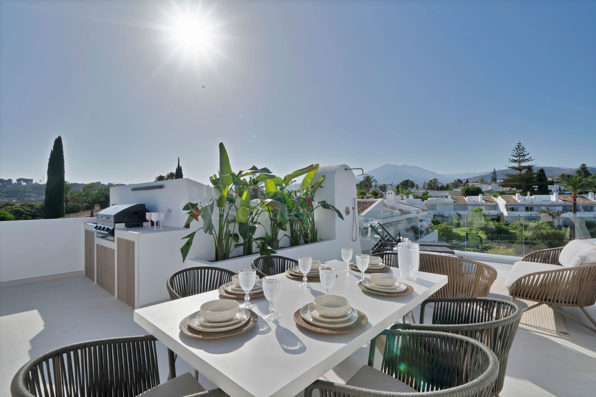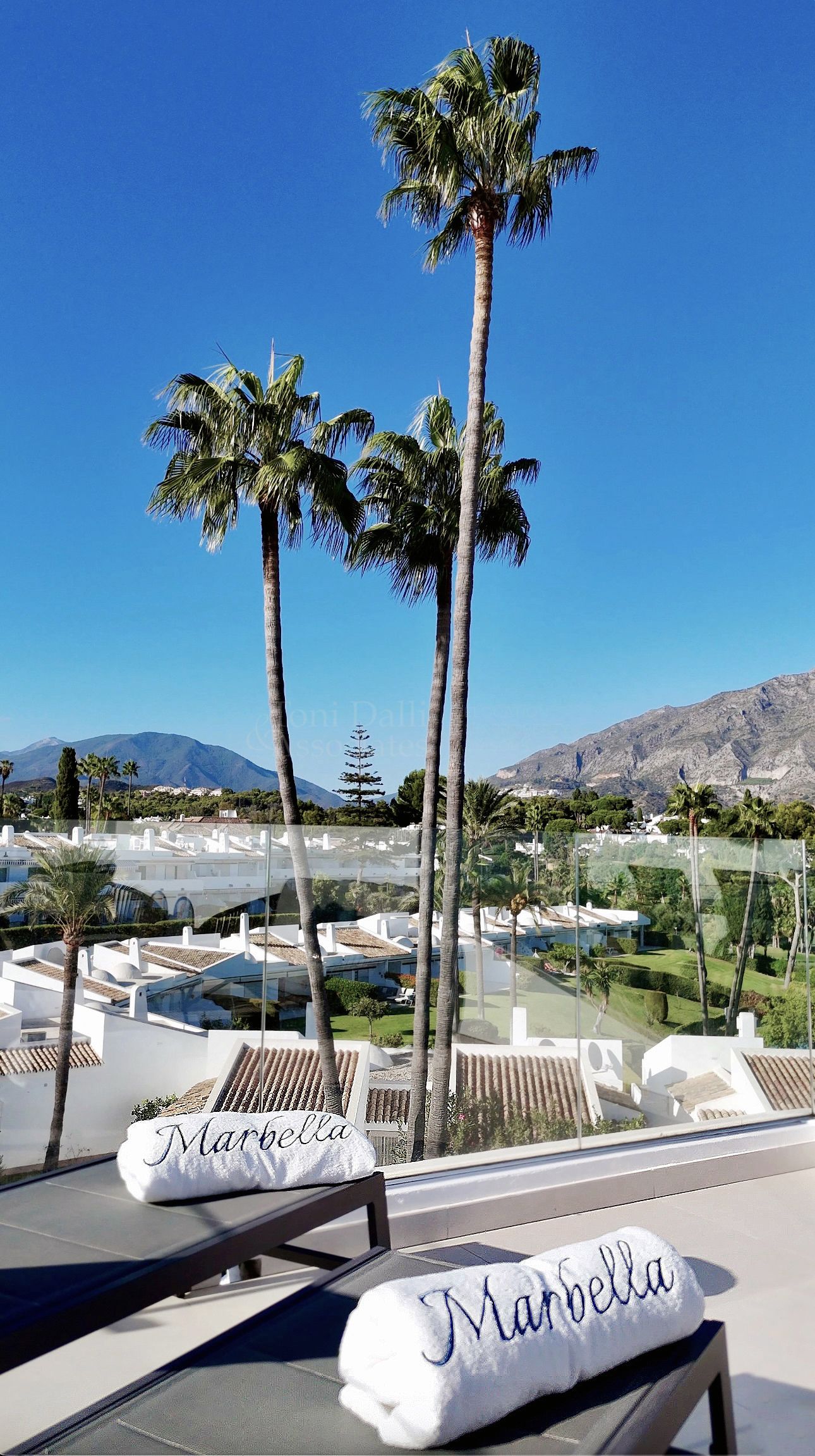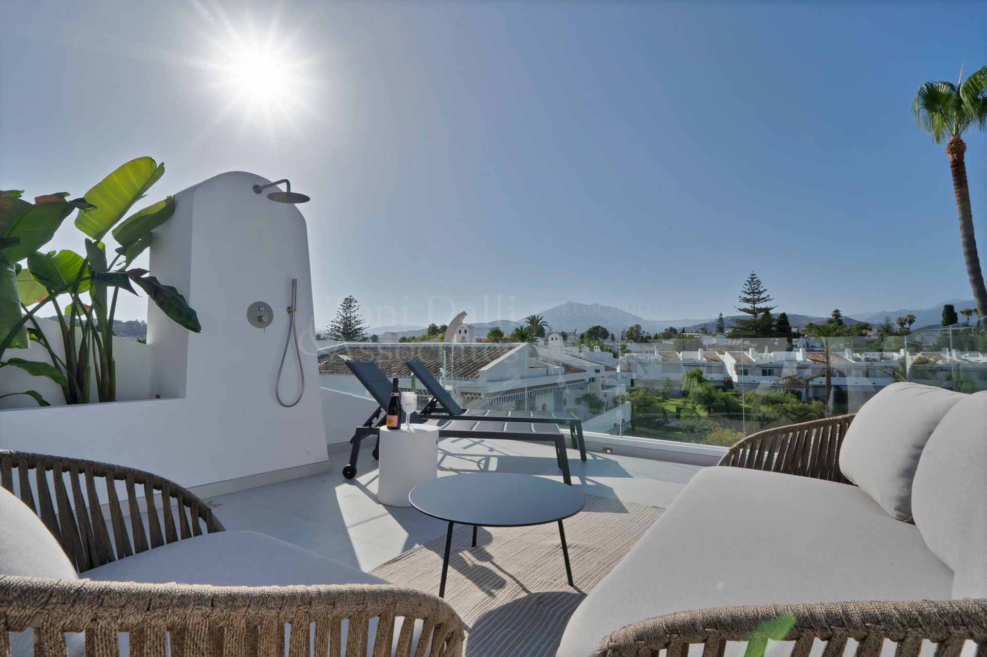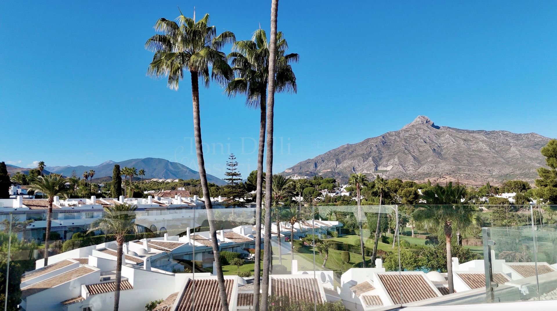 Located in the sought-after area of Aloha, within the prestigious Nueva Andalucía Golf Valley, this beautifully renovated duplex penthouse offers a unique blend of style, comfort, and exceptional views. Set within a secure, gated community, this east-facing residence enjoys stunning vistas over manicured golf courses and the surrounding mountains — a peaceful and picturesque backdrop to everyday living.