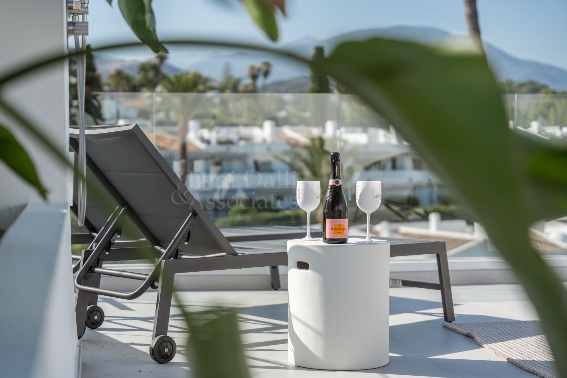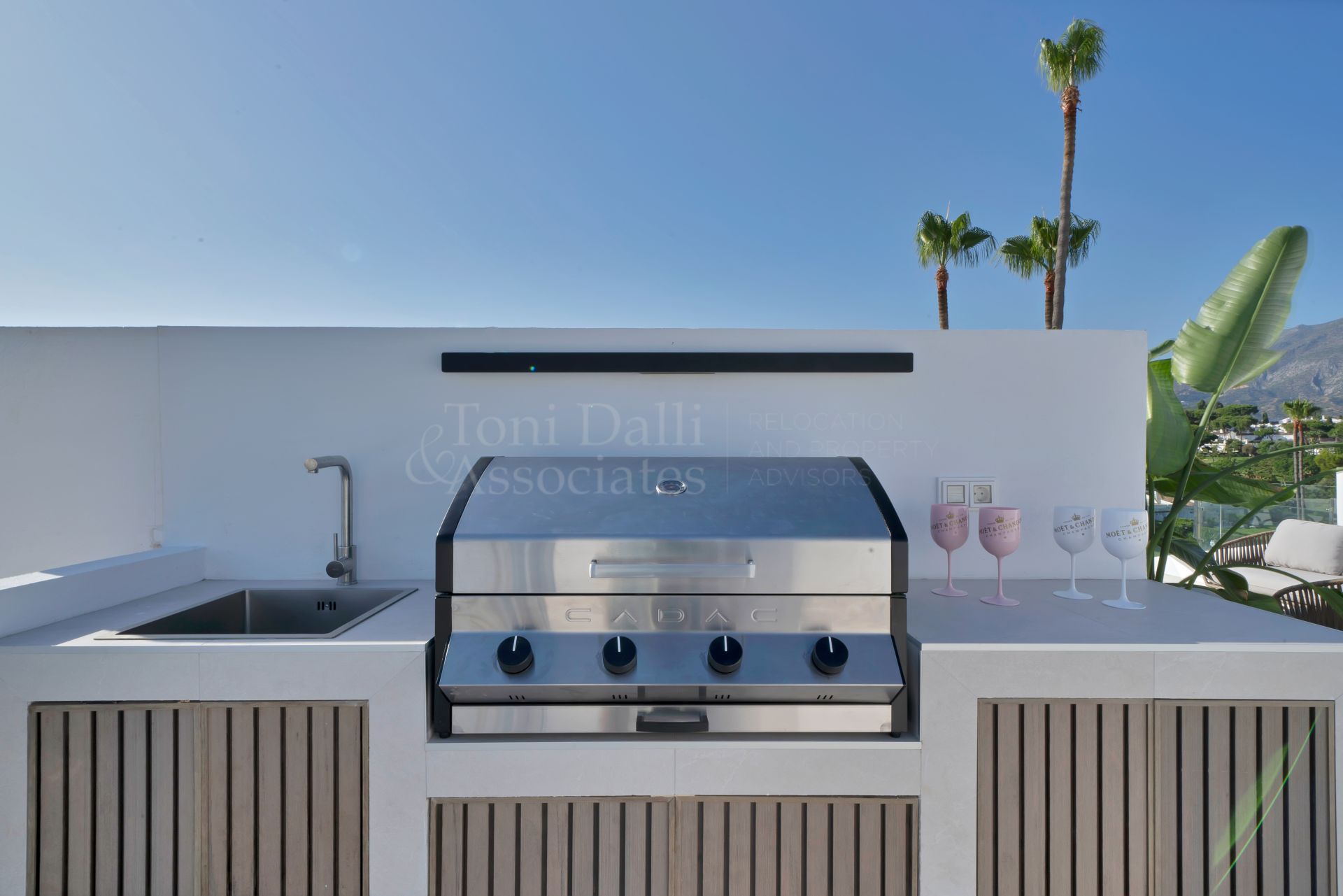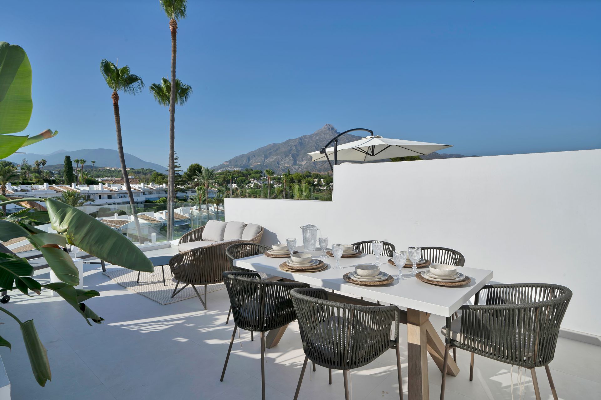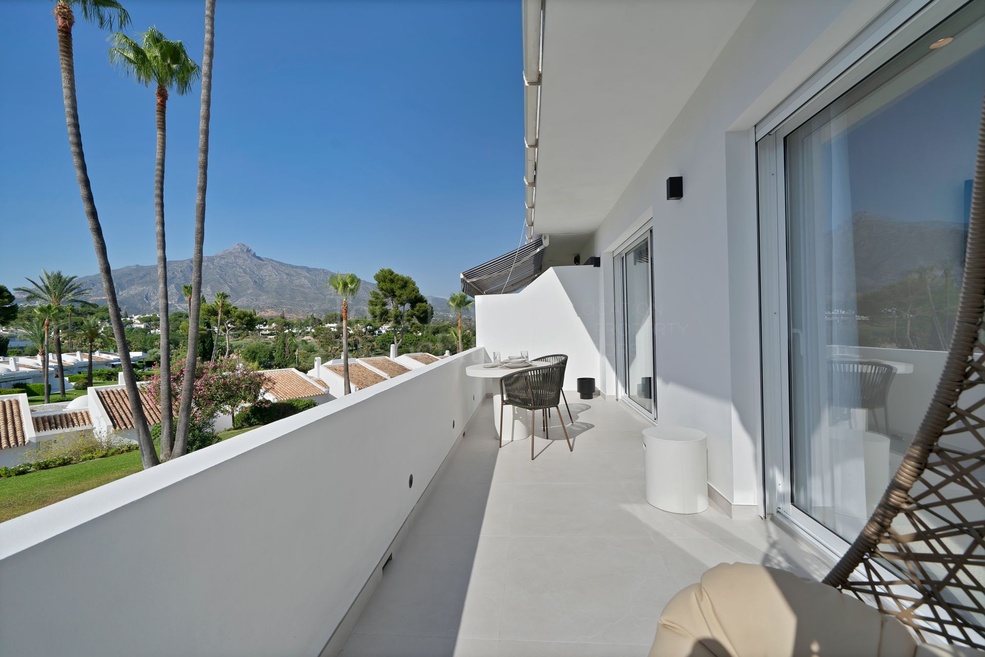 Located in the sought-after area of Aloha, within the prestigious Nueva Andalucía Golf Valley, this beautifully renovated duplex penthouse offers a unique blend of style, comfort, and exceptional views. Set within a secure, gated community, this east-facing residence enjoys stunning vistas over manicured golf courses and the surrounding mountains — a peaceful and picturesque backdrop to everyday living.
