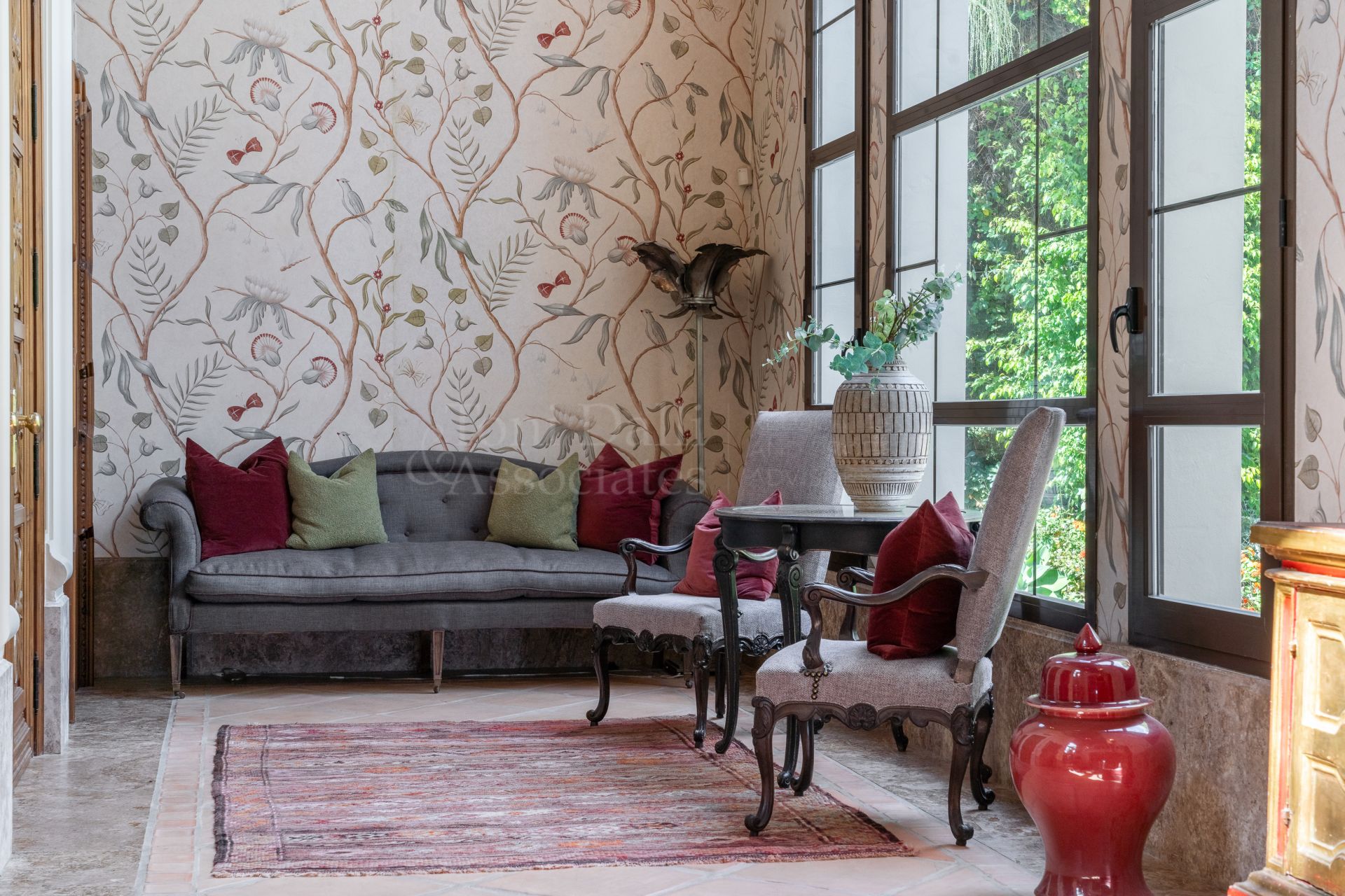 An elegant hallway leads, on the left wing, to a spacious bedroom with en-suite bathroom and built-in wardrobes. On the right side, there is an independent, fully equipped kitchen with a daily dining area, designed for culinary creativity and warm family gatherings. Opposite the kitchen is the large independent dining room, perfect for celebrations and special occasions. The tour culminates in a generously sized living room, divided into three areas, two of which are symmetrical, all connected to the covered porch, the pool, and the manicured garden through large windows with electric shutters and security glass.