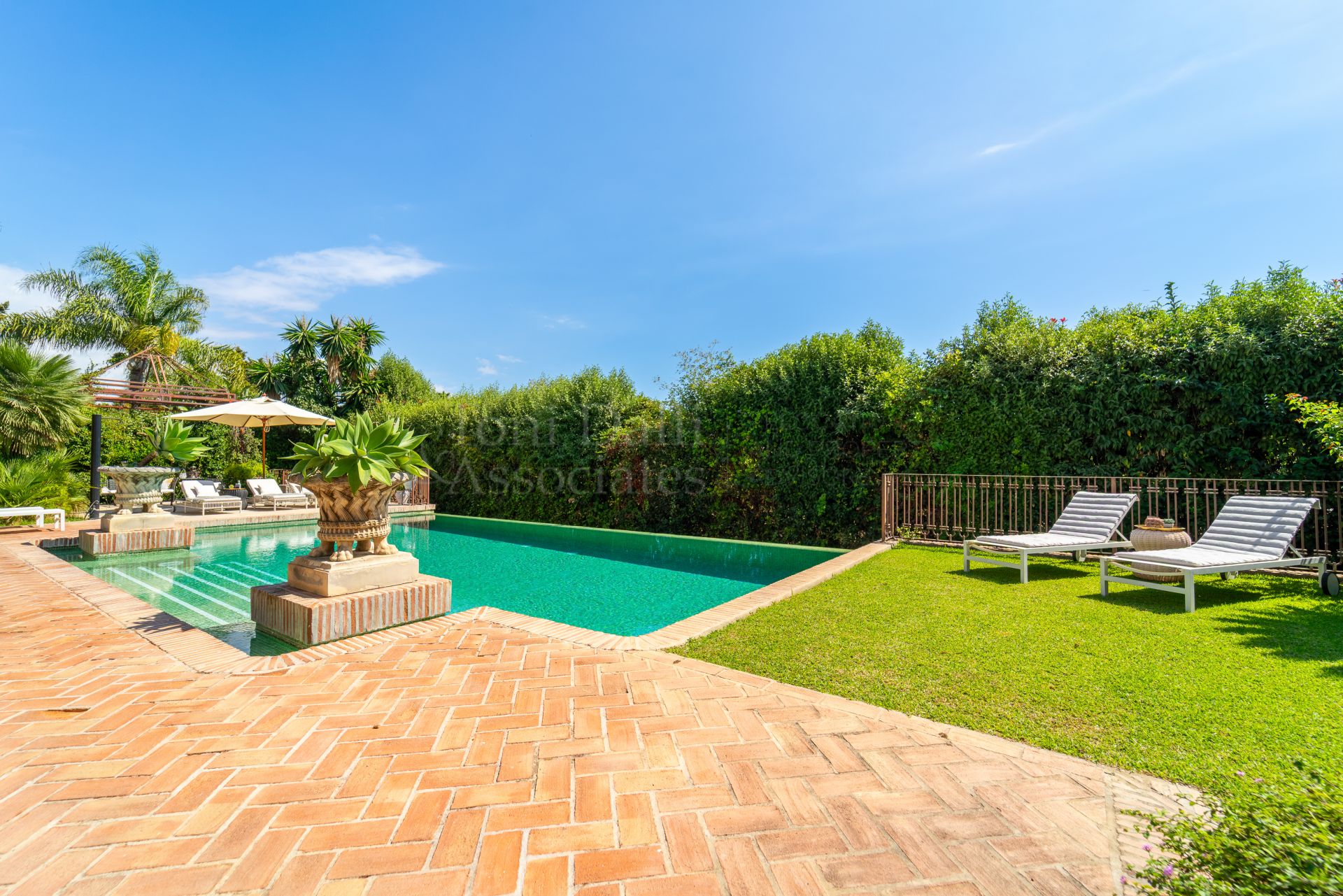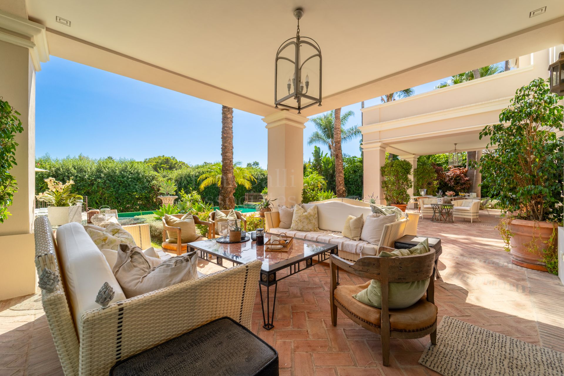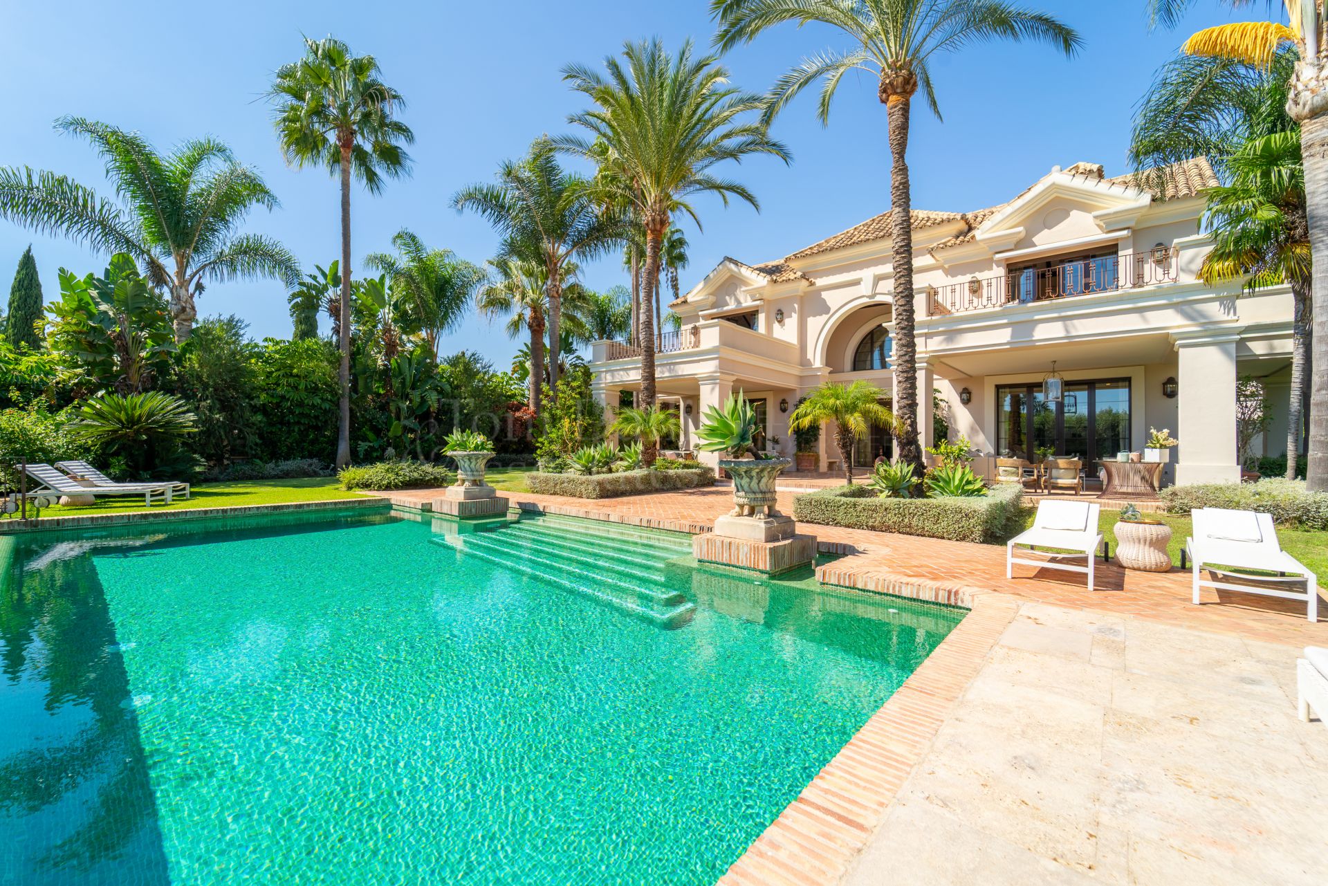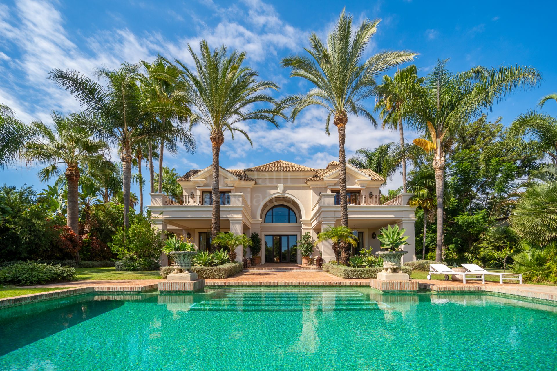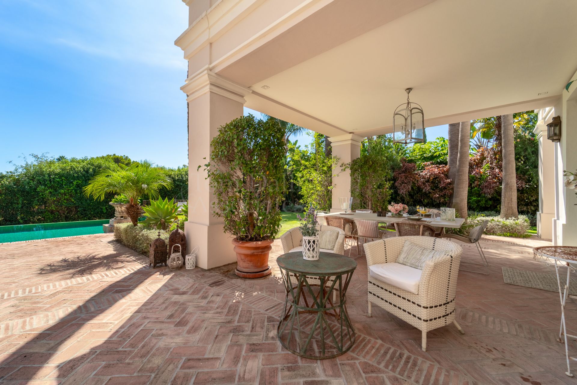 Located in the tranquil and exclusive area of Guadalmina Baja, just steps from the beach and accessed via a one-way street that ensures privacy and discretion, stands this imposing classic-style villa with timeless elegance and unique charm.