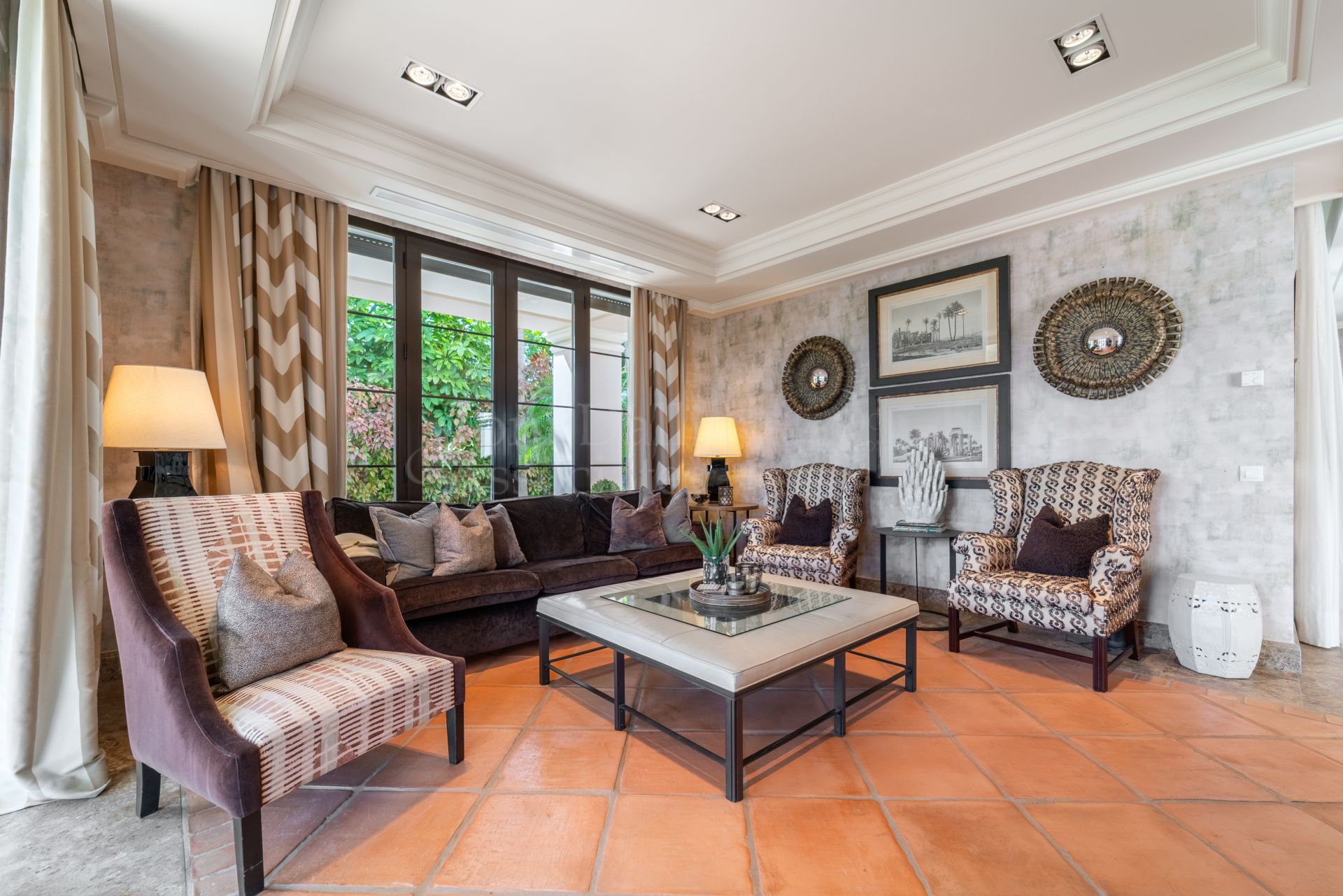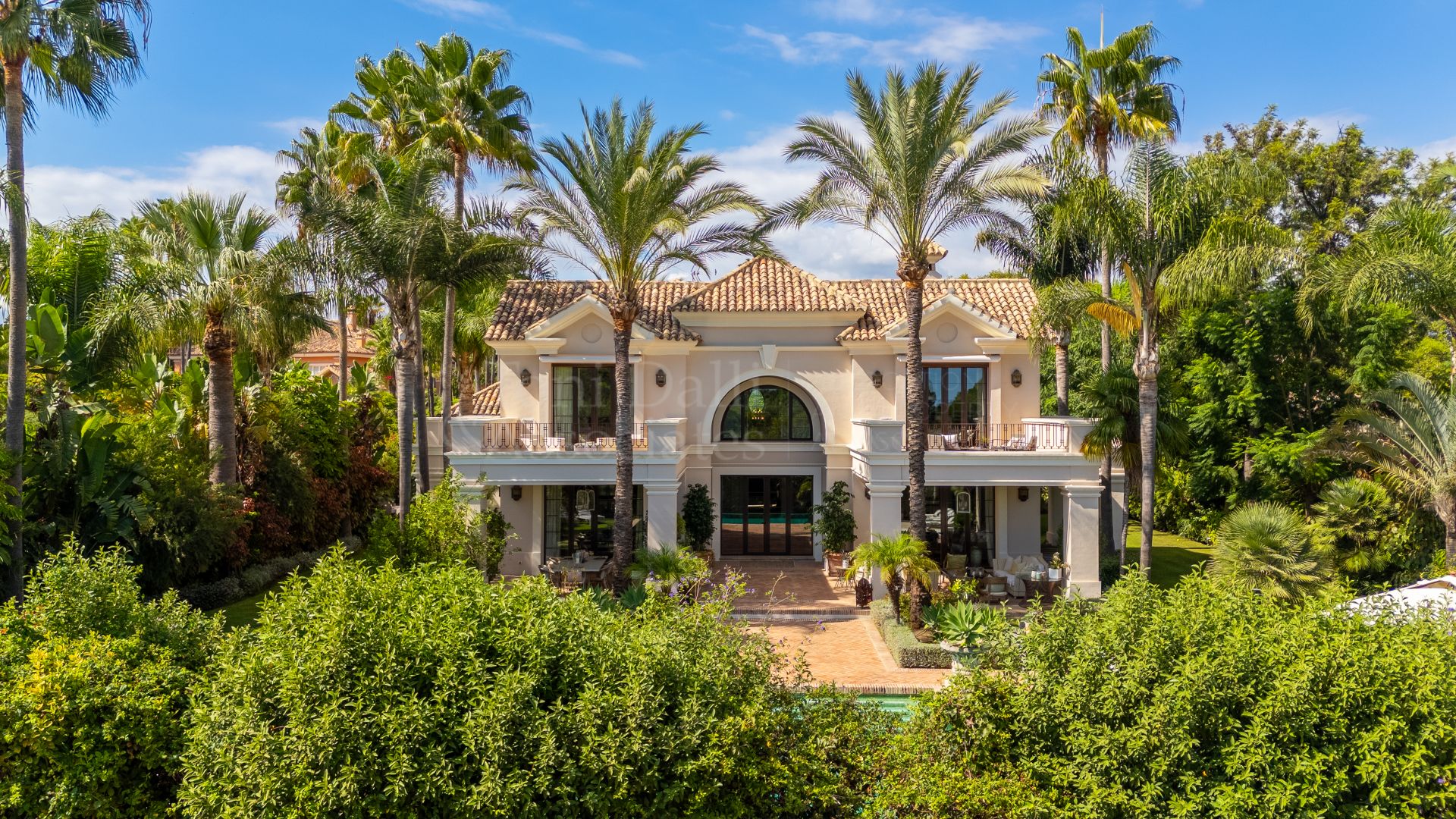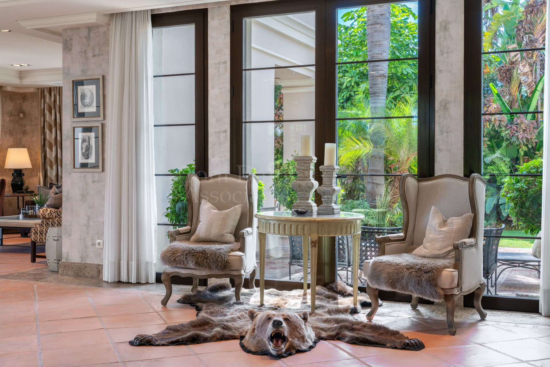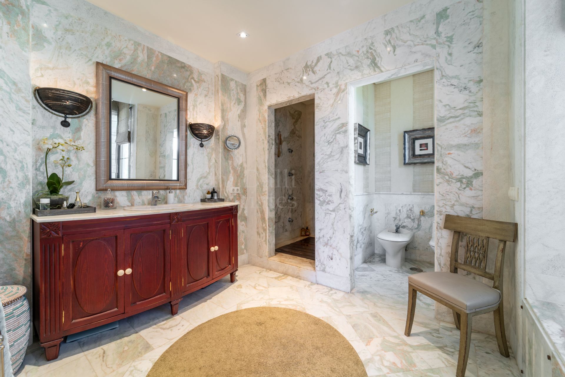 Located in the tranquil and exclusive area of Guadalmina Baja, just steps from the beach and accessed via a one-way street that ensures privacy and discretion, stands this imposing classic-style villa with timeless elegance and unique charm.