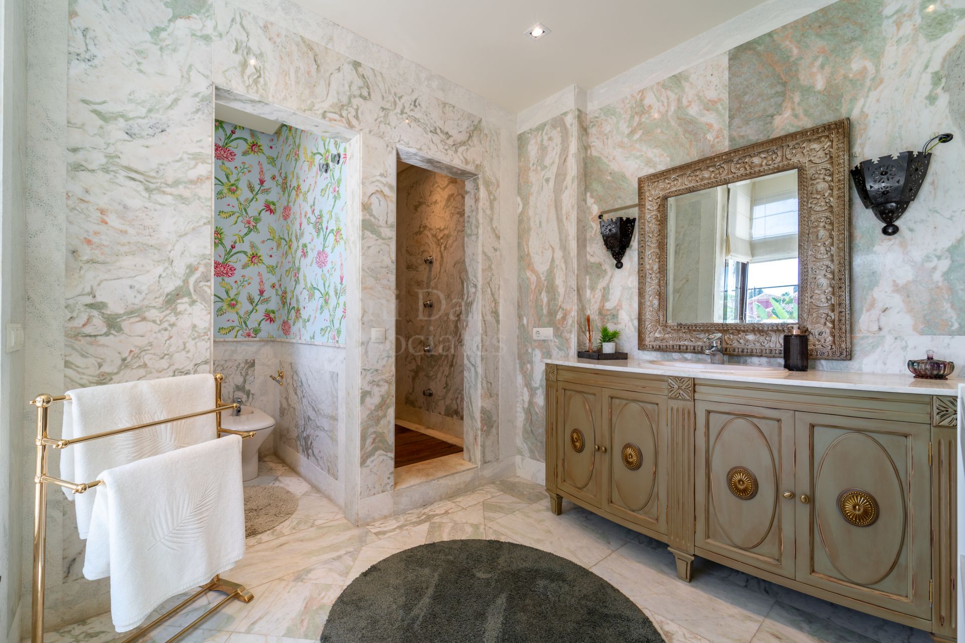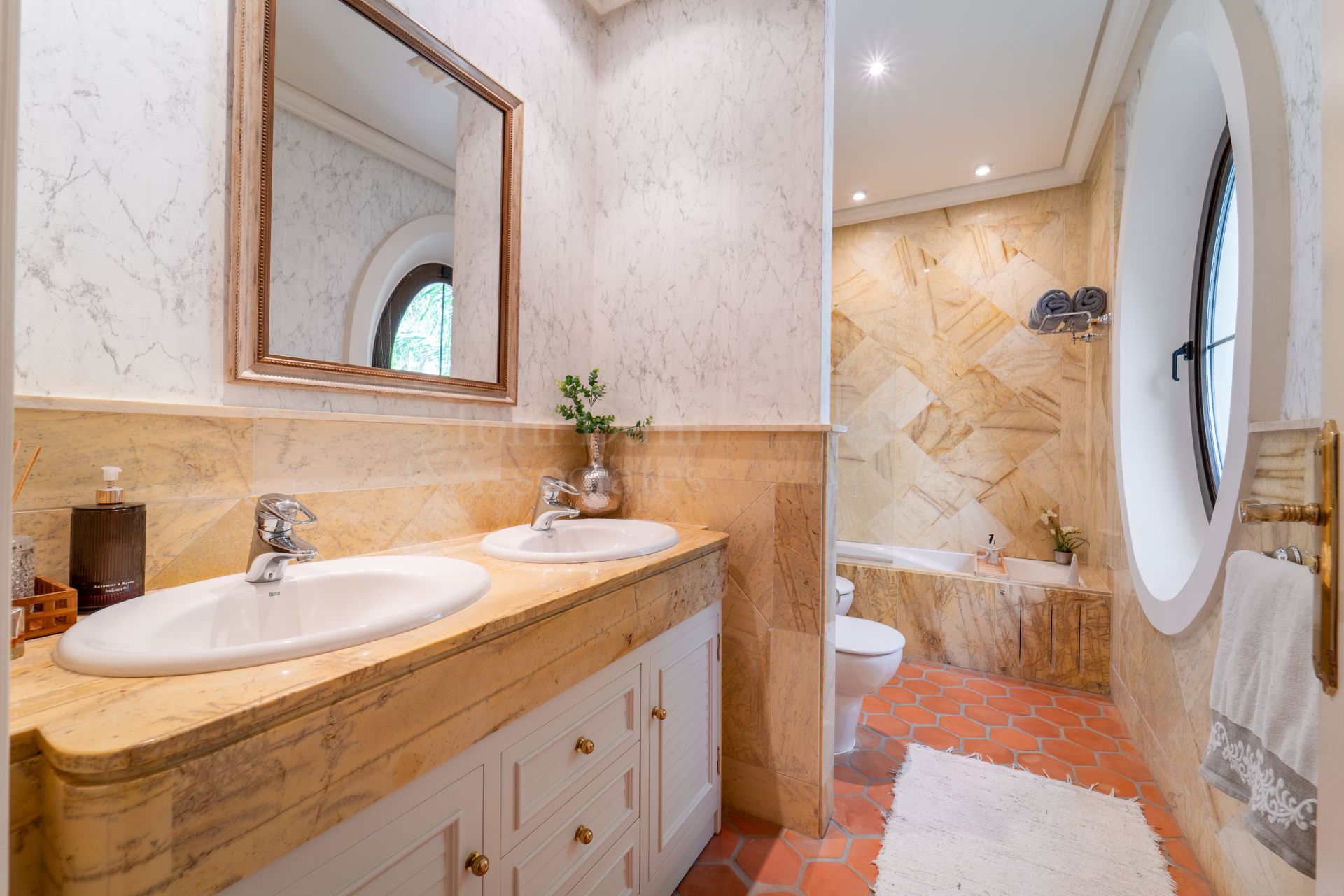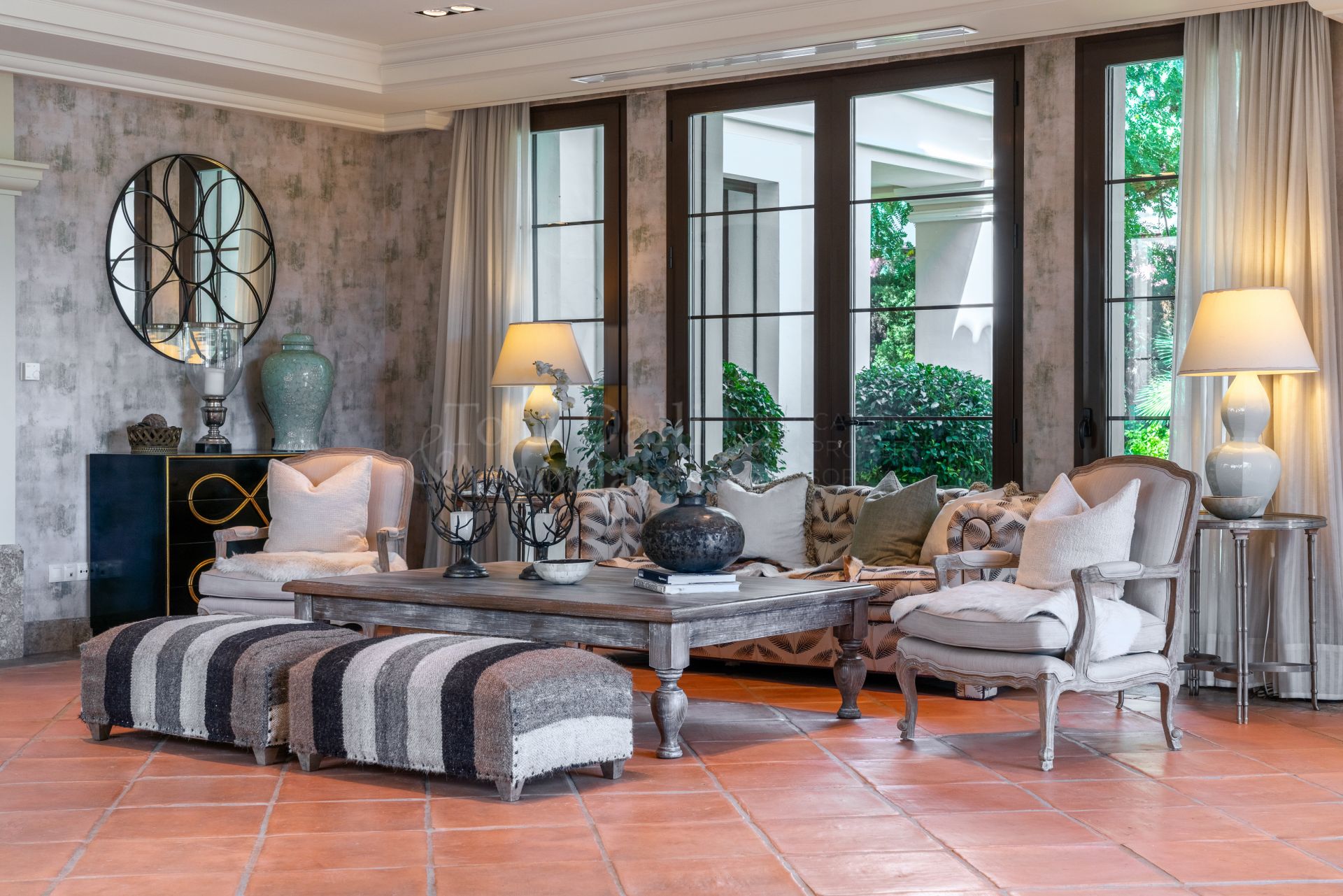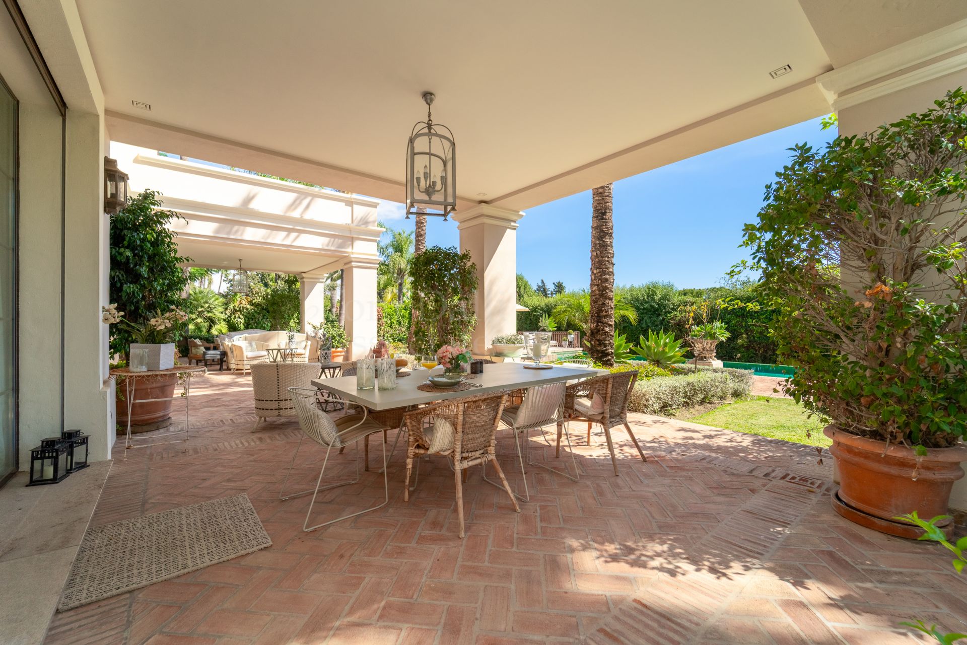 Located in the tranquil and exclusive area of Guadalmina Baja, just steps from the beach and accessed via a one-way street that ensures privacy and discretion, stands this imposing classic-style villa with timeless elegance and unique charm.