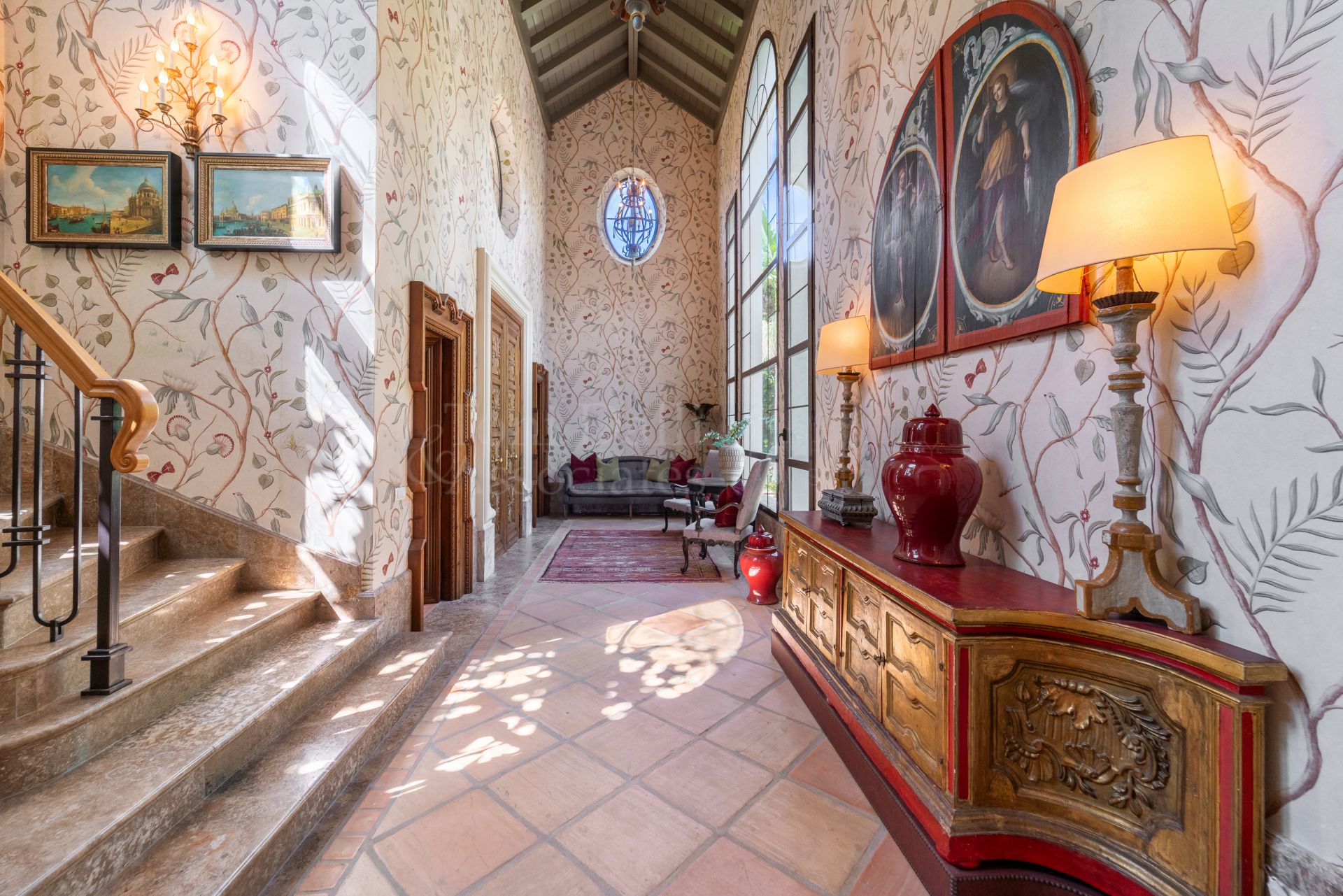 Upon entering the villa, a bright entrance hall with double-height ceilings and wooden beams sets the sophisticated tone of the home. In this same area, there is a guest toilet and a practical storage room, ideal for shoes, coats, and accessories.