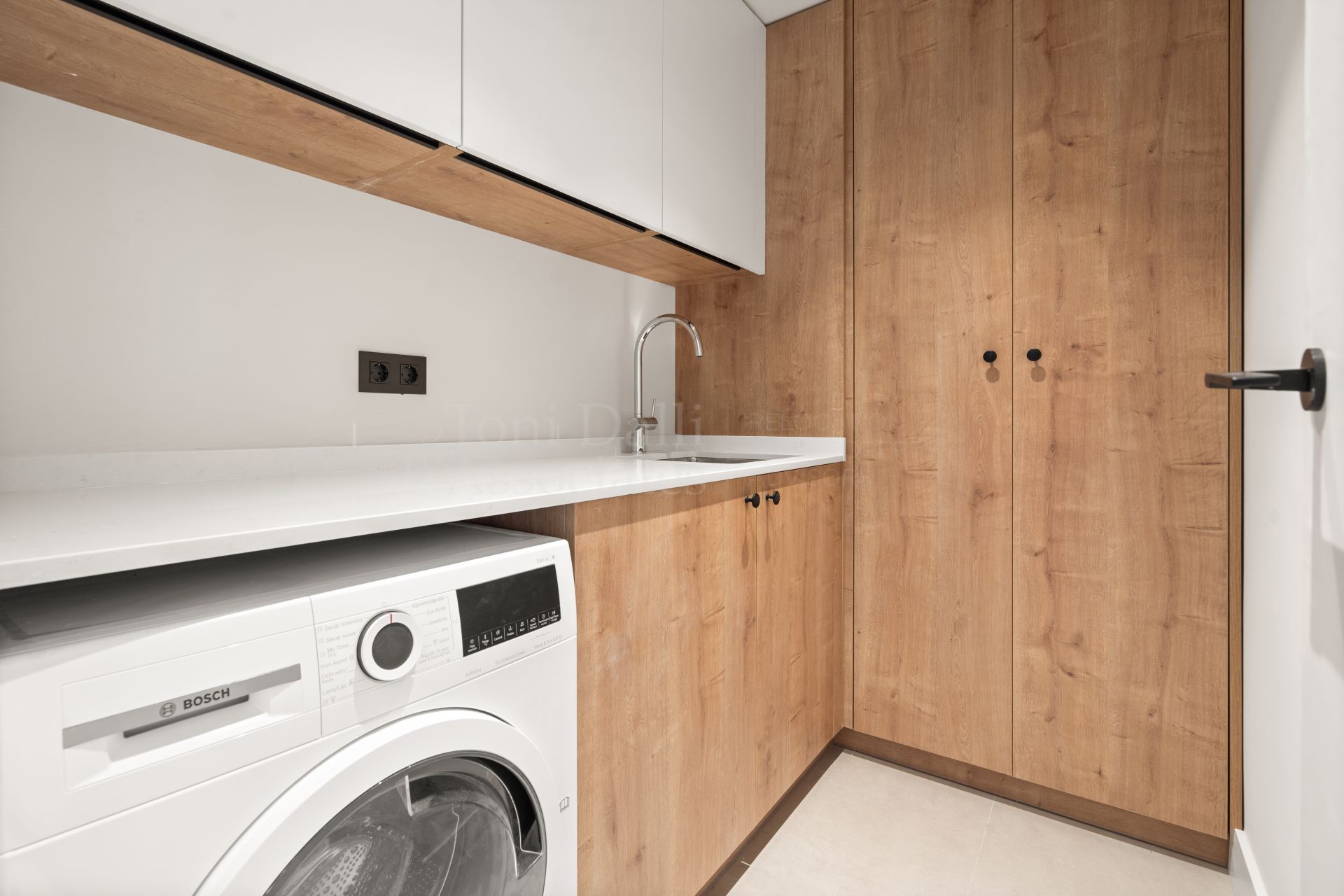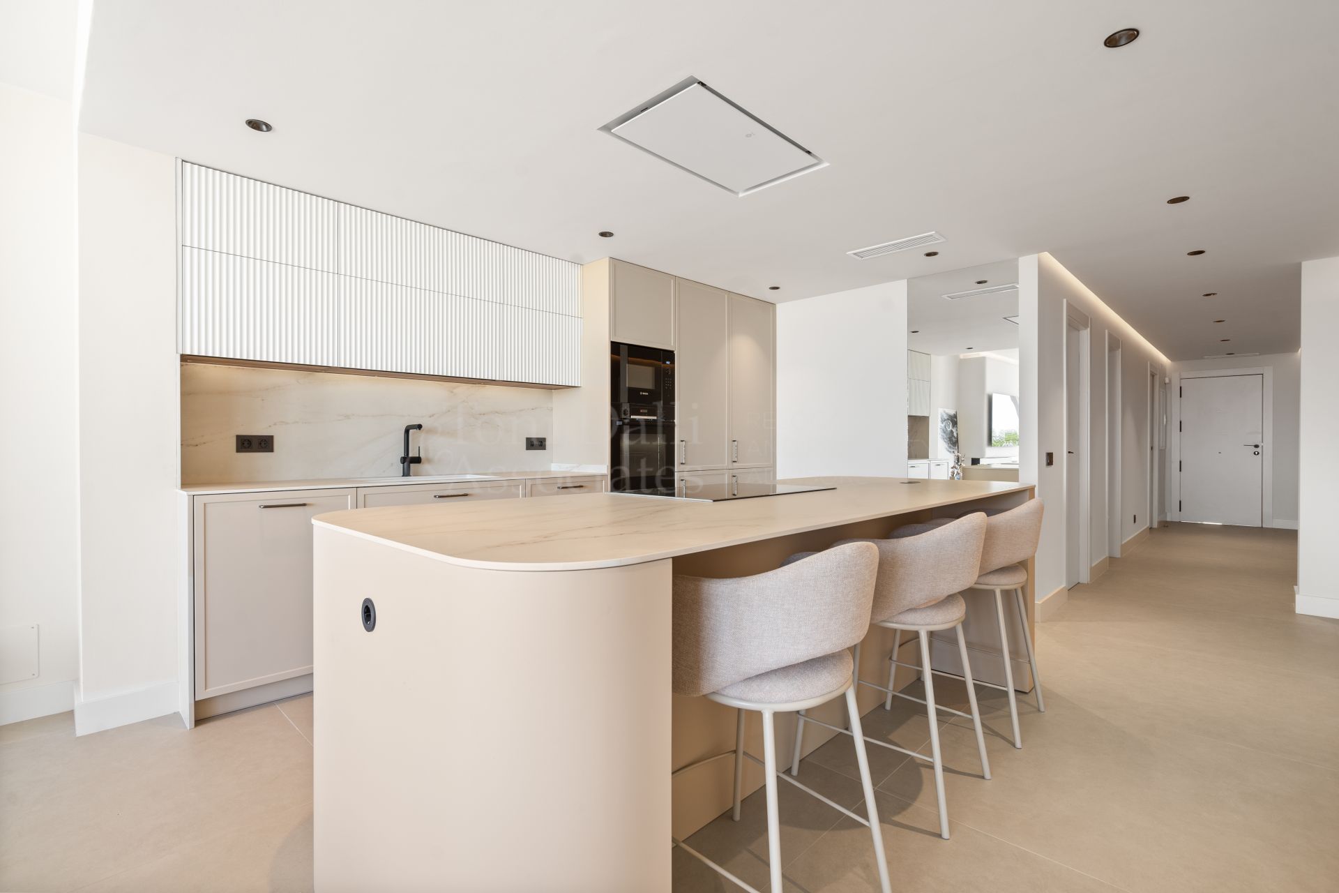 Fully renovated to the highest standards, this bright three-bedroom, three-bathroom home features premium finishes and a contemporary open-plan layout that creates a seamless flow between indoor and outdoor living. With a total built size of 184 m², the apartment offers spacious interiors designed with natural tones and high-end materials, providing both style and functionality.