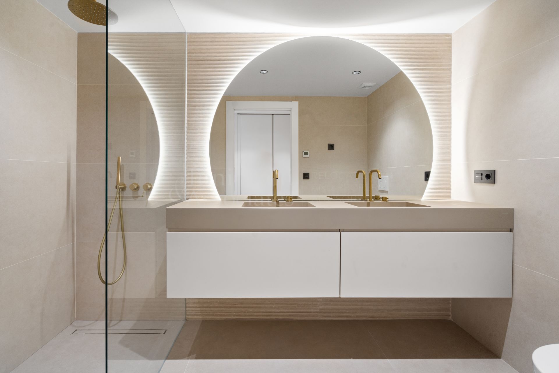 Each of the three bedrooms has been thoughtfully designed to offer comfort and tranquility. The master suite enjoys direct access to the terrace and includes bespoke built-in wardrobes. The other two bedrooms are equally spacious, ideal for family or guests. All three bathrooms are beautifully appointed with top-quality porcelain tiles, modern Italian fixtures, and integrated lighting that adds a touch of luxury.