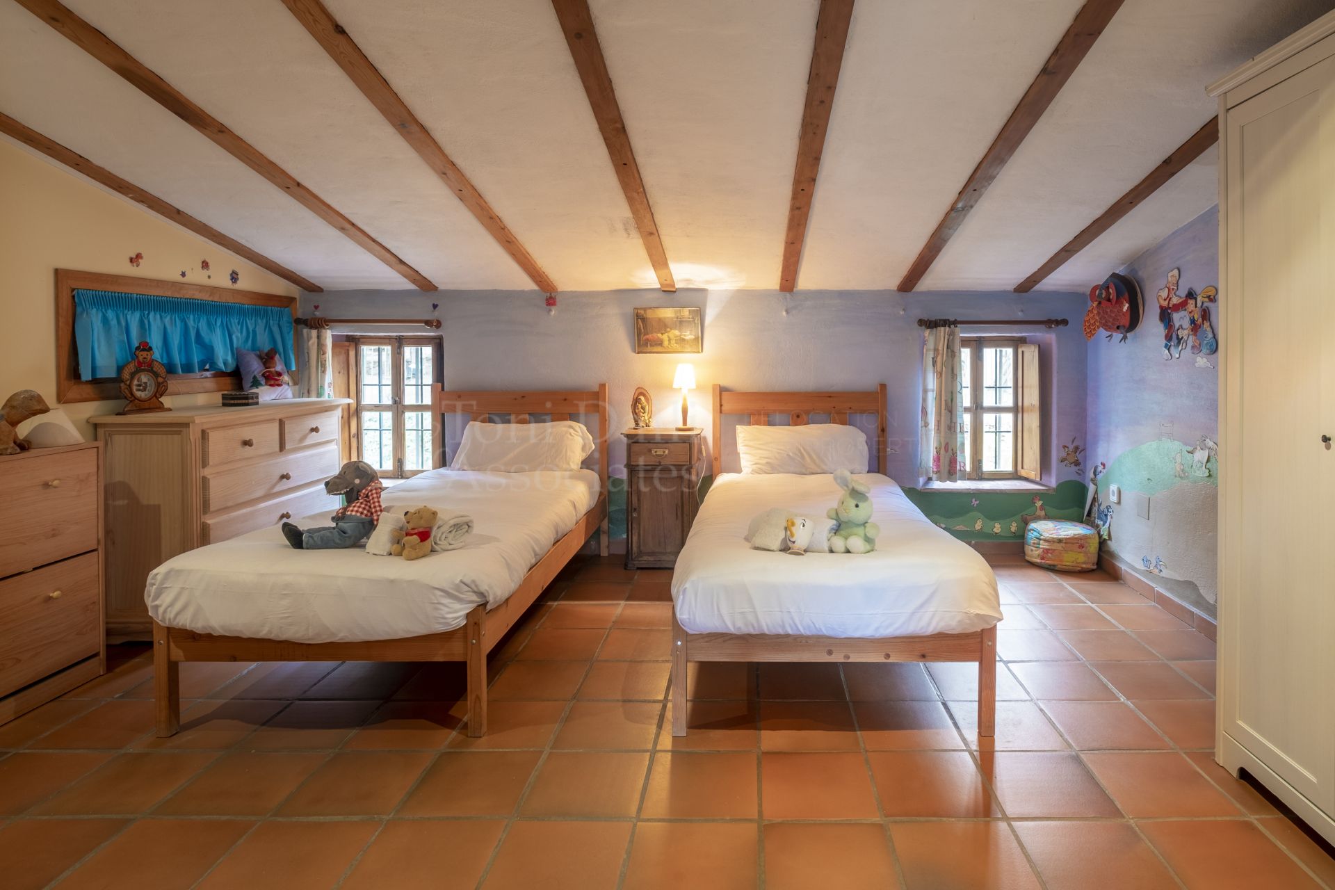 The upper floor offers additional comfort and space. At the top of the staircase, a landing leads to a very spacious bedroom with air conditioning and breathtaking views of the valley and surrounding mountains. There is also a charming children’s bedroom, also with air conditioning, and a beautiful master suite complete with its own fireplace, dressing room, air conditioning, and a luxurious en-suite bathroom with a jacuzzi — the perfect retreat for relaxation.