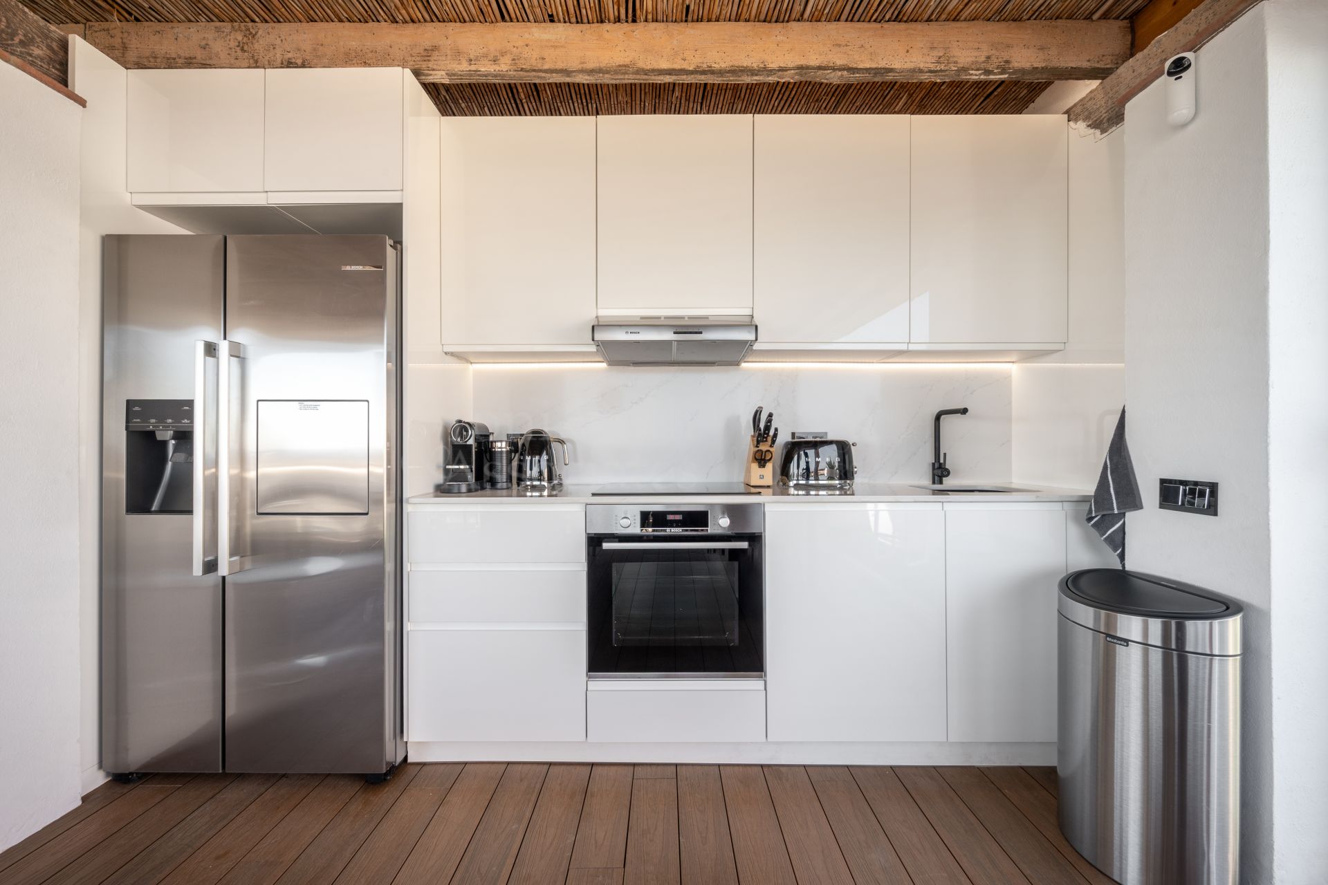 The upper level is dedicated entirely to the master suite, creating a sense of privacy and exclusivity. This elegant bedroom includes a modern en-suite bathroom and direct access to the spectacular rooftop terrace, which truly sets this property apart.