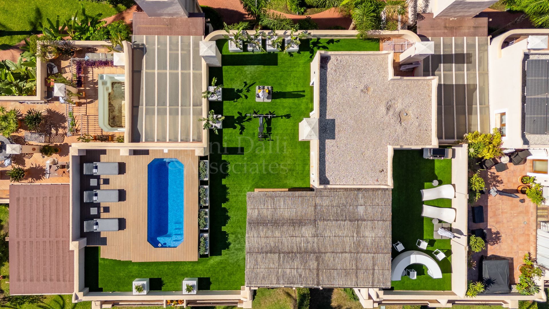 The rooftop area has been transformed into a private outdoor retreat, ideal for entertaining or relaxing throughout the year. Designed across several zones, it includes a bar area, a glass-enclosed dining and lounge space, and an impressive private pool surrounded by lush greenery, potted trees, and a spacious sunbathing terrace. From here, you can enjoy panoramic views of the mountains, the coastline, and the beautiful Mediterranean landscape — the perfect backdrop for warm evenings and gatherings with family or friends.