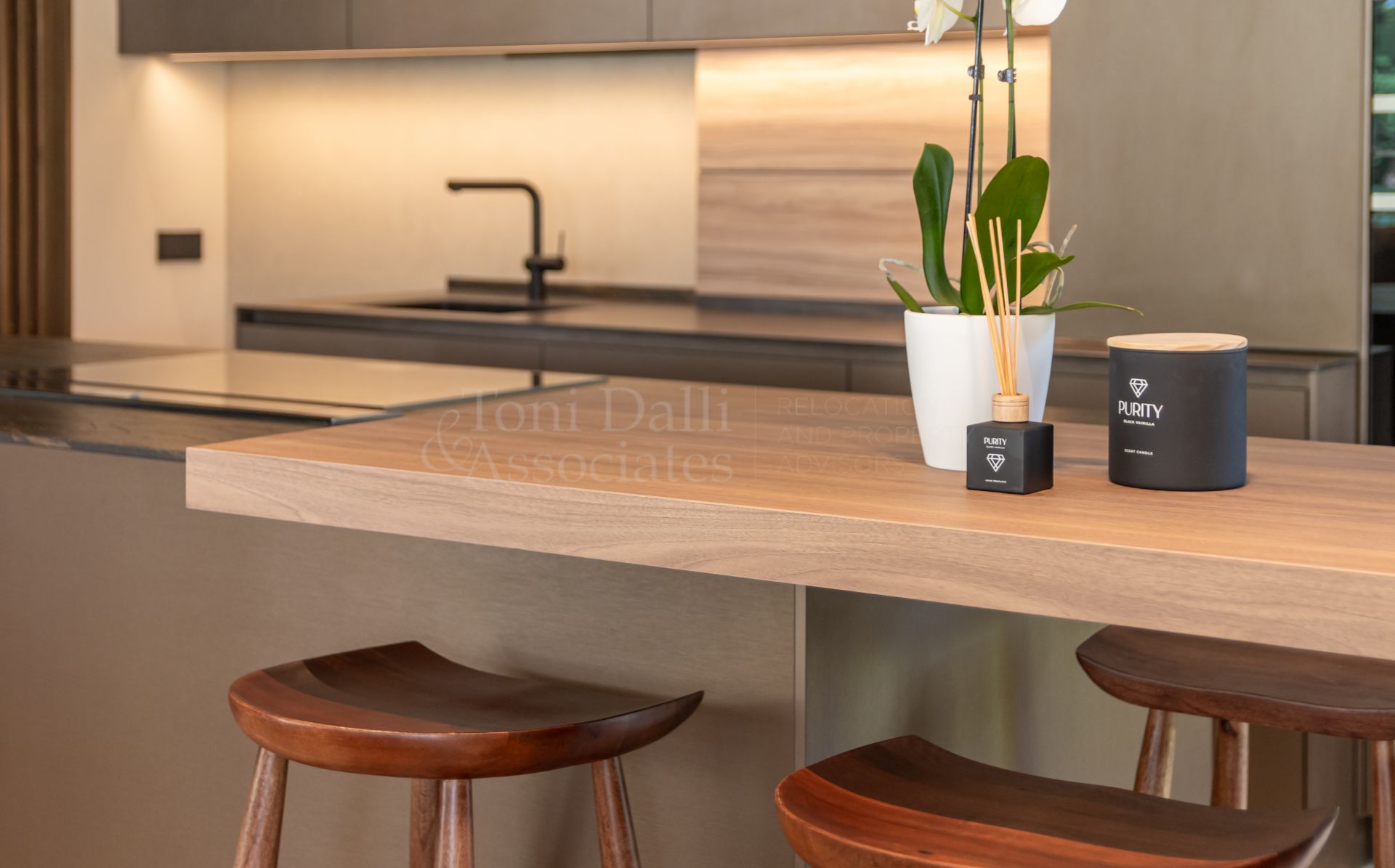 With a built area of 734 m², the villa offers spacious interiors filled with natural light and refined finishes. The design blends modern open spaces with warm materials such as natural wood and stone, enhancing its inviting Mediterranean atmosphere. The main living area features a generous open-plan layout connecting the living room, dining area, and a stylish kitchen equipped with Siemens appliances. Large windows and glass doors open onto the terraces, seamlessly linking indoor and outdoor spaces for a relaxed and functional lifestyle.