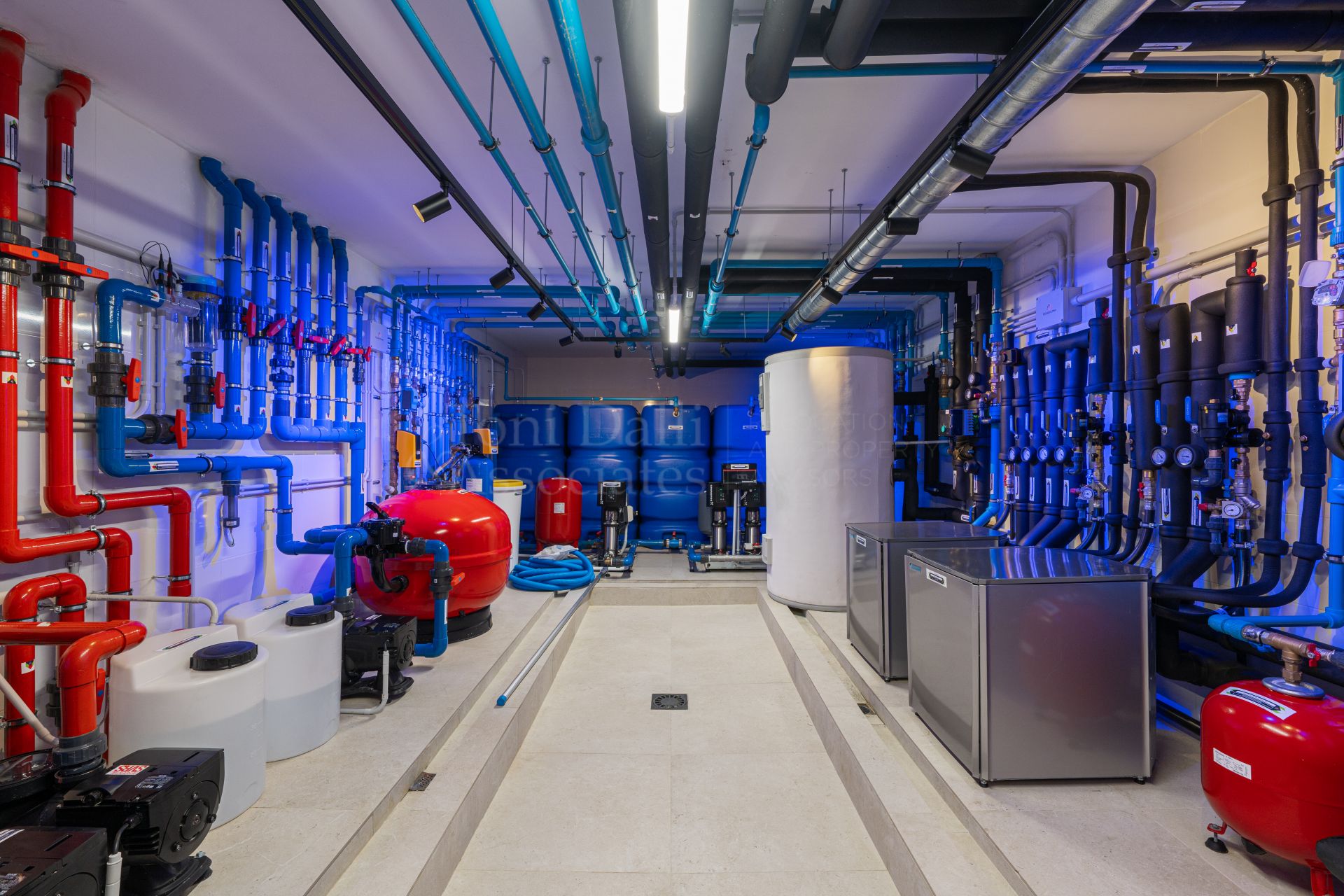 The lower level of the villa is dedicated to leisure and wellbeing. Here, residents and guests can enjoy a fully equipped spa area with an indoor heated pool, a sauna, and a modern gym. The same floor includes a stylish entertainment lounge featuring a bespoke bar, ideal for social gatherings and relaxation. A comfortable guest bedroom with en-suite bathroom, a laundry area, and a custom-designed machine room by Proinsermant complete this level, reflecting the villa’s high technical standards and efficient layout.