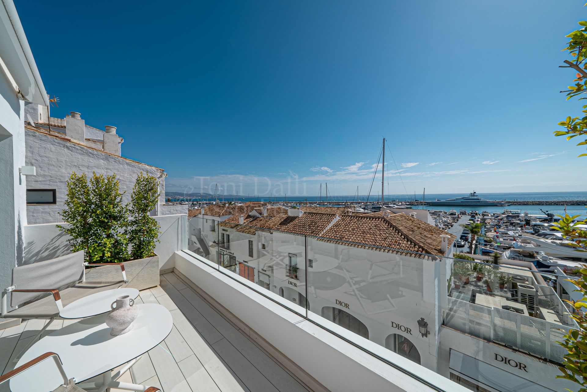 The property encompasses a total built area of 273.5 m², including 217.75 m² of beautifully designed interior space and a 55.75 m² terrace. The terrace is a highlight of the home, providing the perfect setting to relax, dine outdoors, or entertain while overlooking the Mediterranean Sea and the lively Puerto Banús marina. Every detail has been carefully considered to create a residence that feels both sophisticated and welcoming.