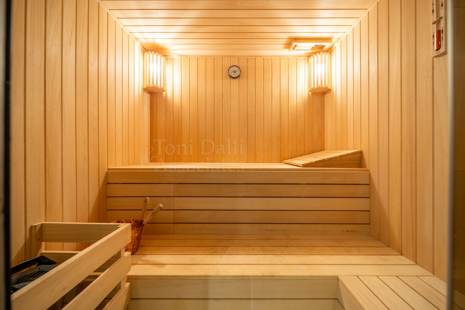 The outdoor spaces are truly exceptional. The mature Mediterranean garden, meticulously maintained and filled with lush vegetation, provides complete privacy and creates an environment of remarkable natural beauty. The heated pool with electric cover presides over an elegant terrace with a dedicated chill-out area, ideal for outdoor entertaining or quiet relaxation. Sophisticated landscape lighting transforms the garden into a charming retreat after sunset.