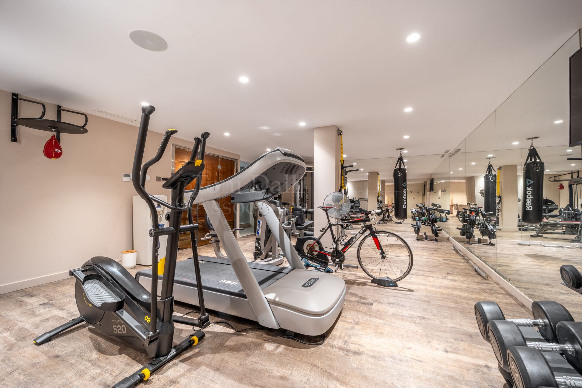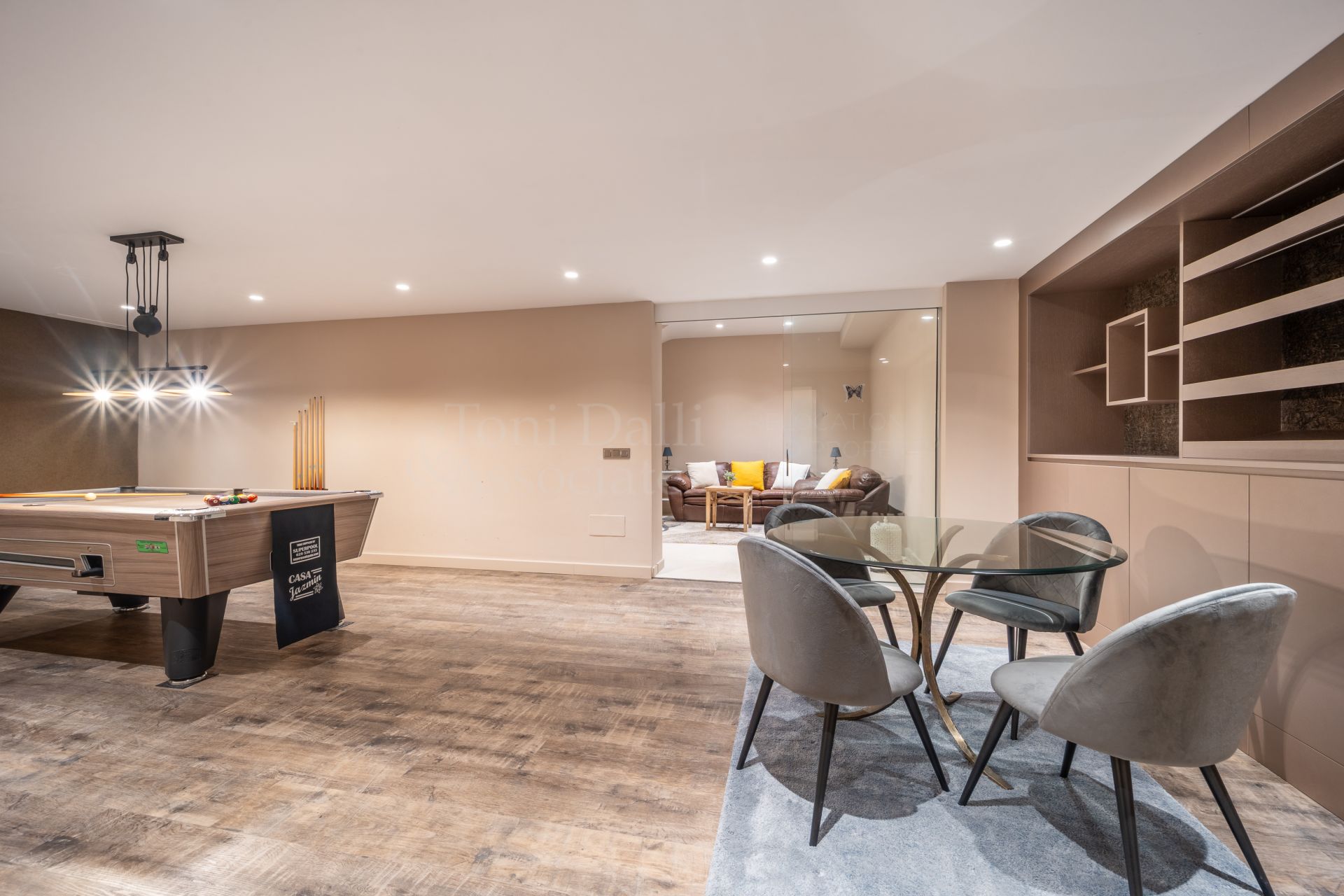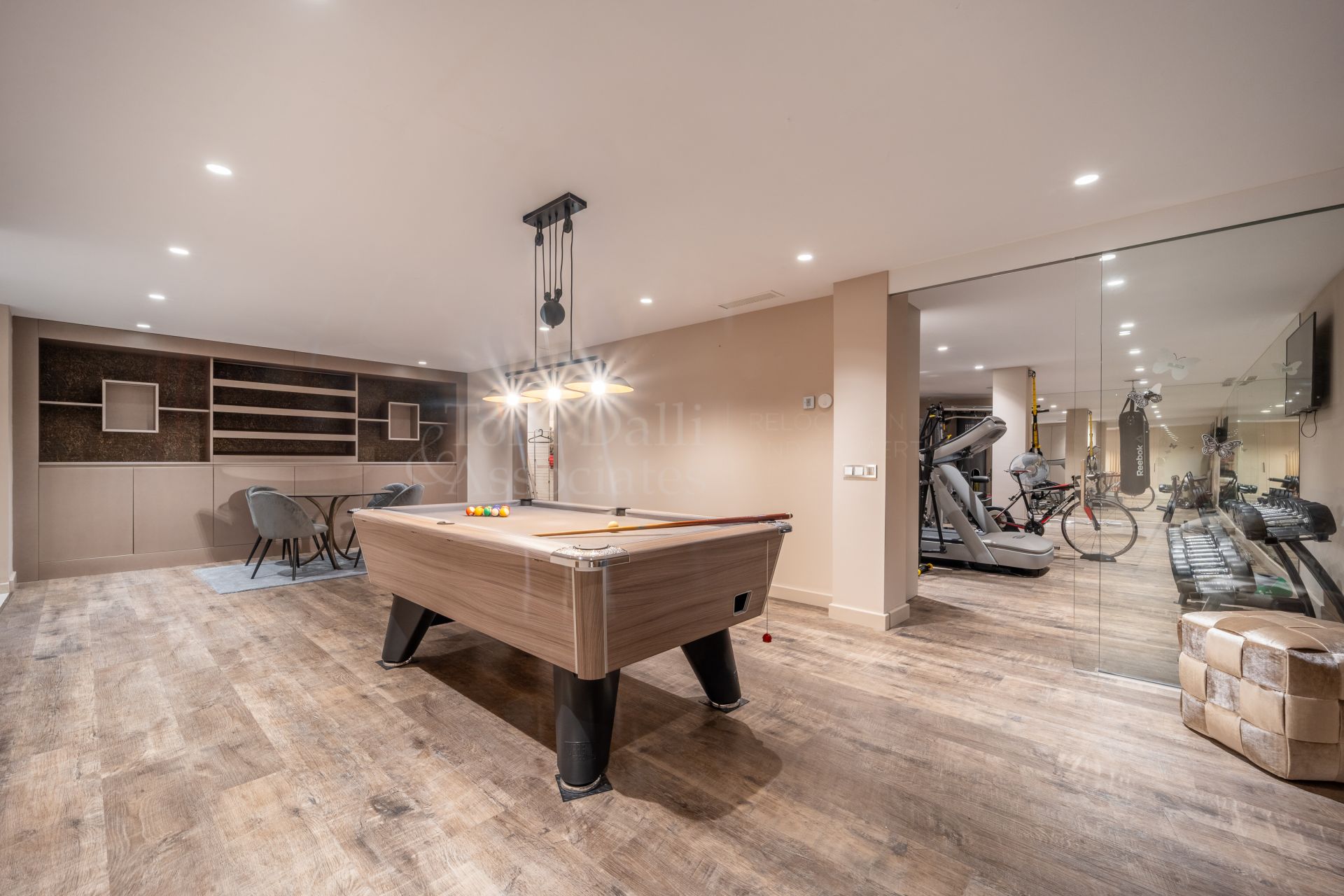 The lower floor is entirely dedicated to leisure and wellness. A games room with a billiard table and bar offers the perfect space for entertaining, while the fully equipped gym, sauna, double shower, and bathroom create a private wellness sanctuary within the home.