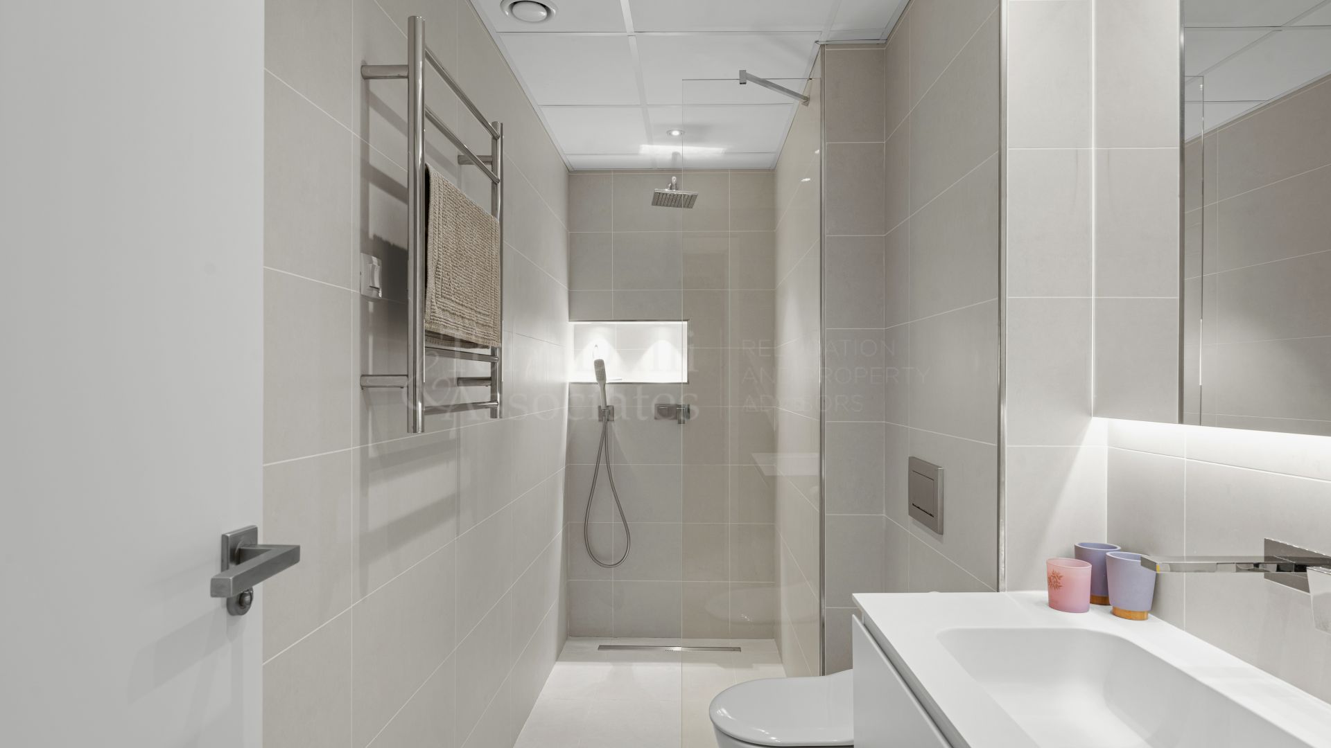 Outside, the terrace leads to a private, landscaped garden and a heated swimming pool. The garden is designed for low maintenance, with space for sun loungers, a dining table, and relaxed seating. This area works perfectly for barbecues, children playing, or quiet evenings under the Mediterranean sky. Privacy is excellent, and the setting feels calm despite being so close to the sea and town.