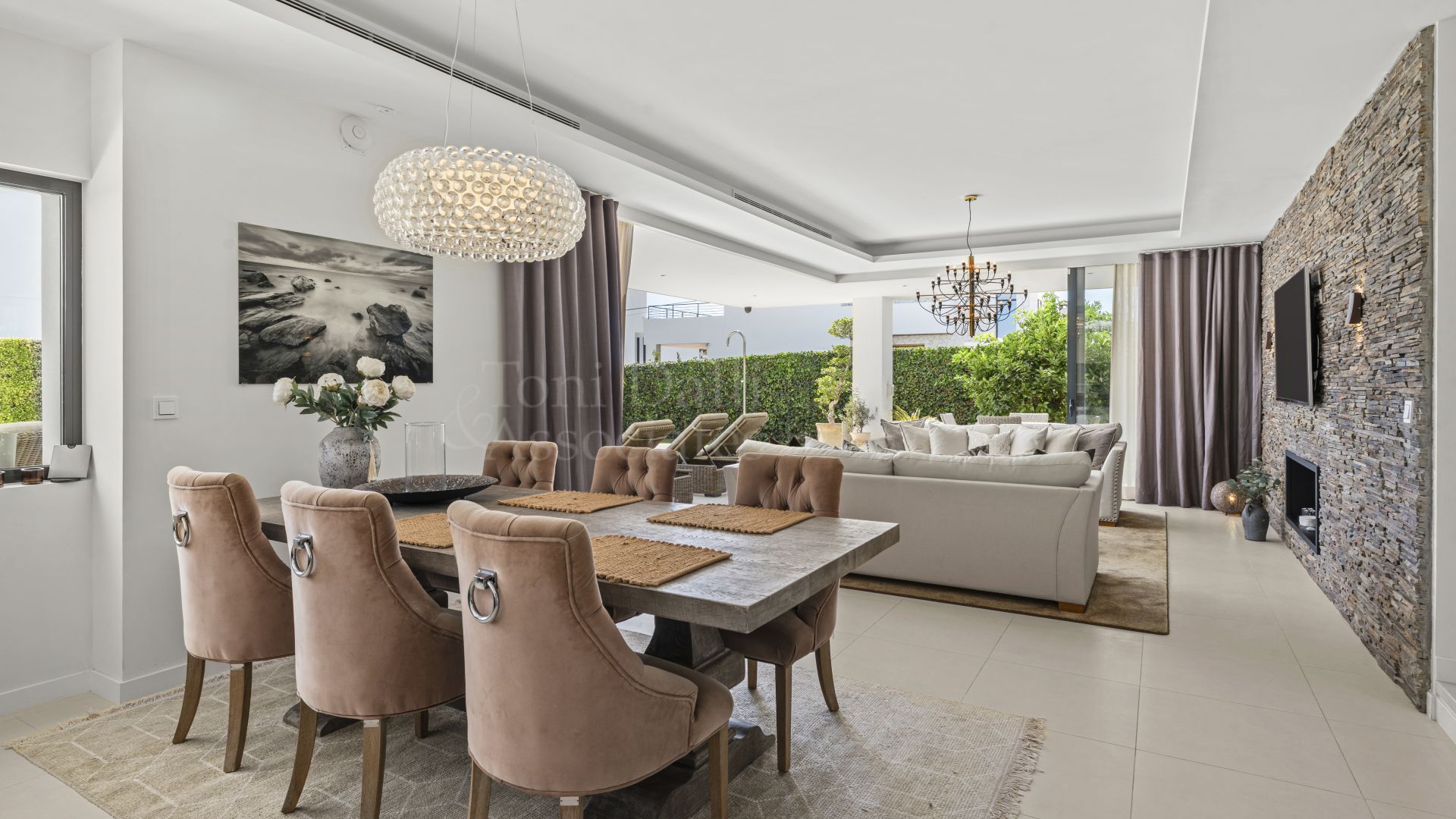 The villa is contemporary in style, with clean lines, generous windows, and high-quality finishes throughout. From the entrance, the feeling is bright and open. The main floor is arranged for easy family living and entertaining, with an open-plan lounge and dining area that connects smoothly to a modern, fully equipped kitchen. Large glass doors open onto the terrace, bringing the outside in and filling the space with natural light. The layout makes daily life simple, while still feeling special for guests.