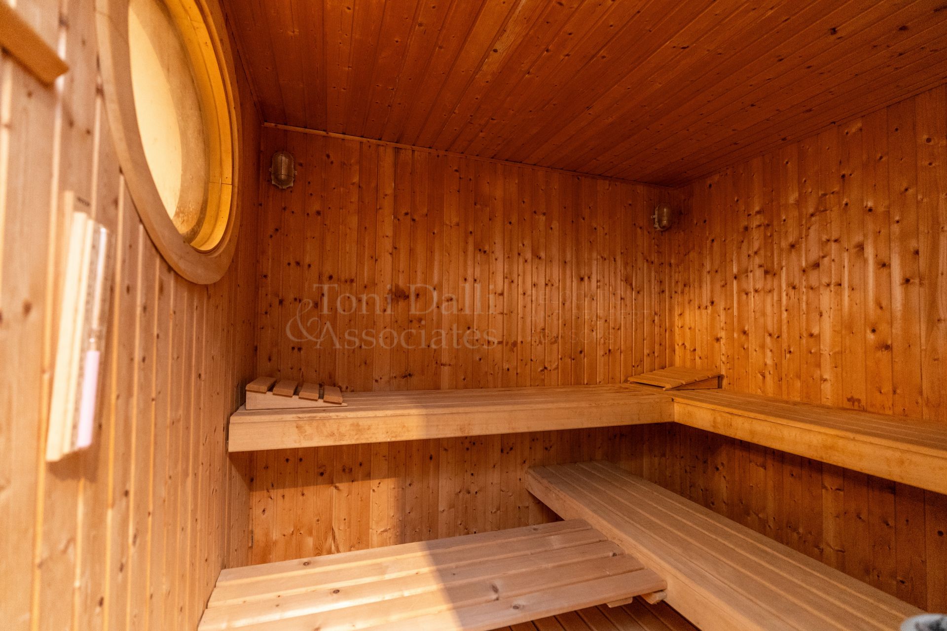 Beyond the principal living floors, a sophisticated 350-square-meter lower level elevates everyday living to resort-standard luxury: a fully equipped gymnasium and sauna deliver wellness without leaving home, while an elegant bar and lounge area provides the perfect setting for entertaining friends or unwinding after days spent exploring Marbella’s world-class offerings. Practical considerations receive equal attention—a large garage accommodates multiple vehicles with ease, ensuring convenience never compromises the property’s refined aesthetic. At the heart of the outdoor experience sits a generous swimming pool surrounded by spacious terraces designed for both sun-soaked relaxation and al fresco dining under starlit skies.
