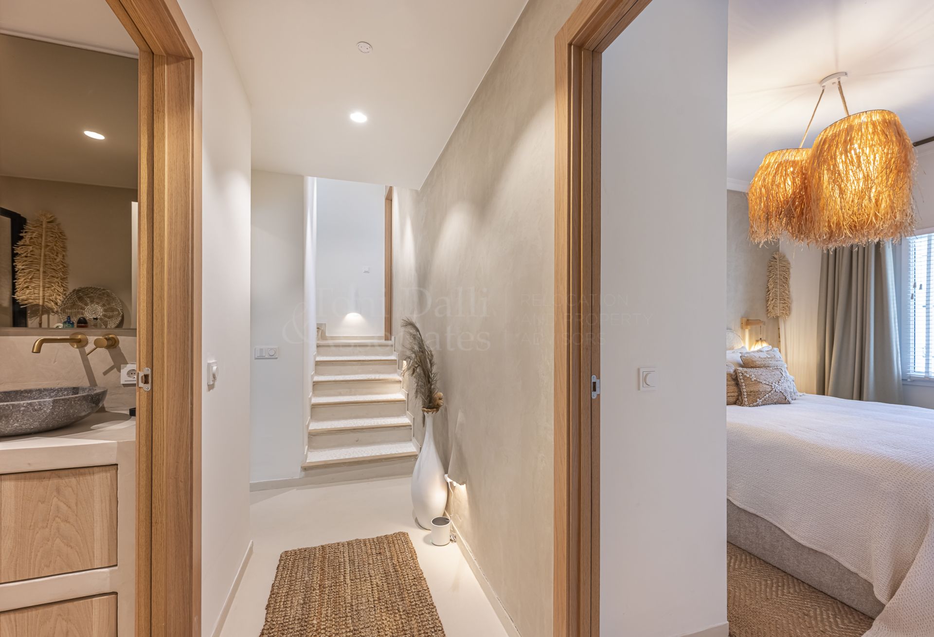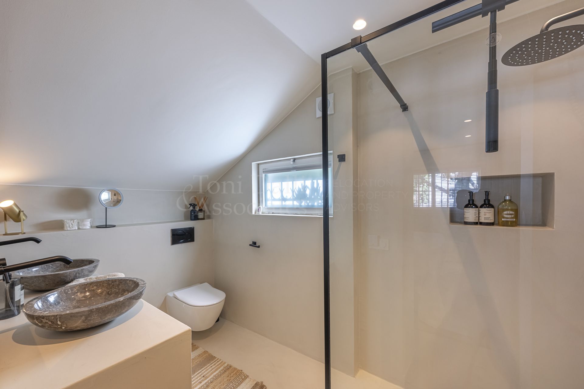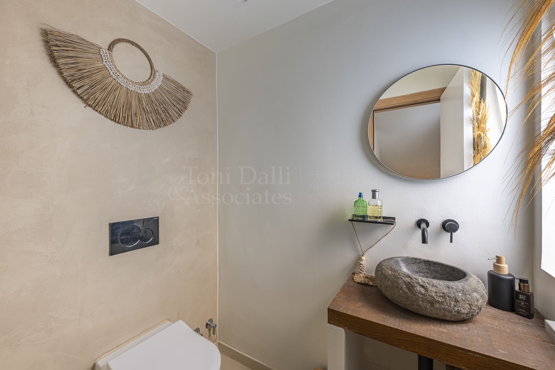 This exceptional villa, meticulously renovated by its current owners in 2023, has been transformed into a masterpiece of modern Mediterranean living. The design embraces a fresh and elegant aesthetic, harmoniously infused with Boho-Chic influences reminiscent of Ibiza’s timeless charm. Soft natural tones, warm wooden elements, handcrafted details, and high-quality ceramic finishes come together to create interiors that feel both sophisticated and effortlessly relaxed. Every space has been carefully considered to achieve a balance between functionality, comfort, and visual appeal.