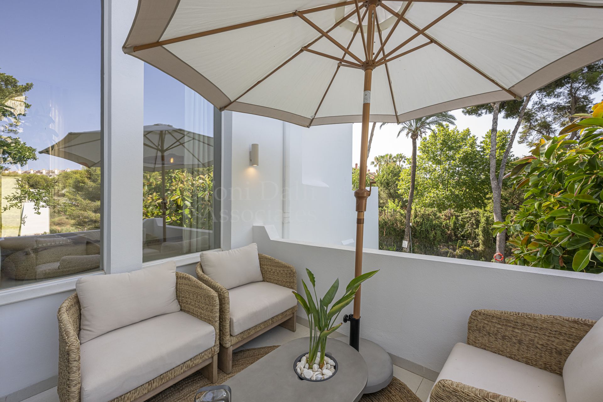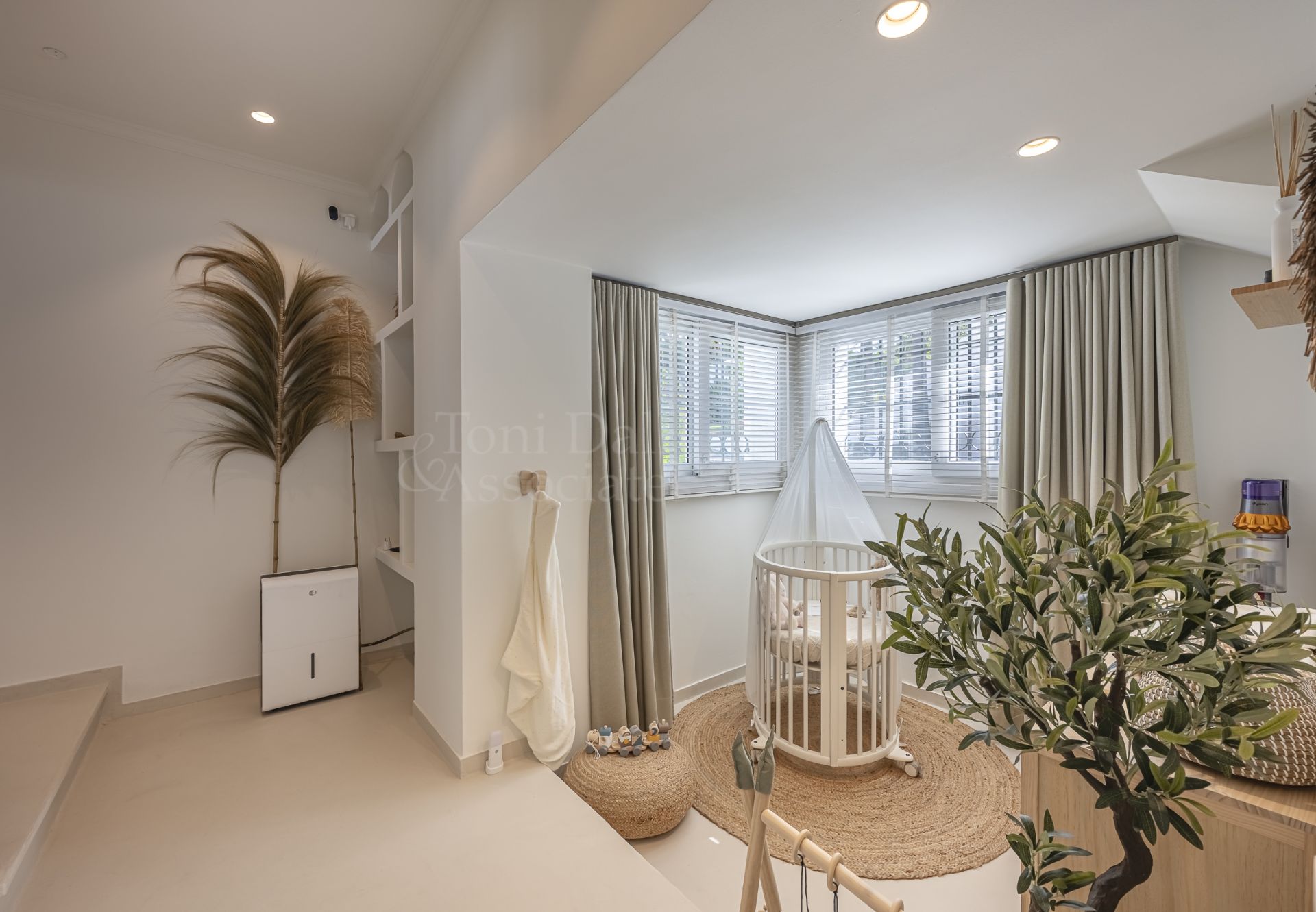 Outdoors, the property is designed as an oasis for relaxation and social gatherings. The terraces accommodate several ambiences, including a shaded dining area, a barbecue corner, and inviting chill-out spaces ideal for enjoying Marbella’s enviable year-round climate. The beautifully maintained communal garden, enhanced by mature palm trees and lush Mediterranean landscaping, creates an idyllic backdrop and features two pristine swimming pools for residents to enjoy.